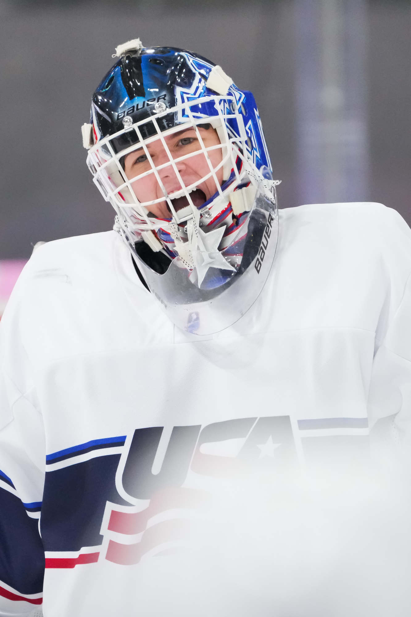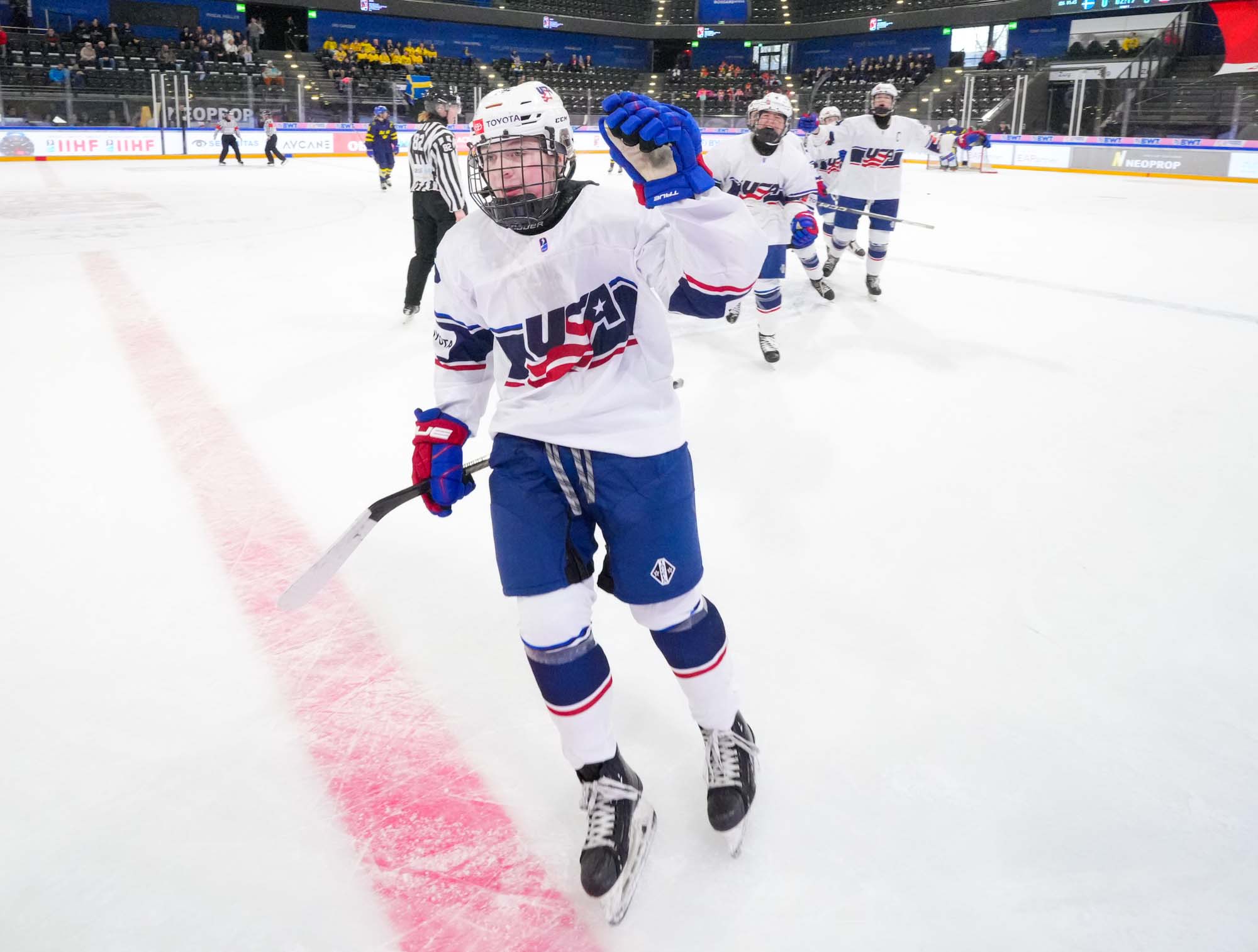 The U.S.'s Mary Derrenbacher (#13) whoops it up after giving her team a two-goal lead in a 4-0 win over Sweden at the 2024 IIHF Ice Hockey U18 Women's World Championship.
