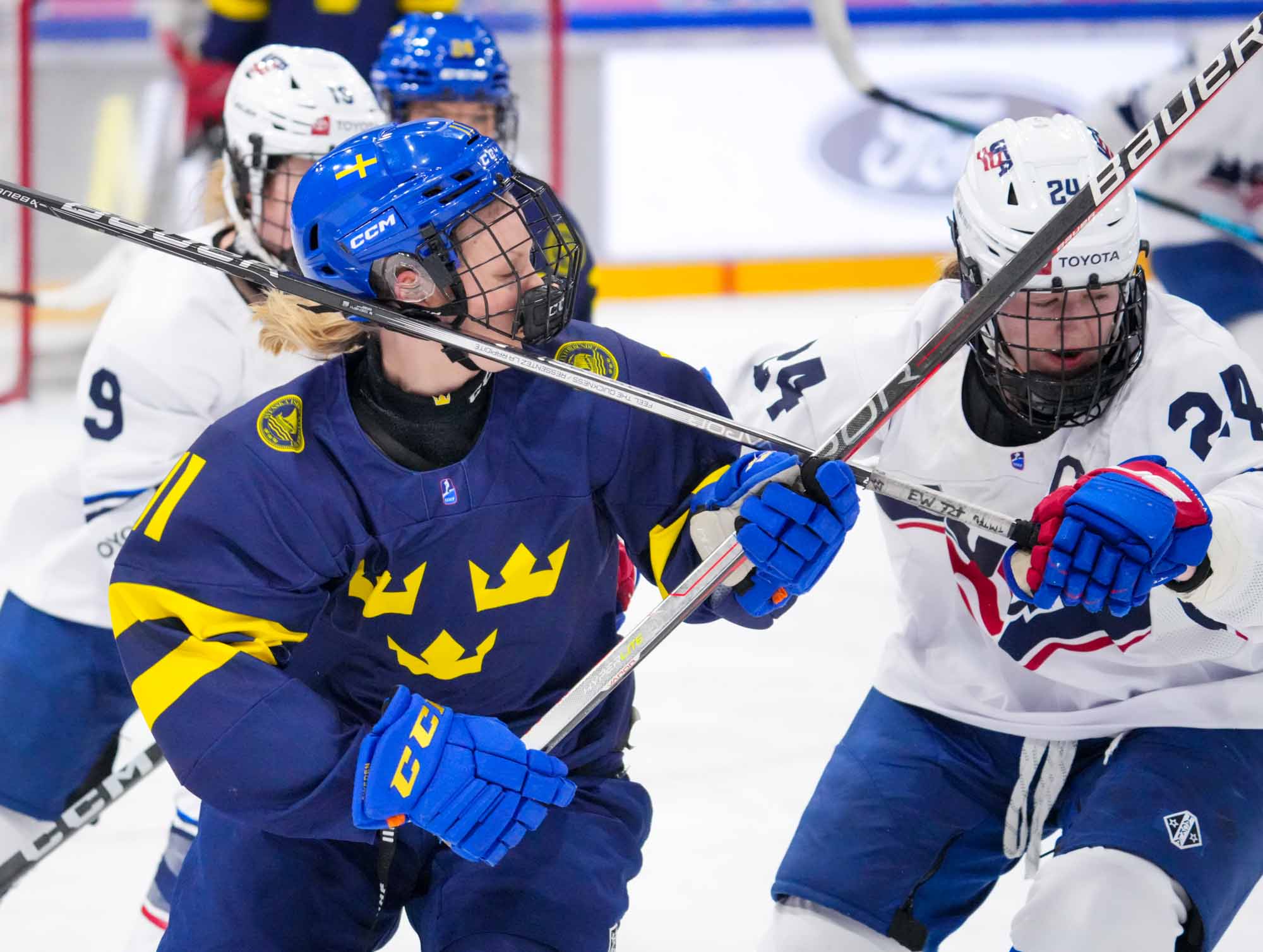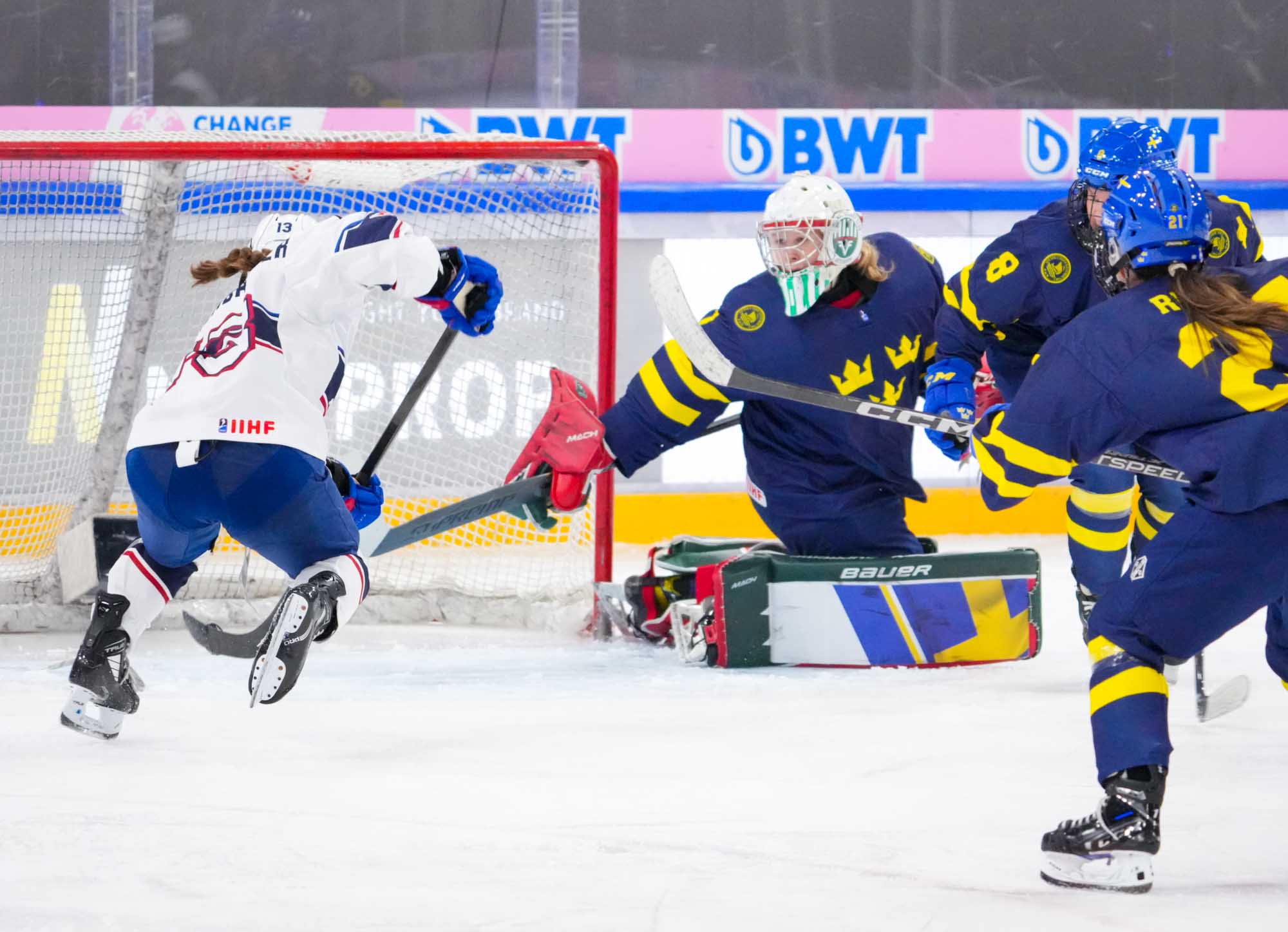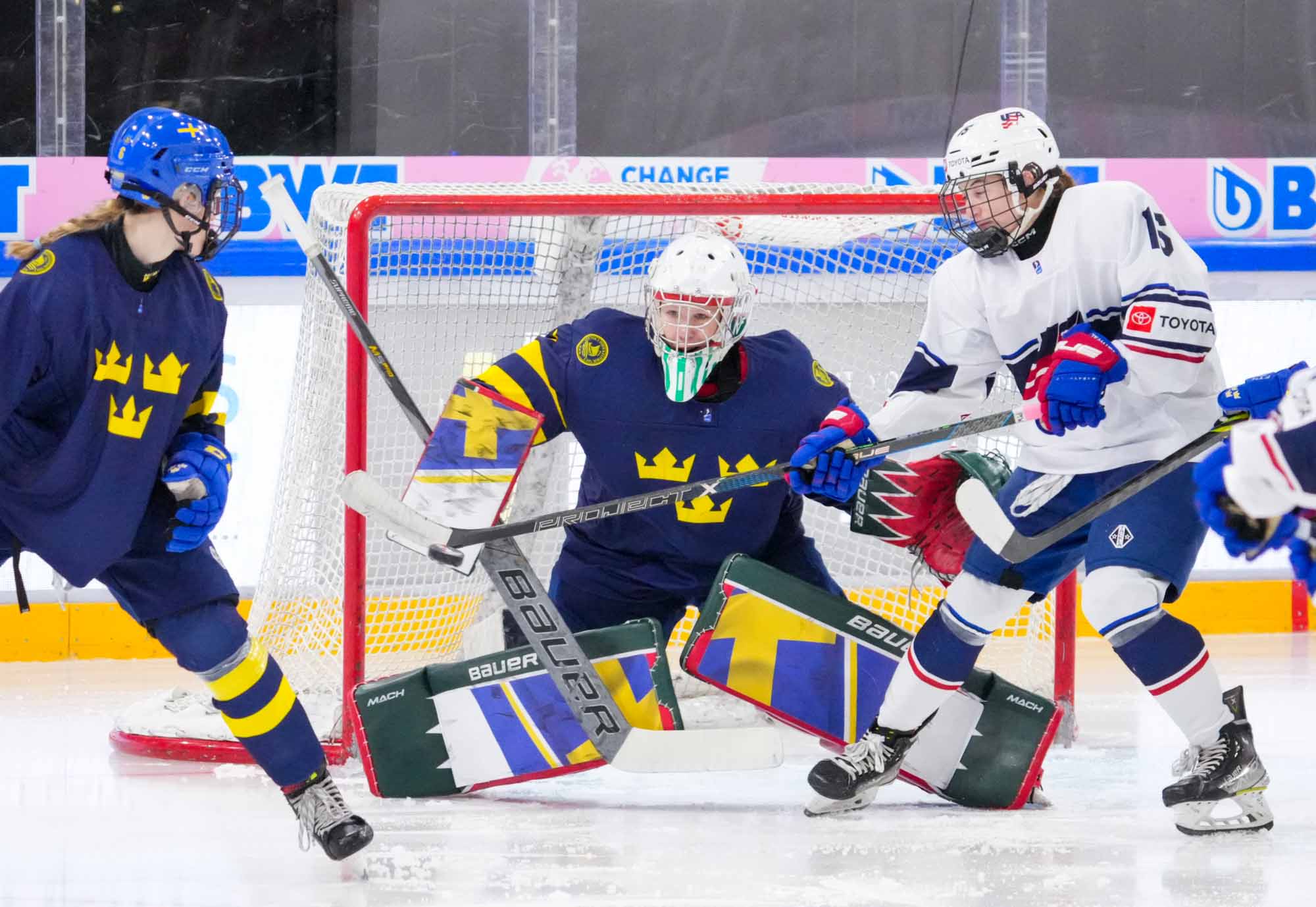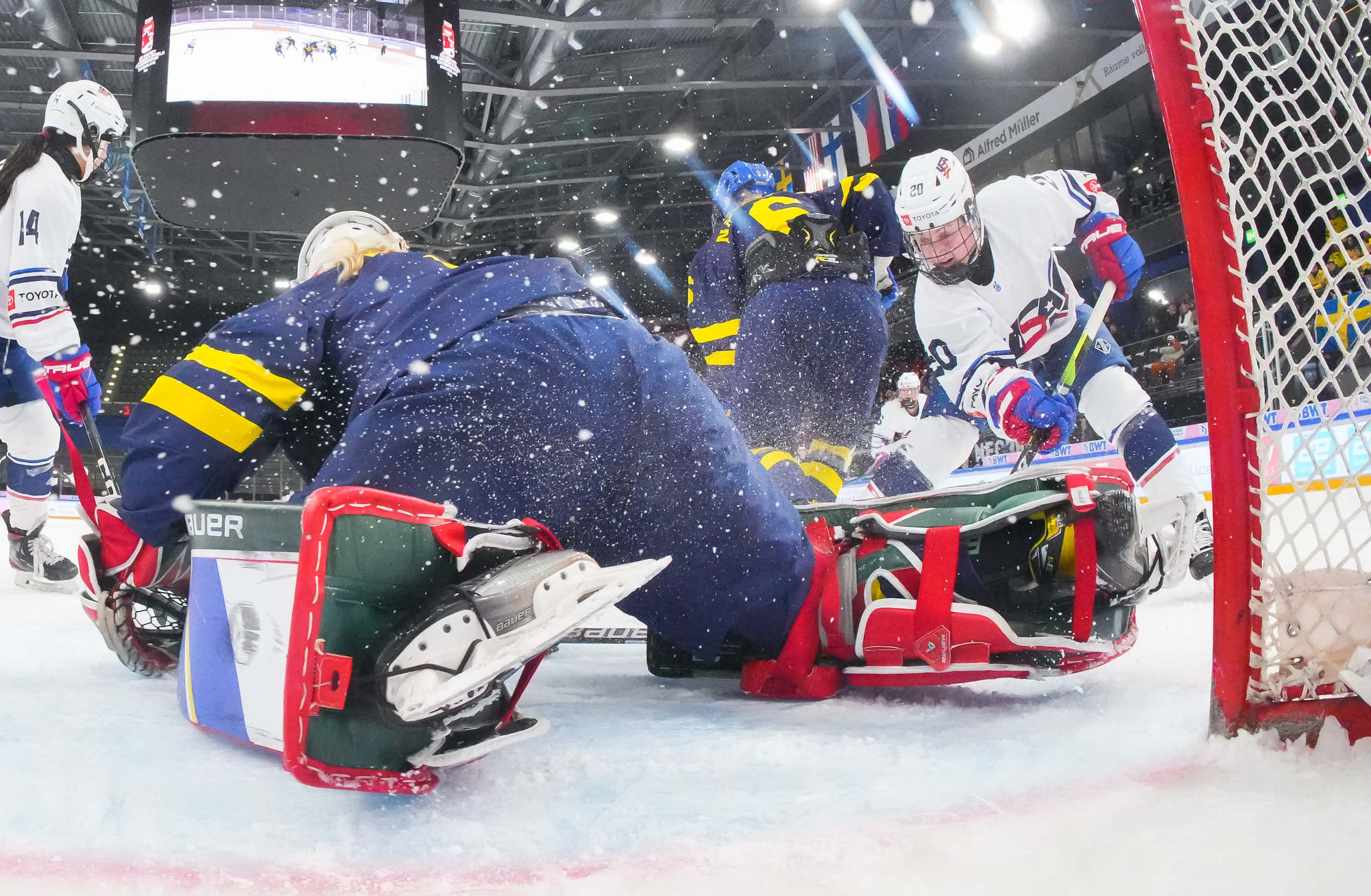 Sweden's luck didn't improve as Hilda Svensson hit the cross bar on the power play. Morgan McGathey put the U.S. up 3-0 at 15:28, jamming in a backhander during a goalmouth scrum.