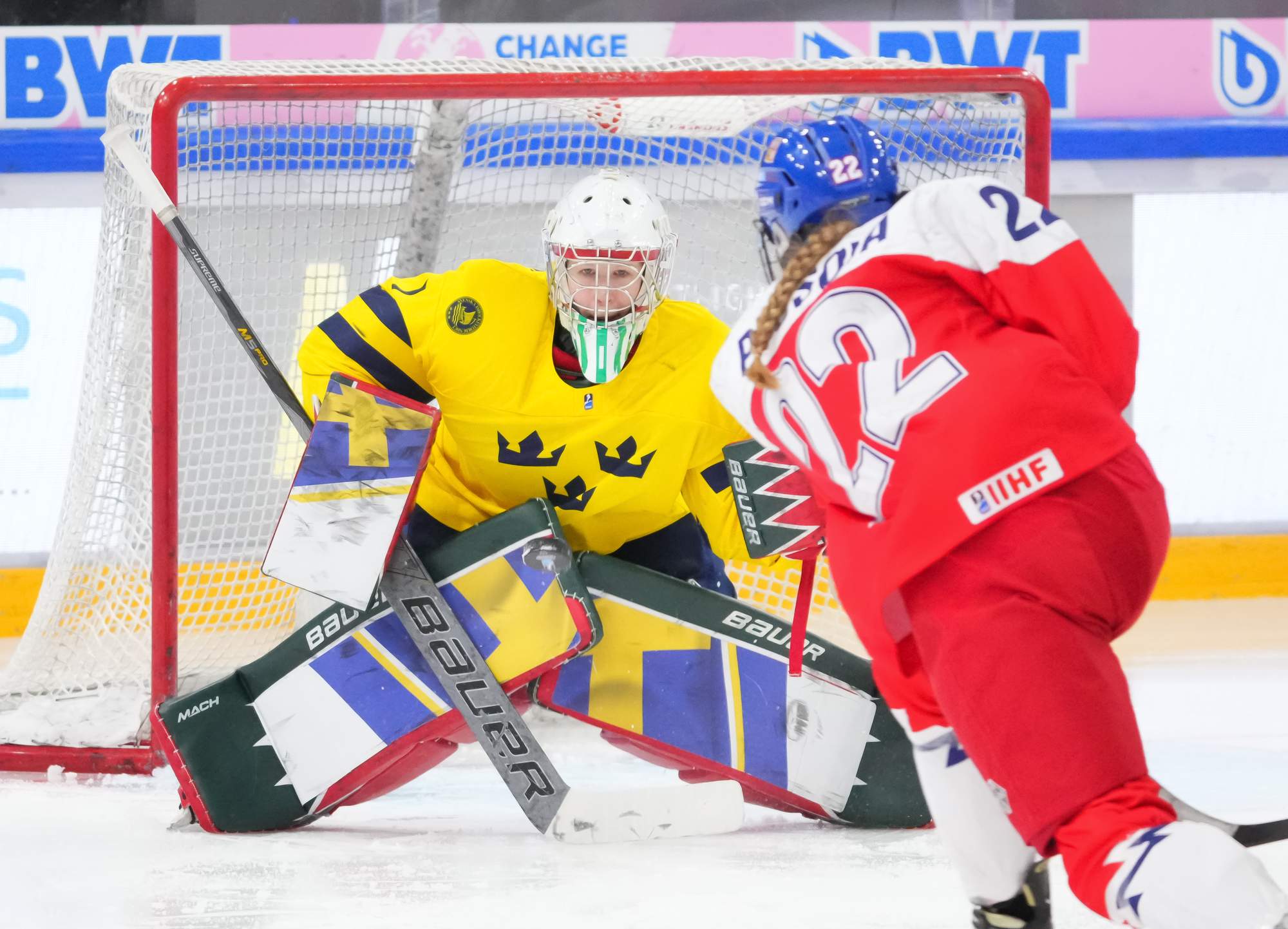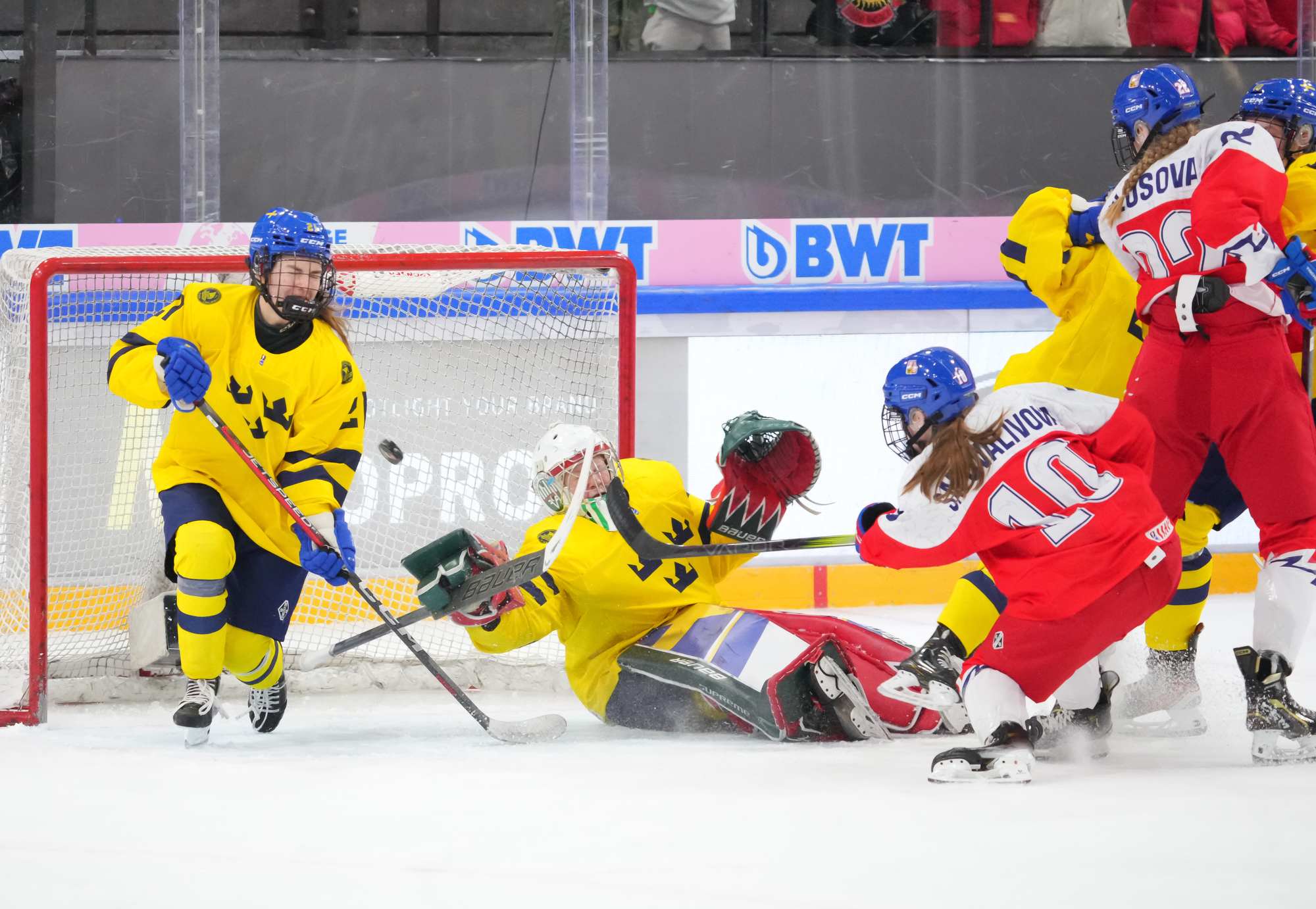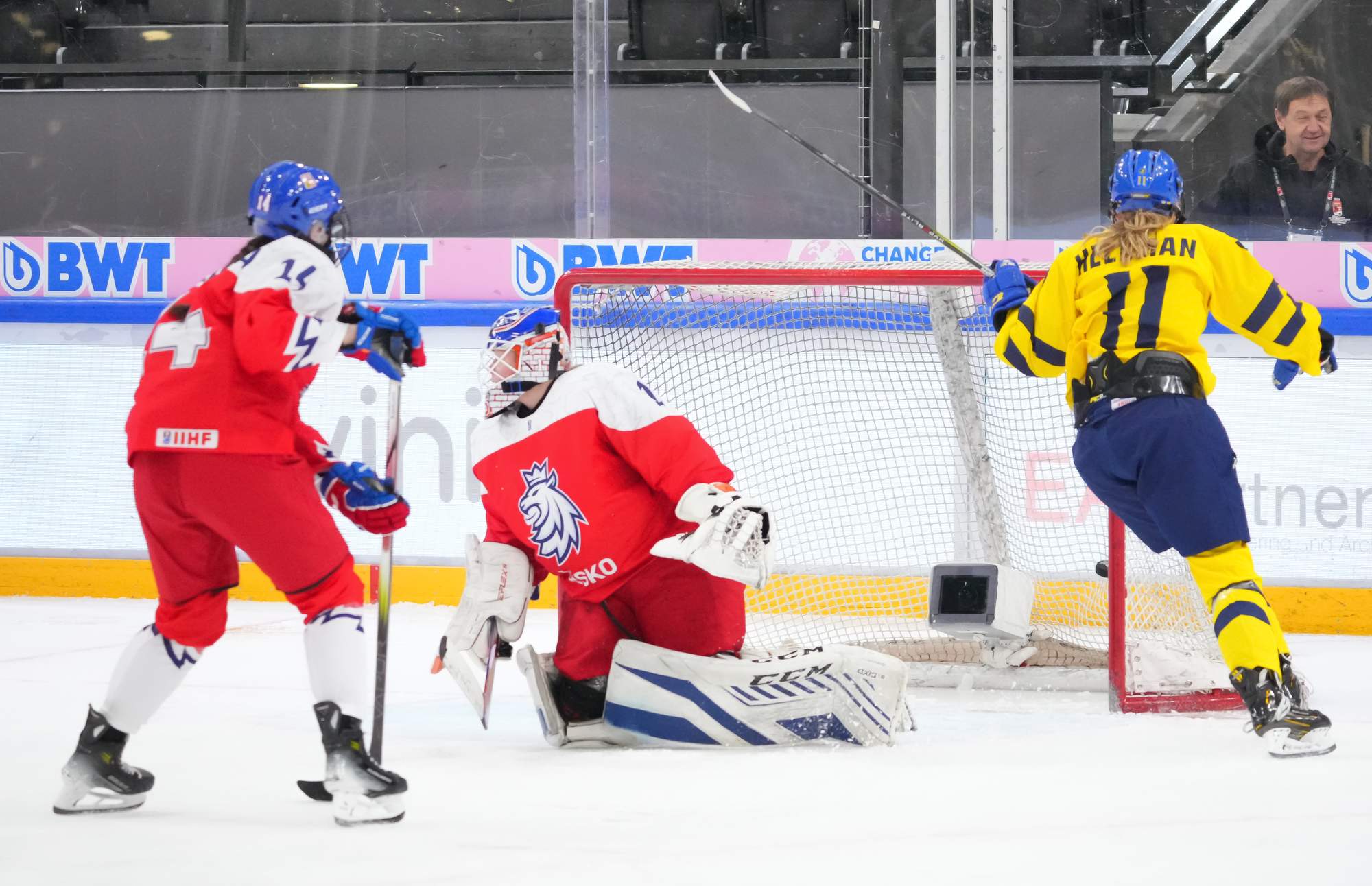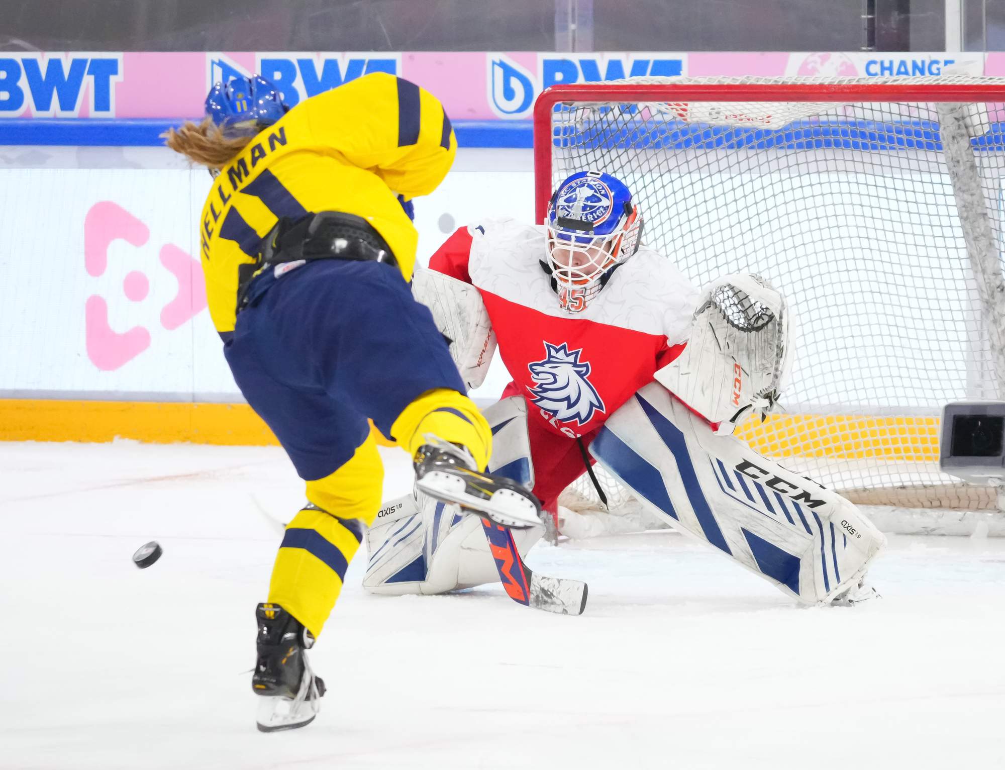 Soon after Hellman's goal the game reached a pivotal moment as Senkova made a big save to deny Sweden’s leading scorer, Hilda Svensson, from point blank range. Moments later, the Czechs regained the lead. Plosova again fed Sapovalivova and she circled into the zone before roasting her shot past Helge.