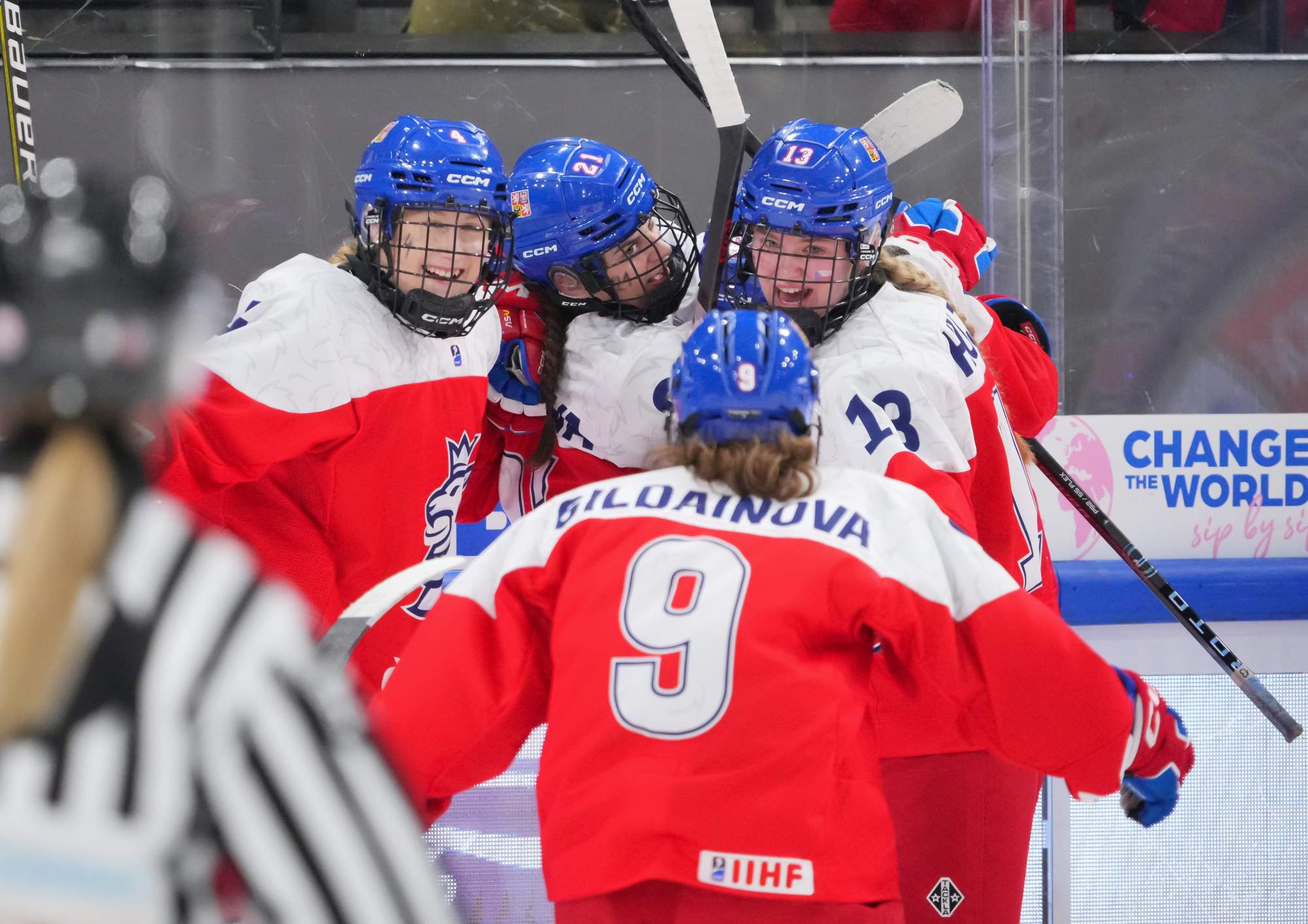 Czechia's players celebrate a goal in their Women's U18 World Championship Quarterfinal win over Sweden.