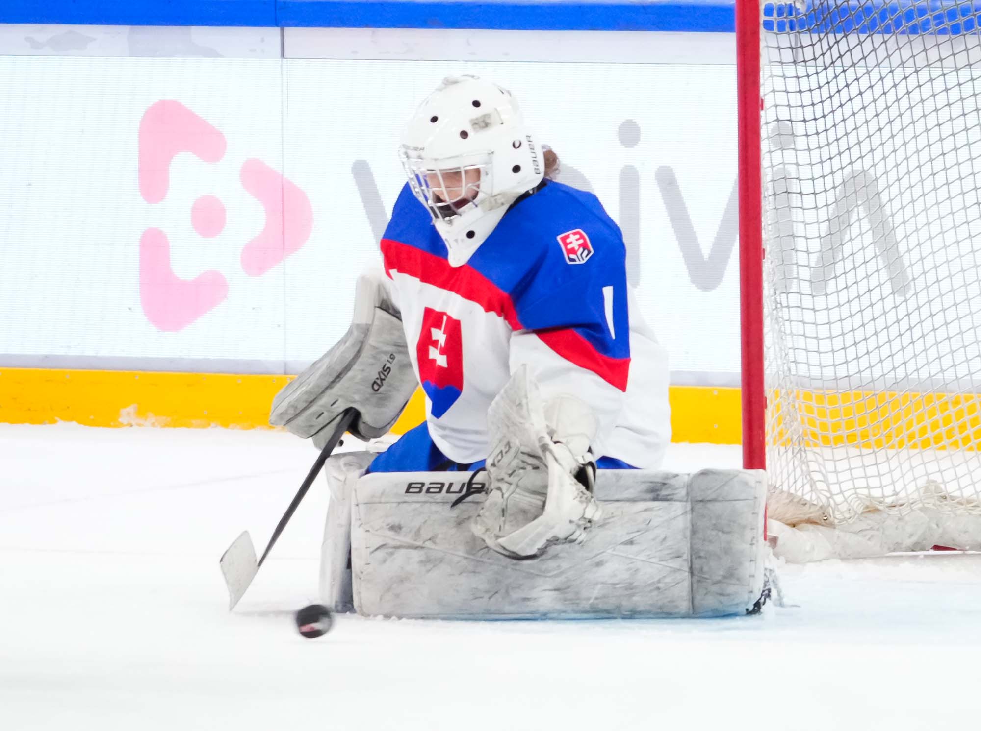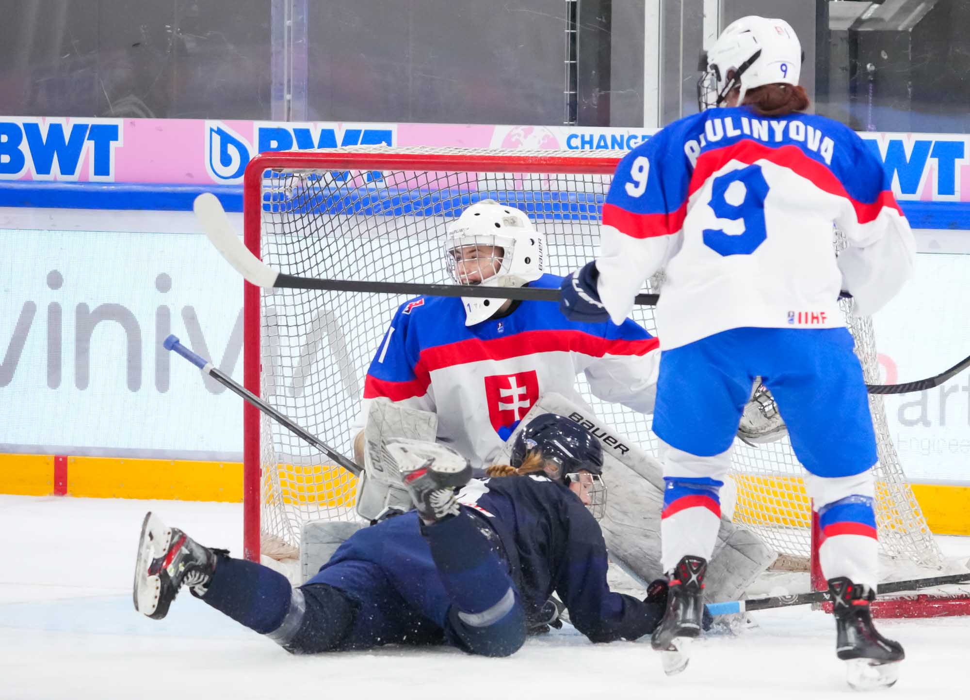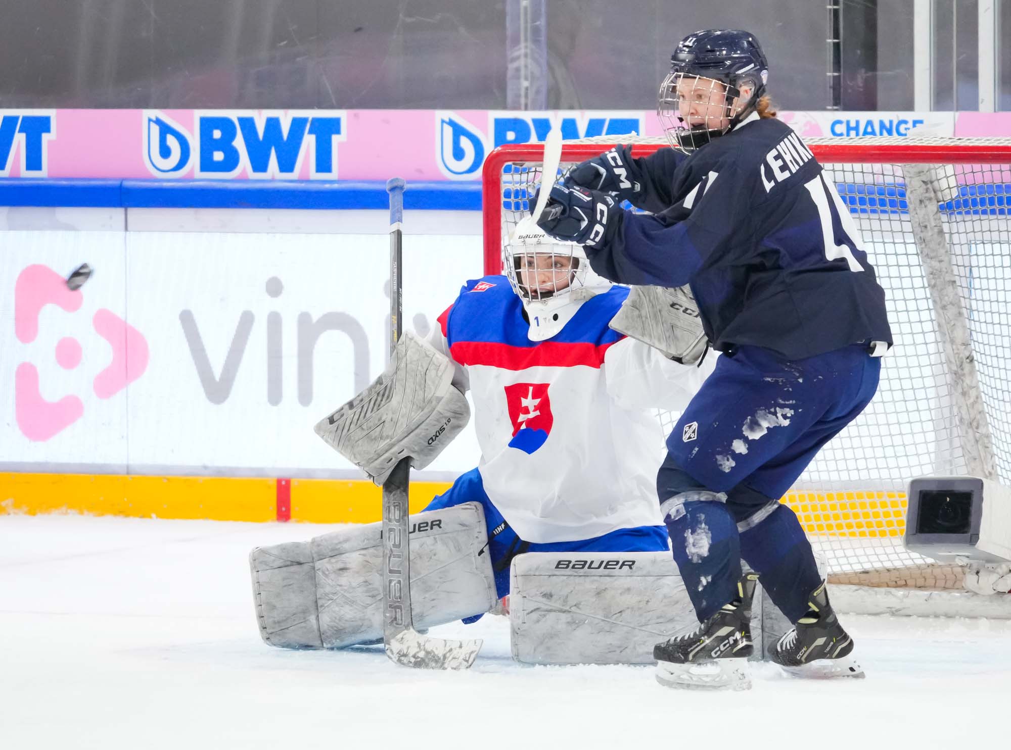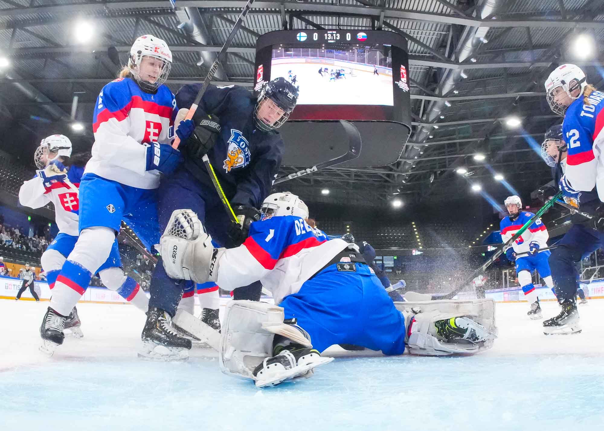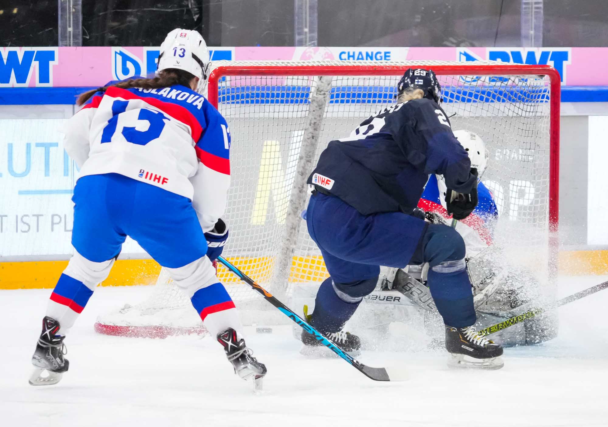 Tight checking continued in the second period as the teams traded power plays. After Finland's Heidi Holmberg took an interference minor for knocking over Lopusanova, Slovak assistant captain Michaela Paulinyova forced Kuja-Halkola to make a tough left pad stop on her redirect of a Lopusanova feed.