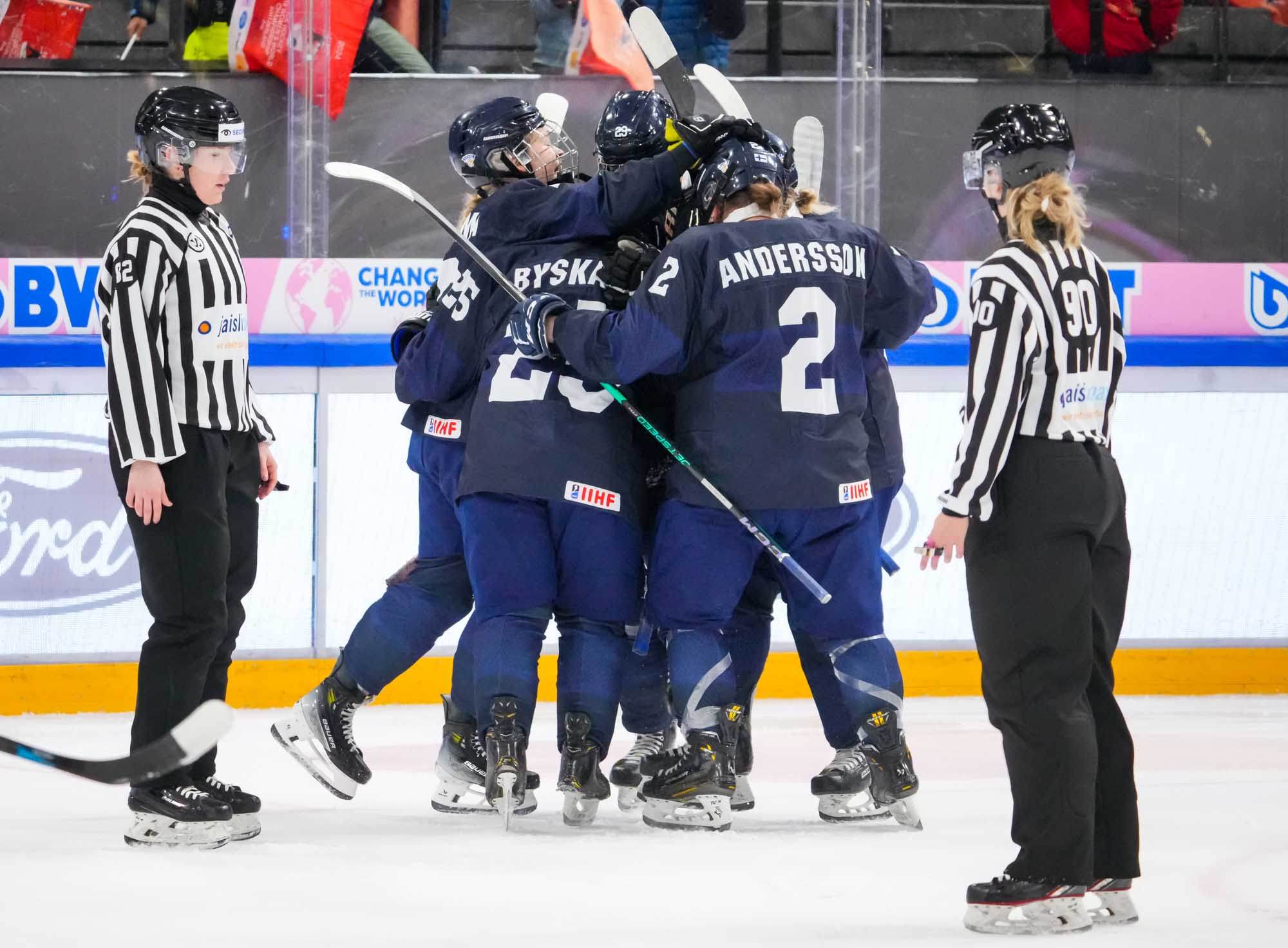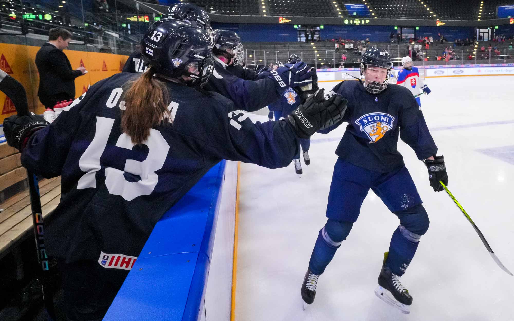 Finland's Julia Kuusisto (#29) high-fives her teammates after scoring the opening goal in a 2-0 quarter-final win over Slovakia at the 2024 U18 Women's Worlds.