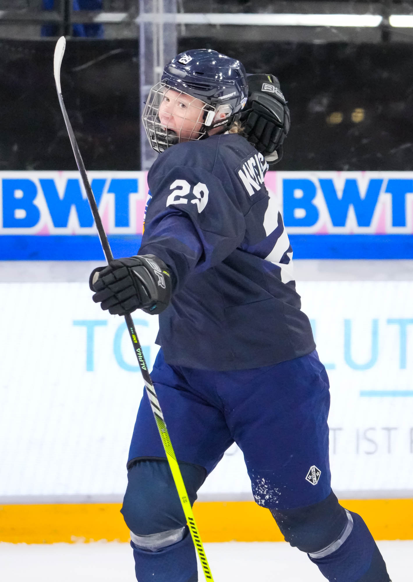 At 11:29, Kuusisto drew first blood. An onrushing Ekoluoma found her on the left side with a cross-ice pass, and the Ilves Tampere forward cut in to deposit a backhander past Debanarova. Kuusisto, who has three assists, punched the air in jubilation after scoring her first goal of the tournament.