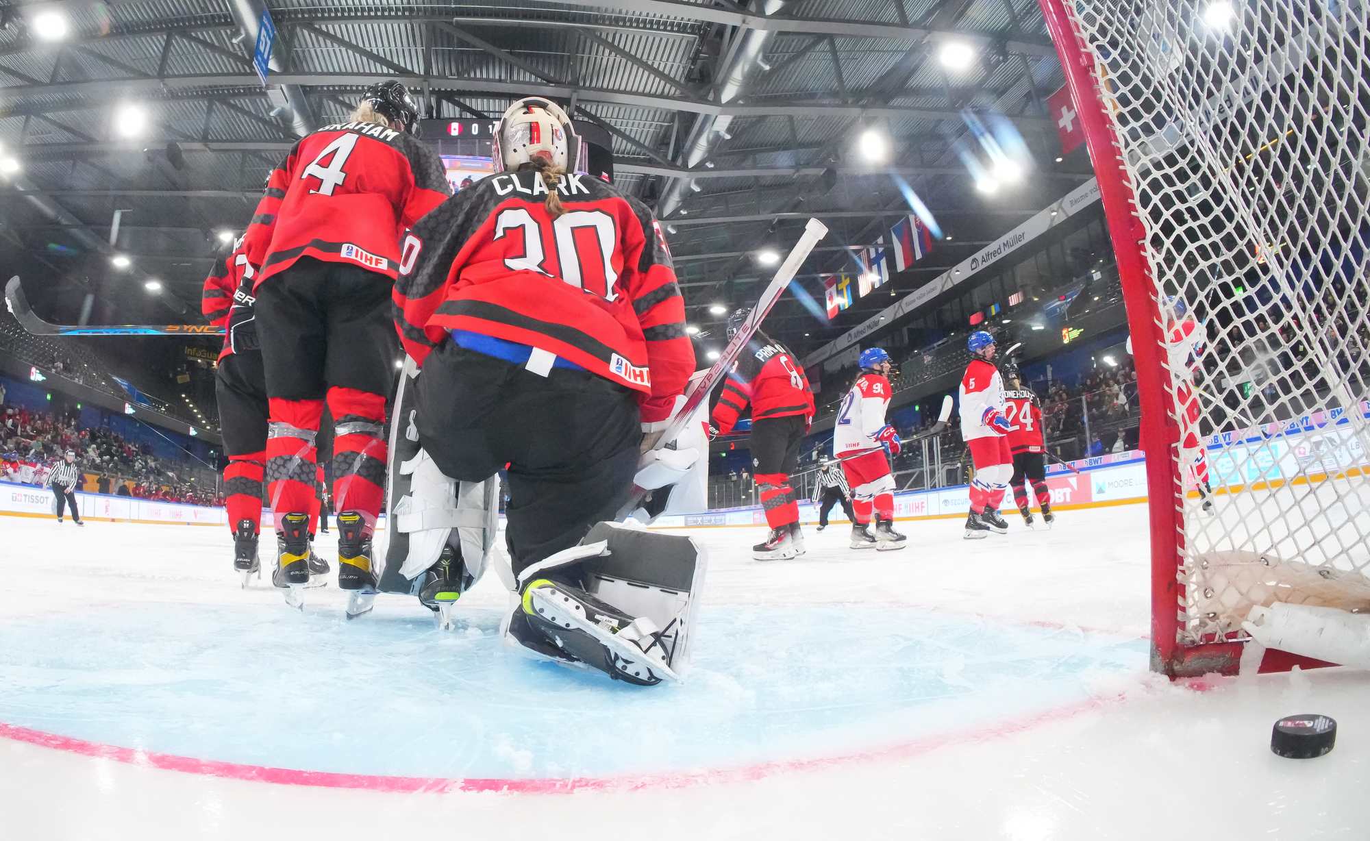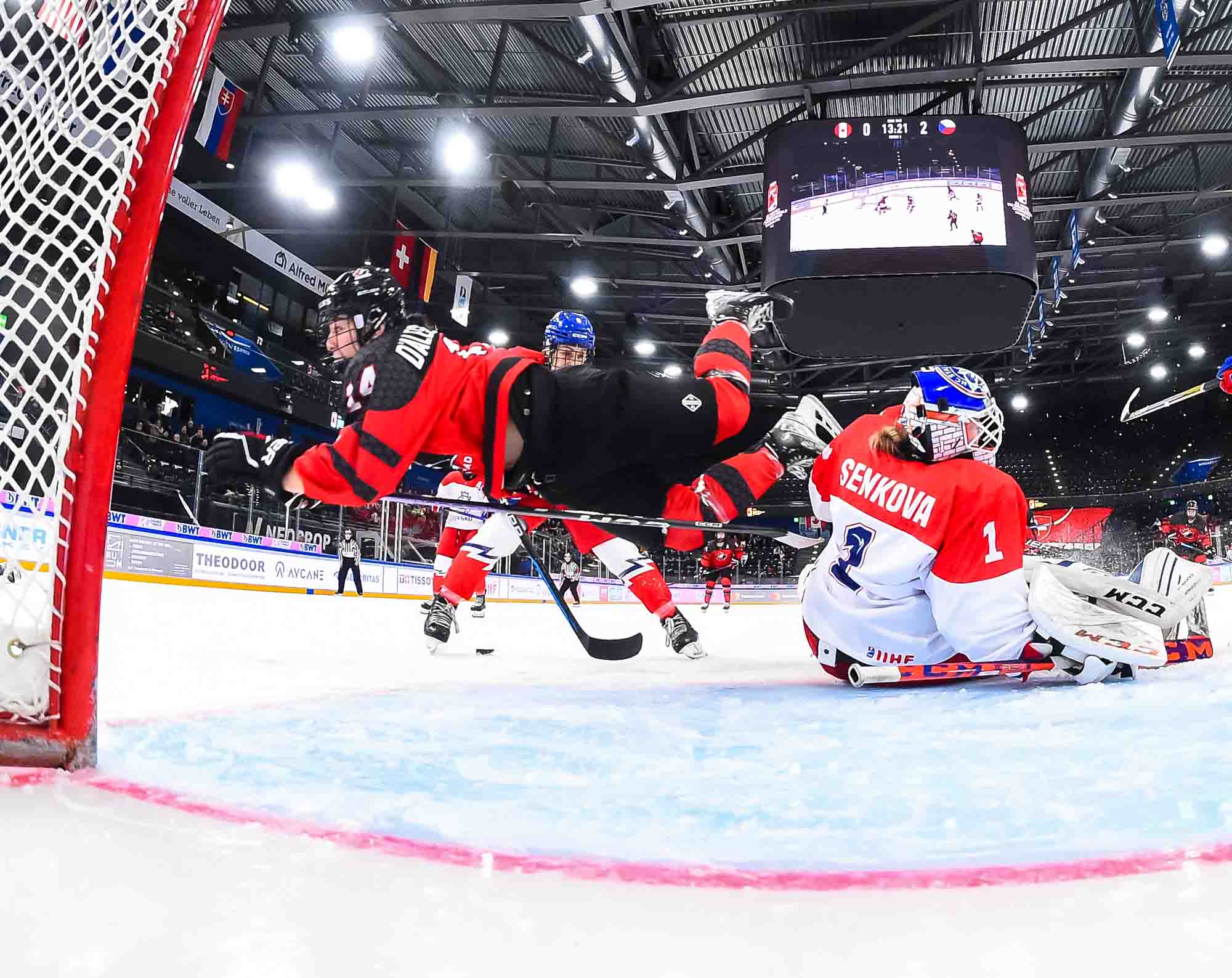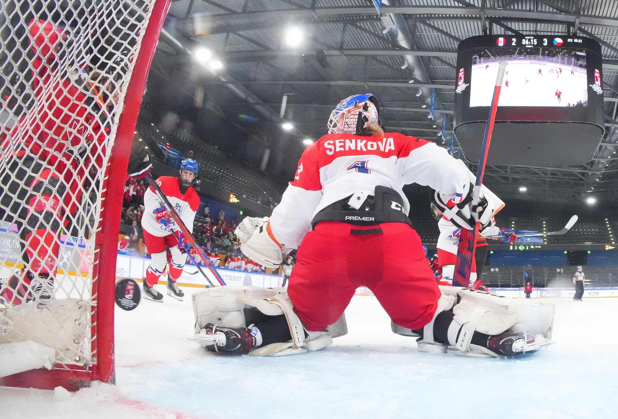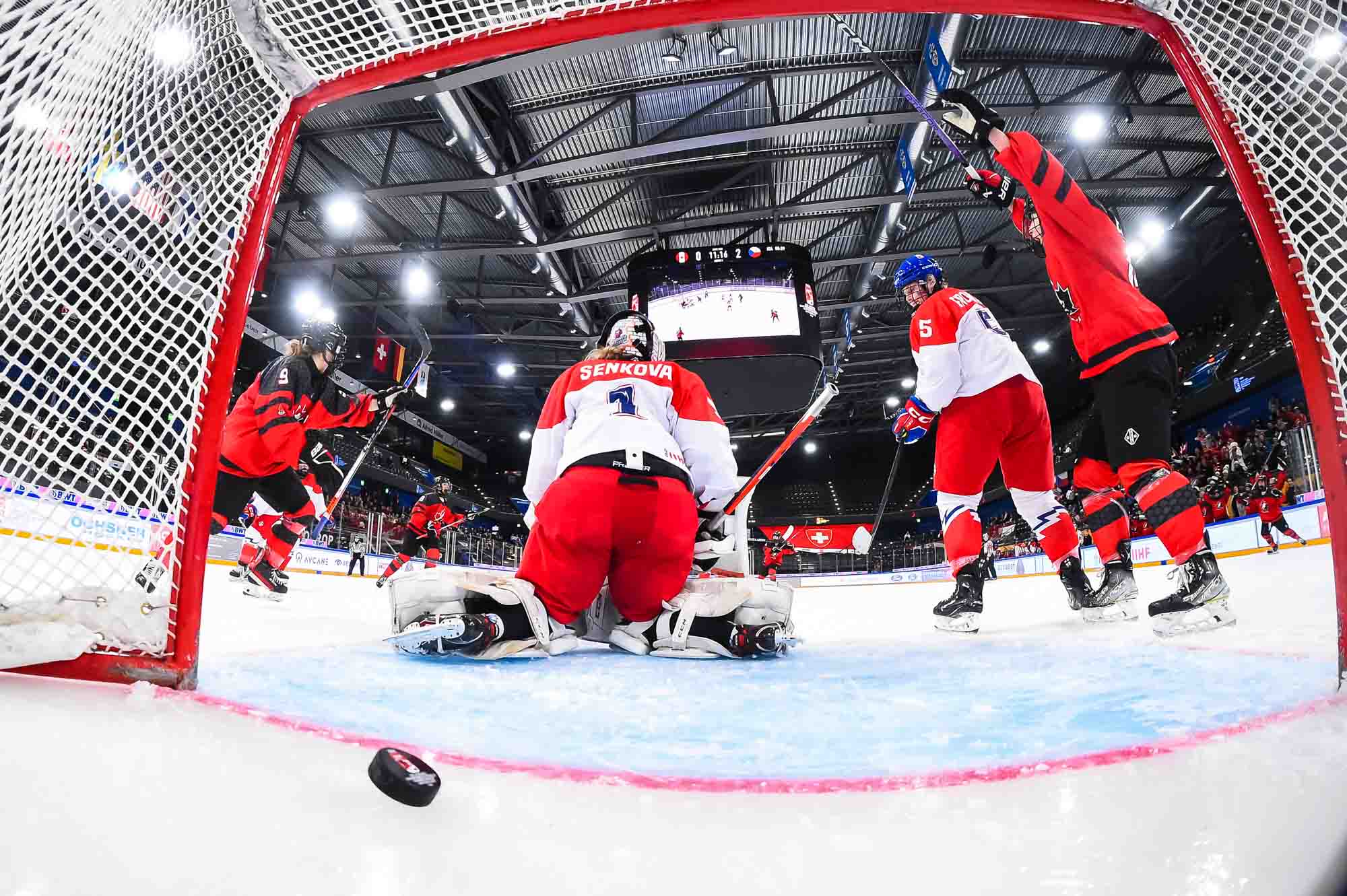 In the early going, the Czechs countered Canada’s speed and strength with close checking. Twice Senkova stood tall to deny Stonehouse. At the other end, Canadian starting goalie Hannah Clark’s mask popped off when she collided with Sapovalivova in a race for the puck in the left faceoff circle.