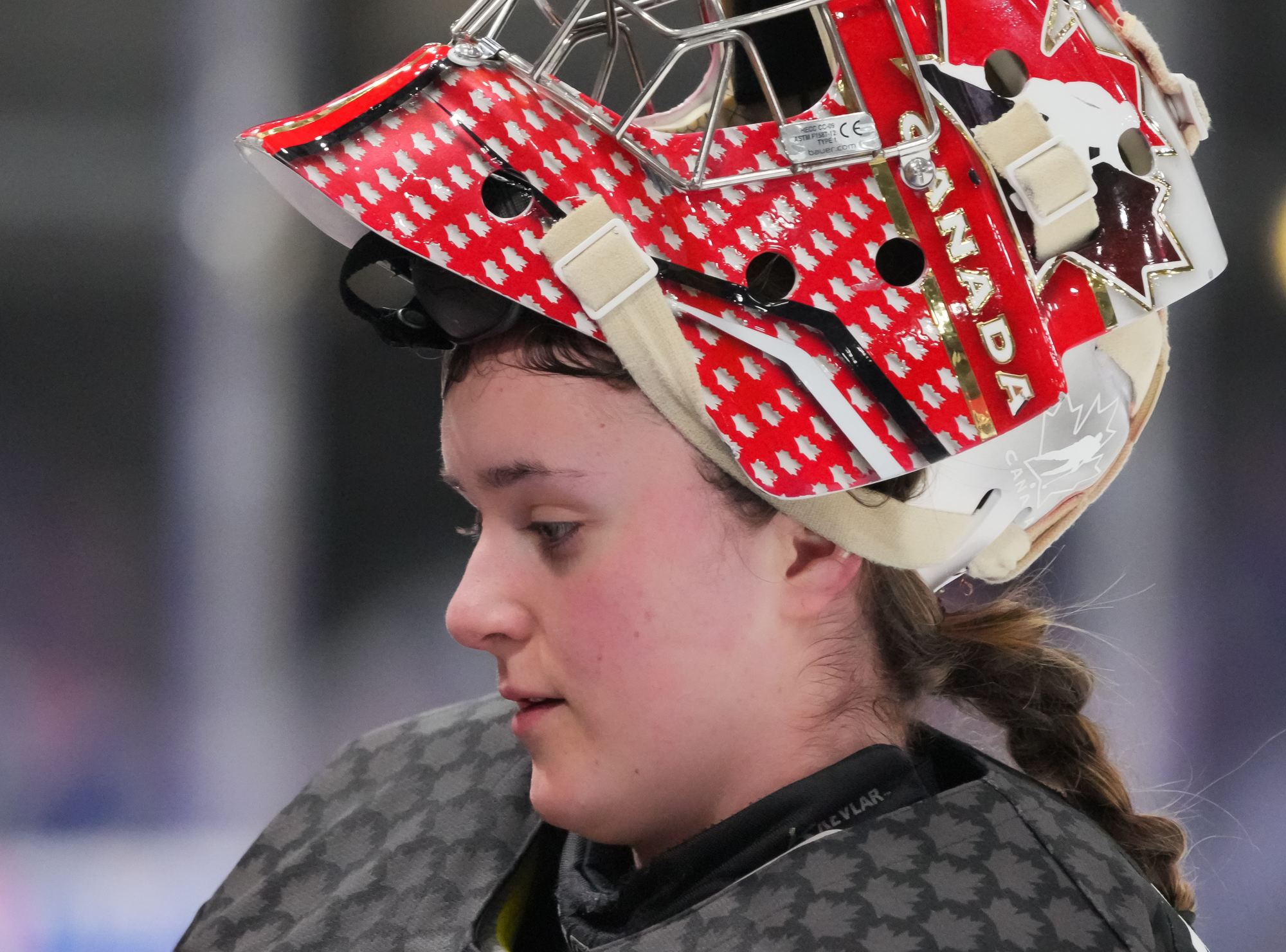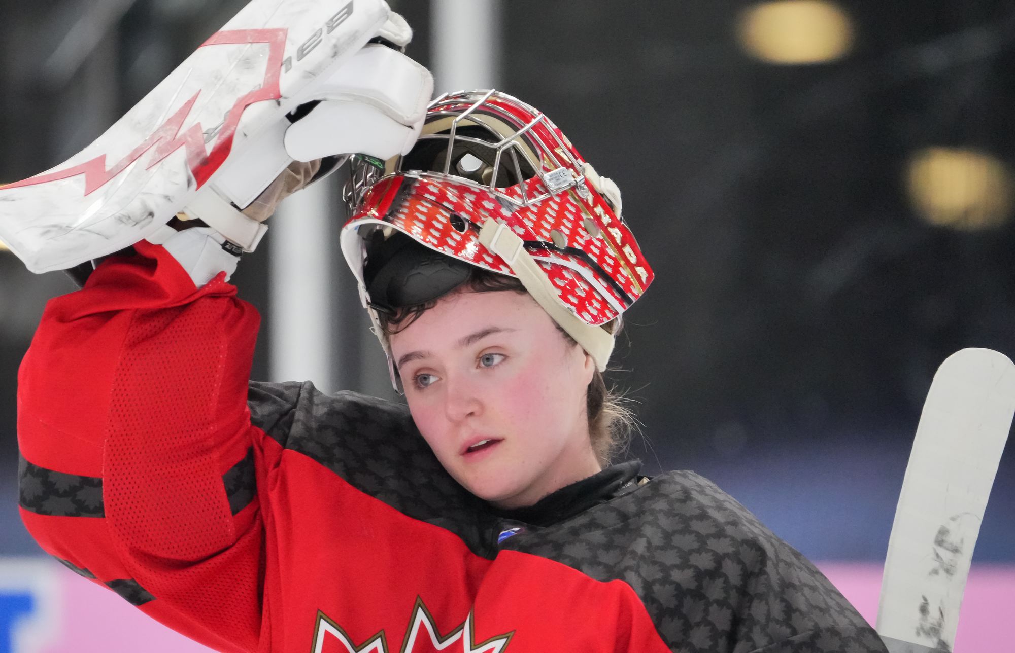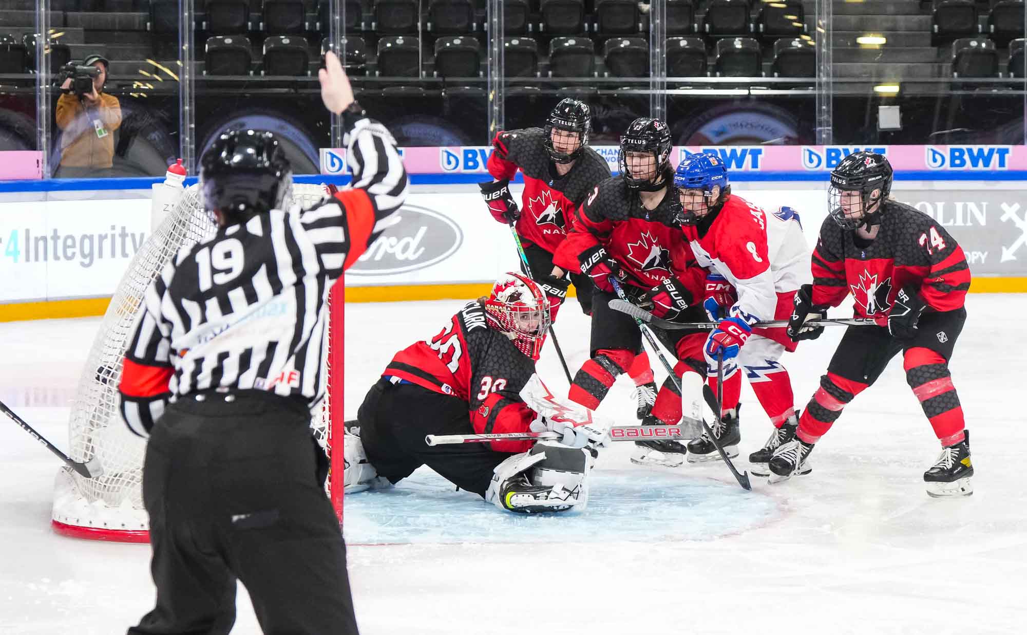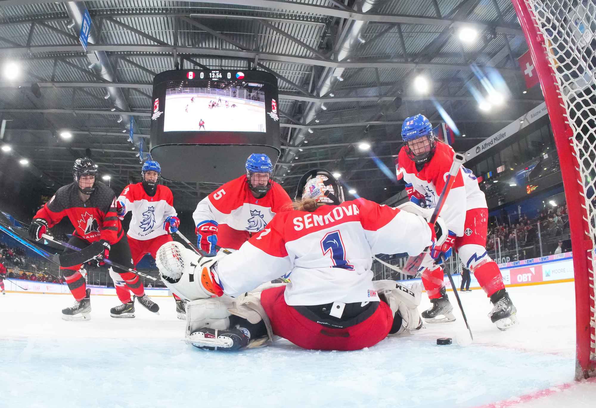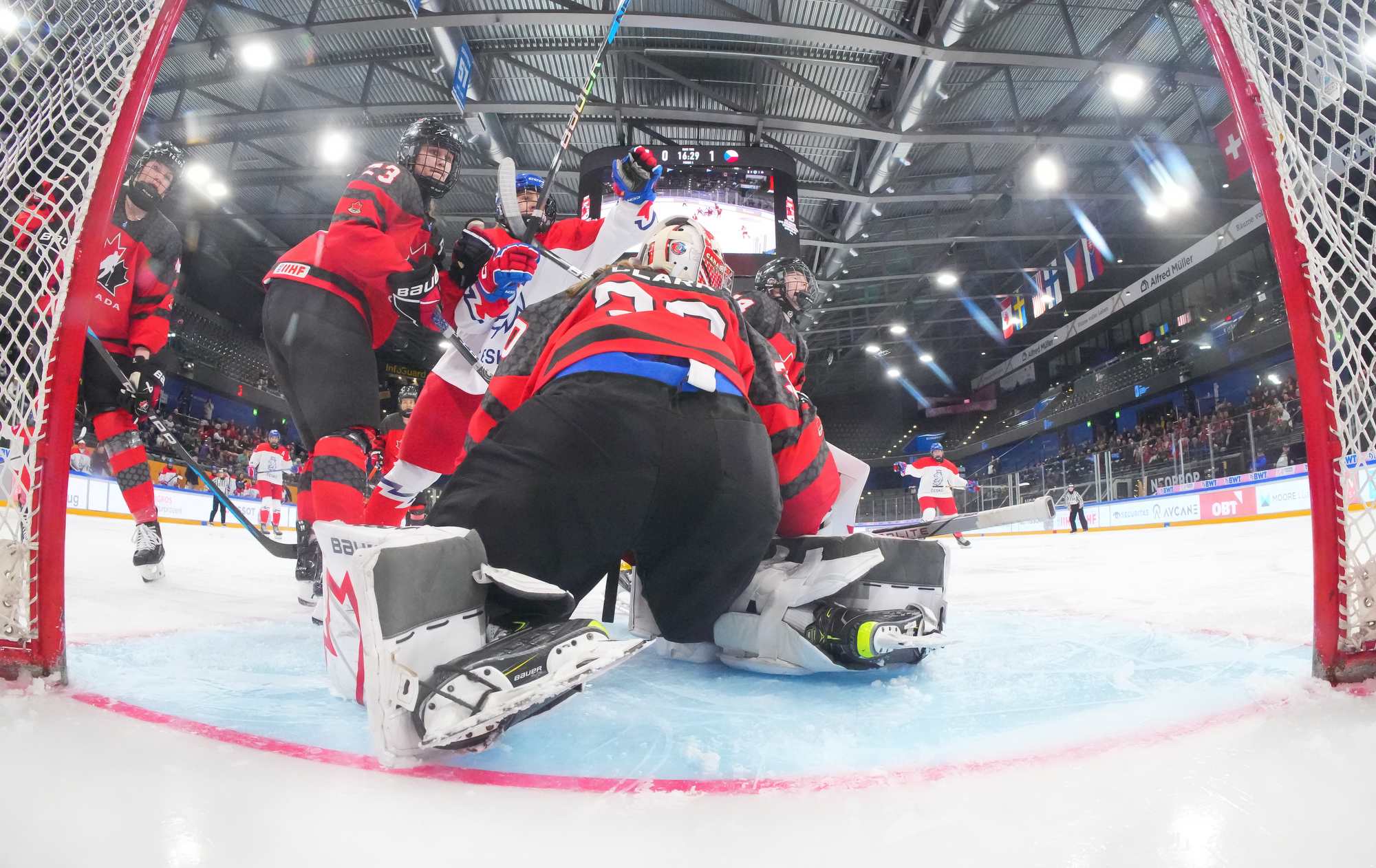 In the early going, the Czechs countered Canada’s speed and strength with close checking. Twice Senkova stood tall to deny Stonehouse. At the other end, Canadian starting goalie Hannah Clark’s mask popped off when she collided with Sapovalivova in a race for the puck in the left faceoff circle.