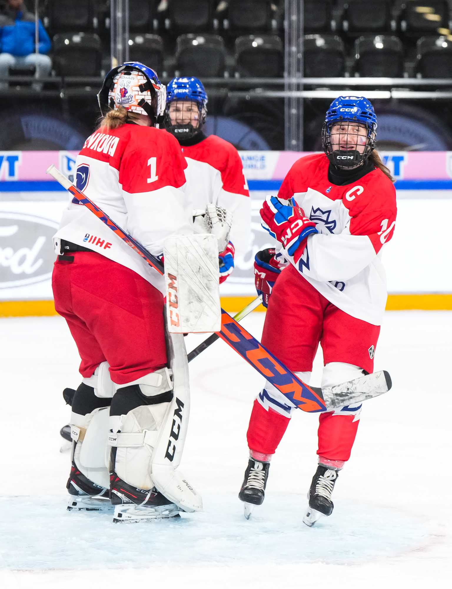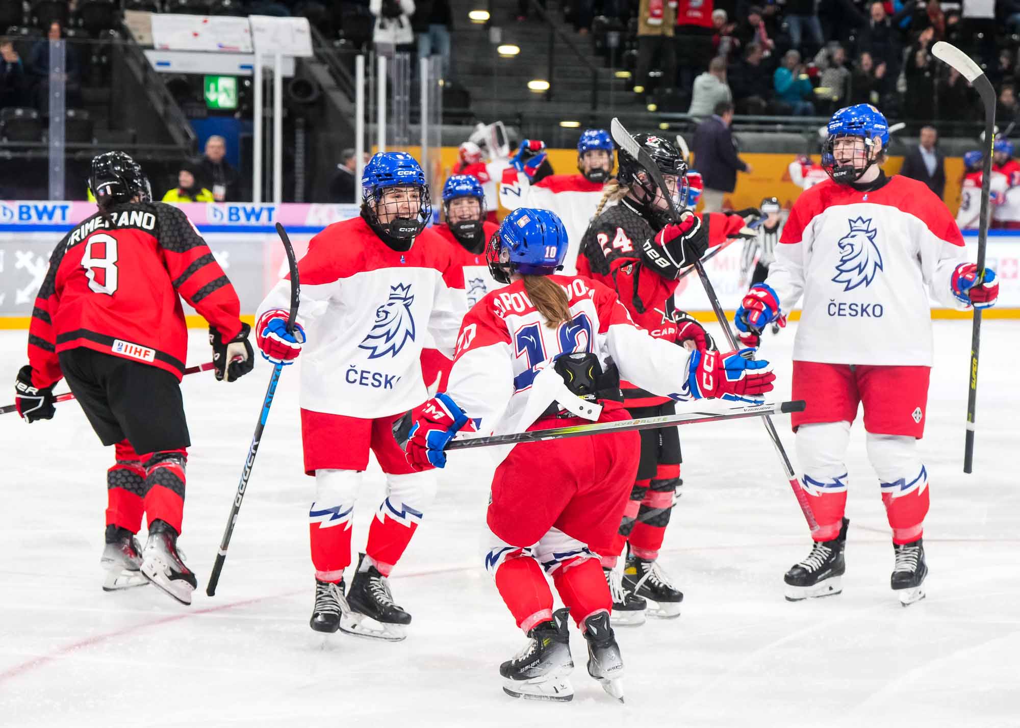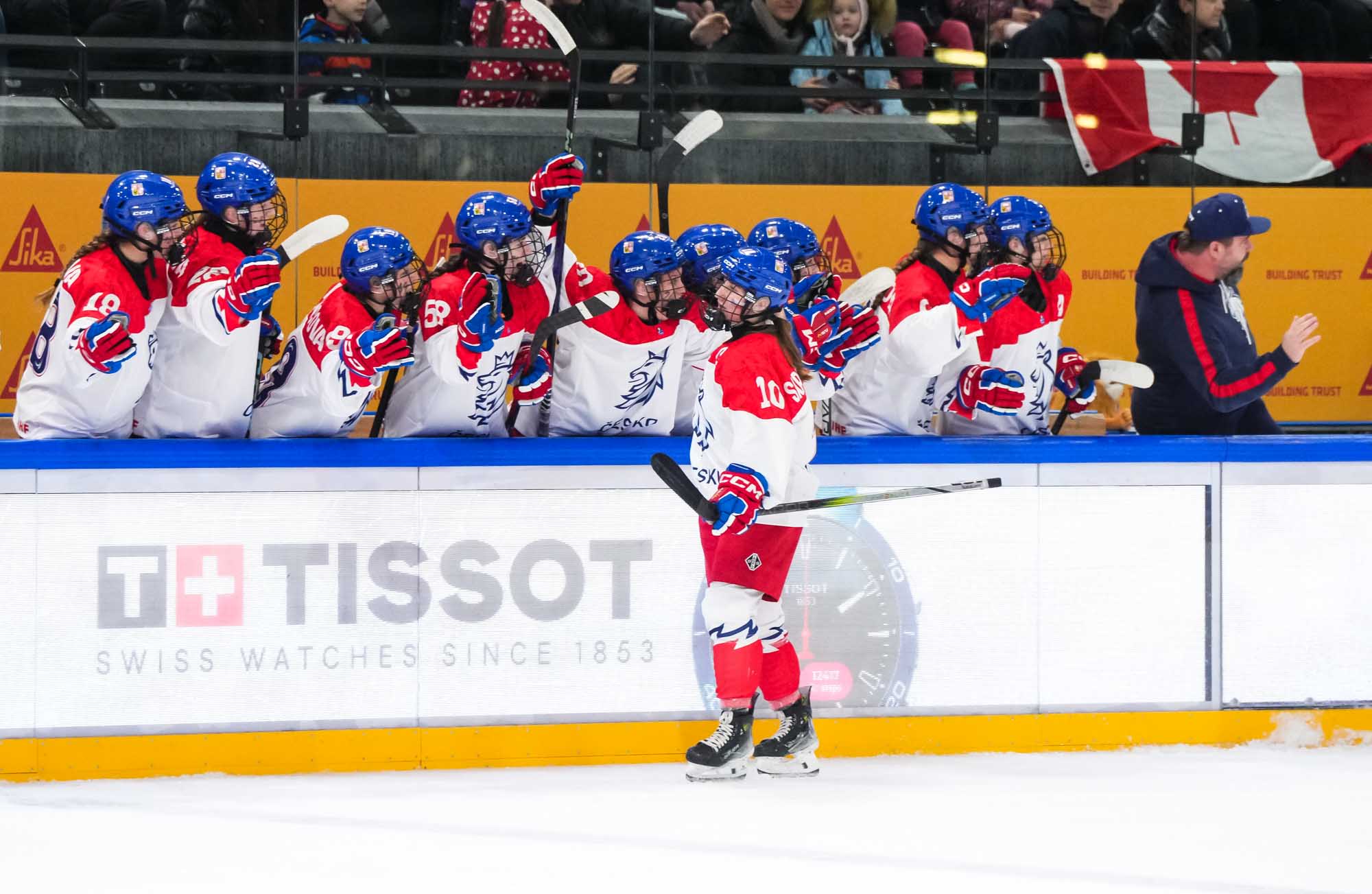 Czech captain Adela Sapovalivova (#10) celebrates with teammates after opening the scoring in a 4-2 semi-final upset over Canada at the 2024 IIHF Ice Hockey U18 Women's World Championship.