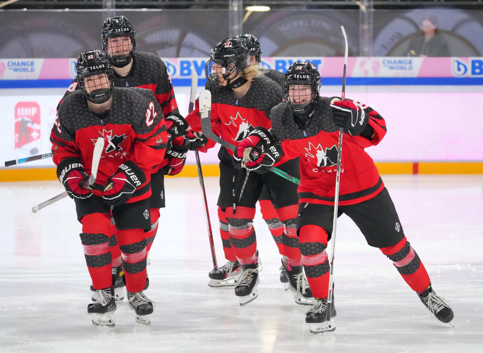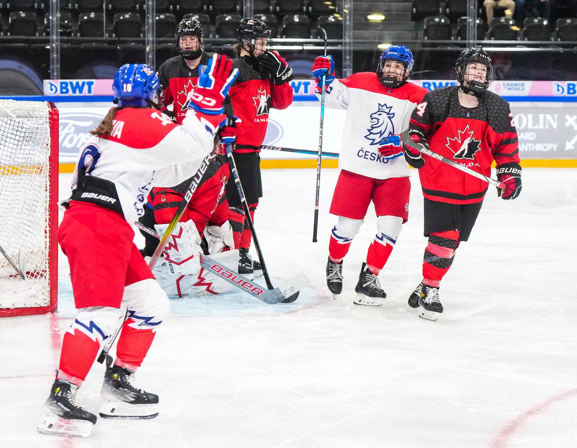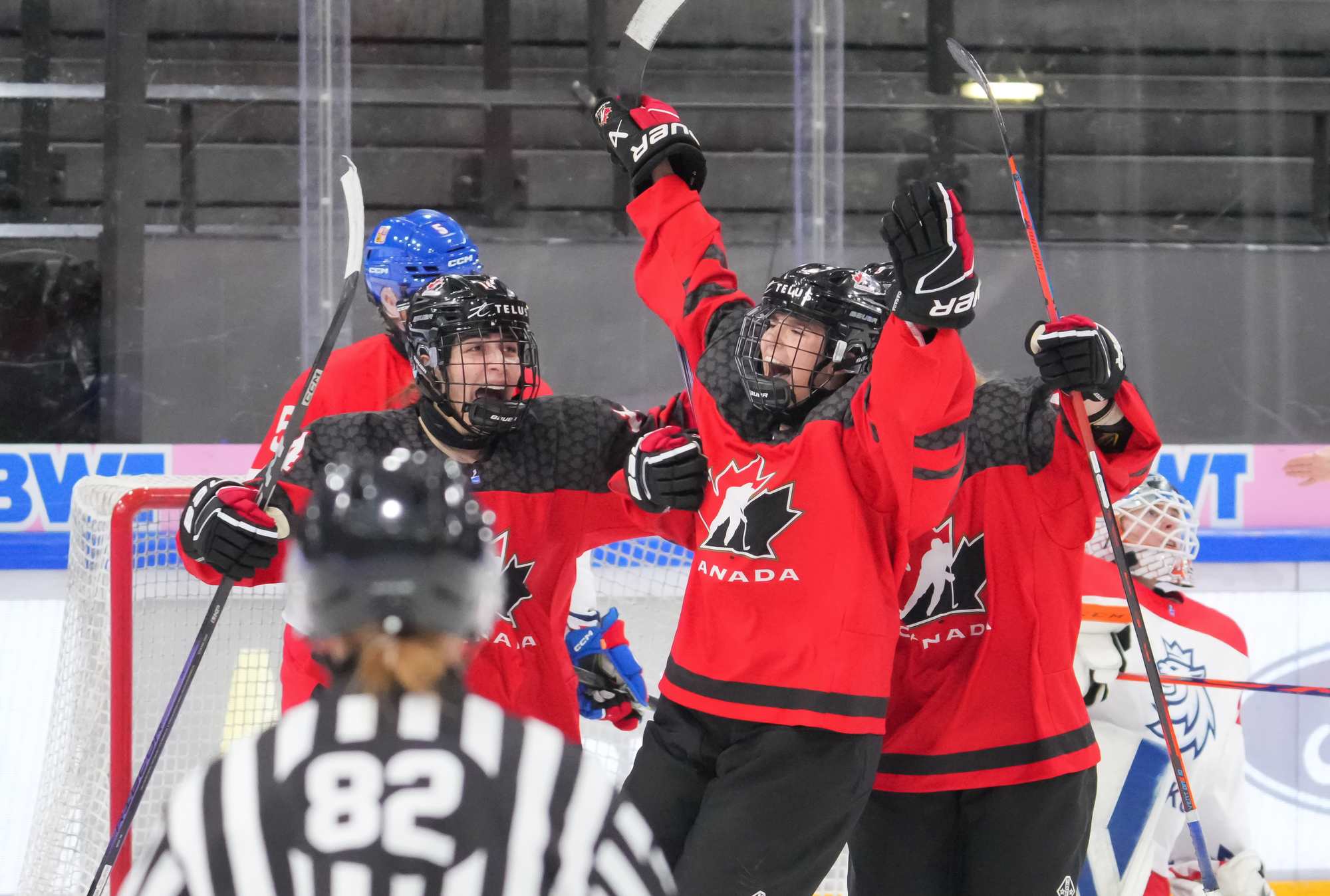 Czech captain Adela Sapovalivova (#10) celebrates with teammates after opening the scoring in a 4-2 semi-final upset over Canada at the 2024 IIHF Ice Hockey U18 Women's World Championship.