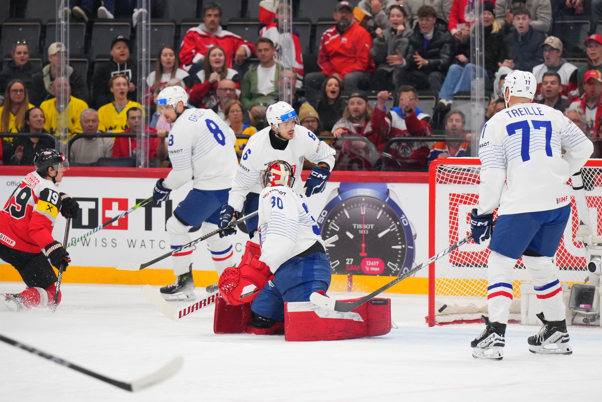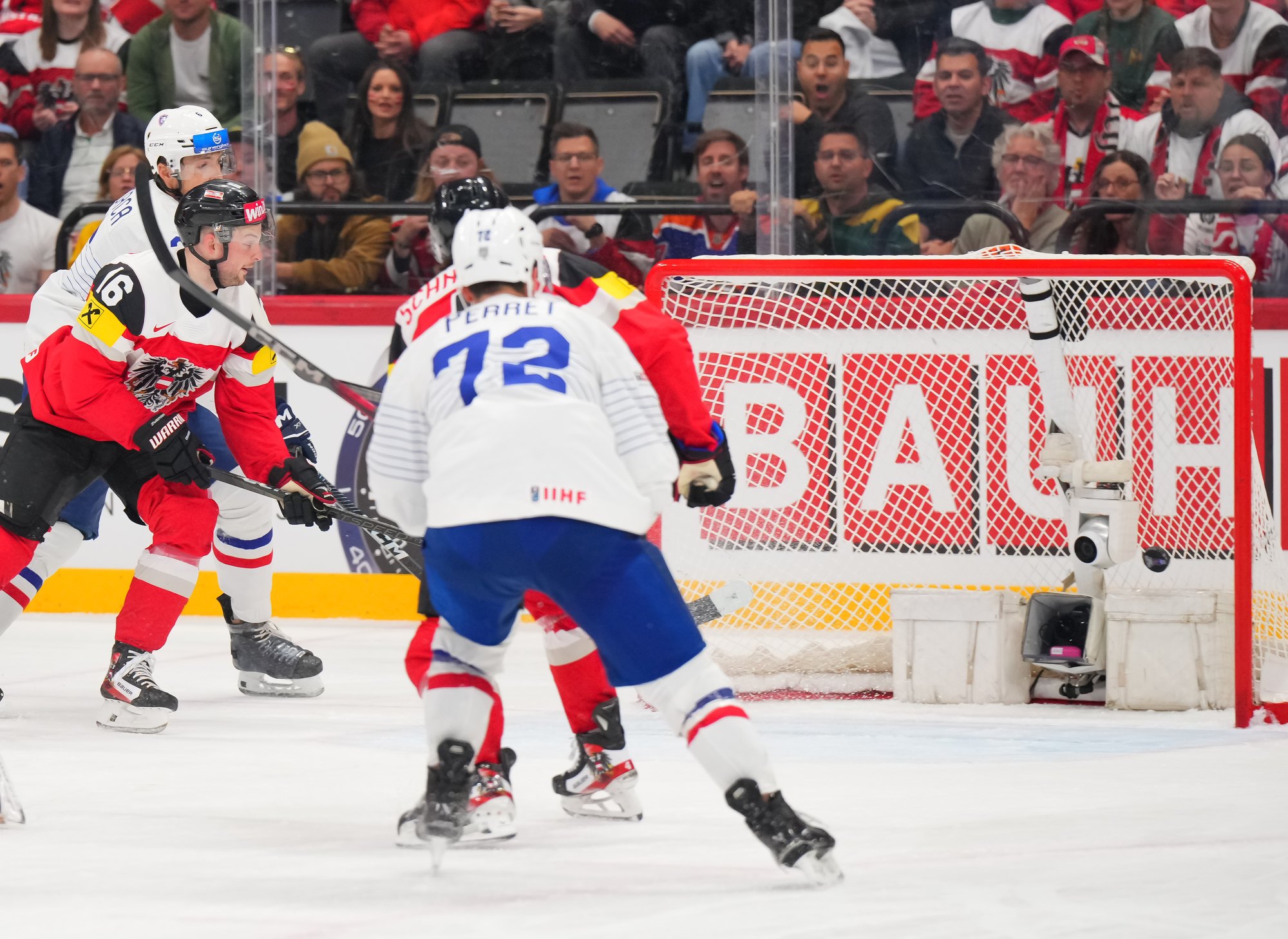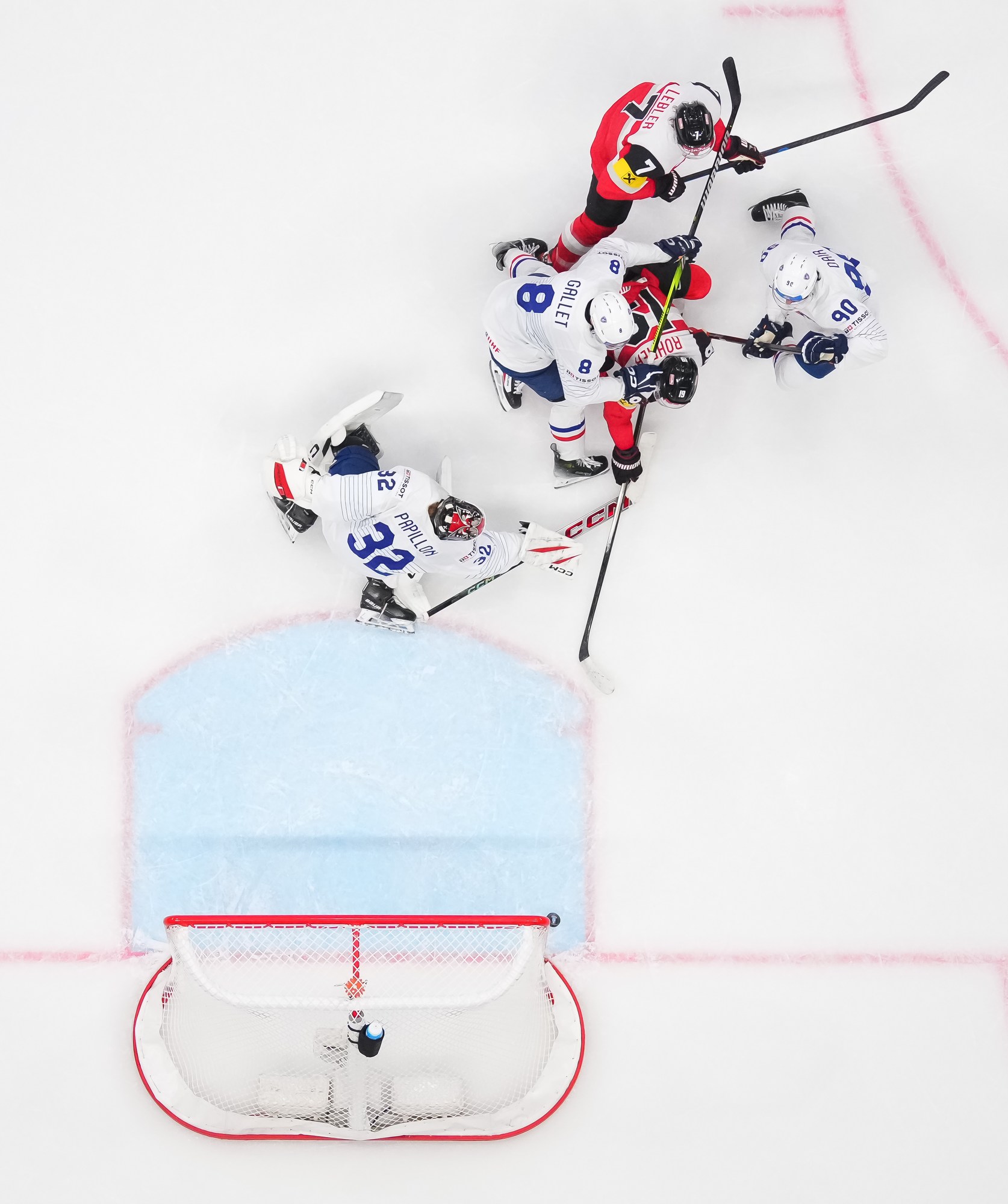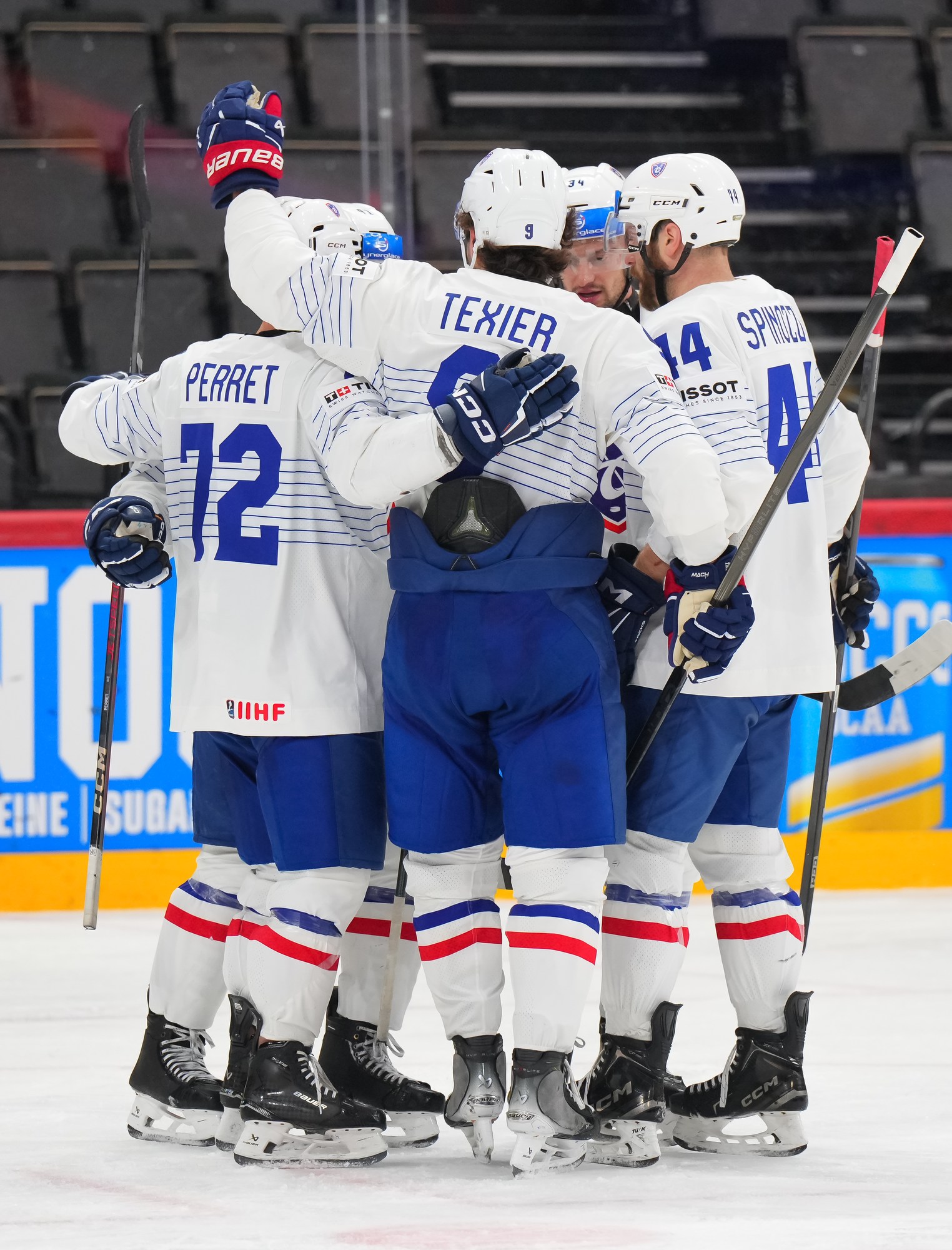 In the shift that followed, Alexandre Texier and Pierre-Edouard Bellemare tic-tac-toed the puck to Jordann Perret who one-timed it in, to get France on the board, at 10.09.