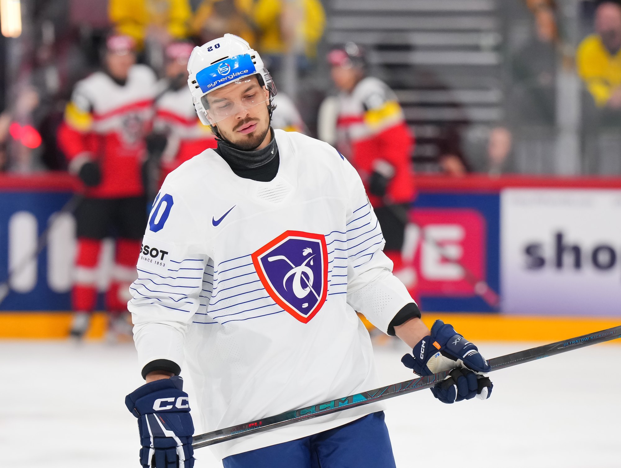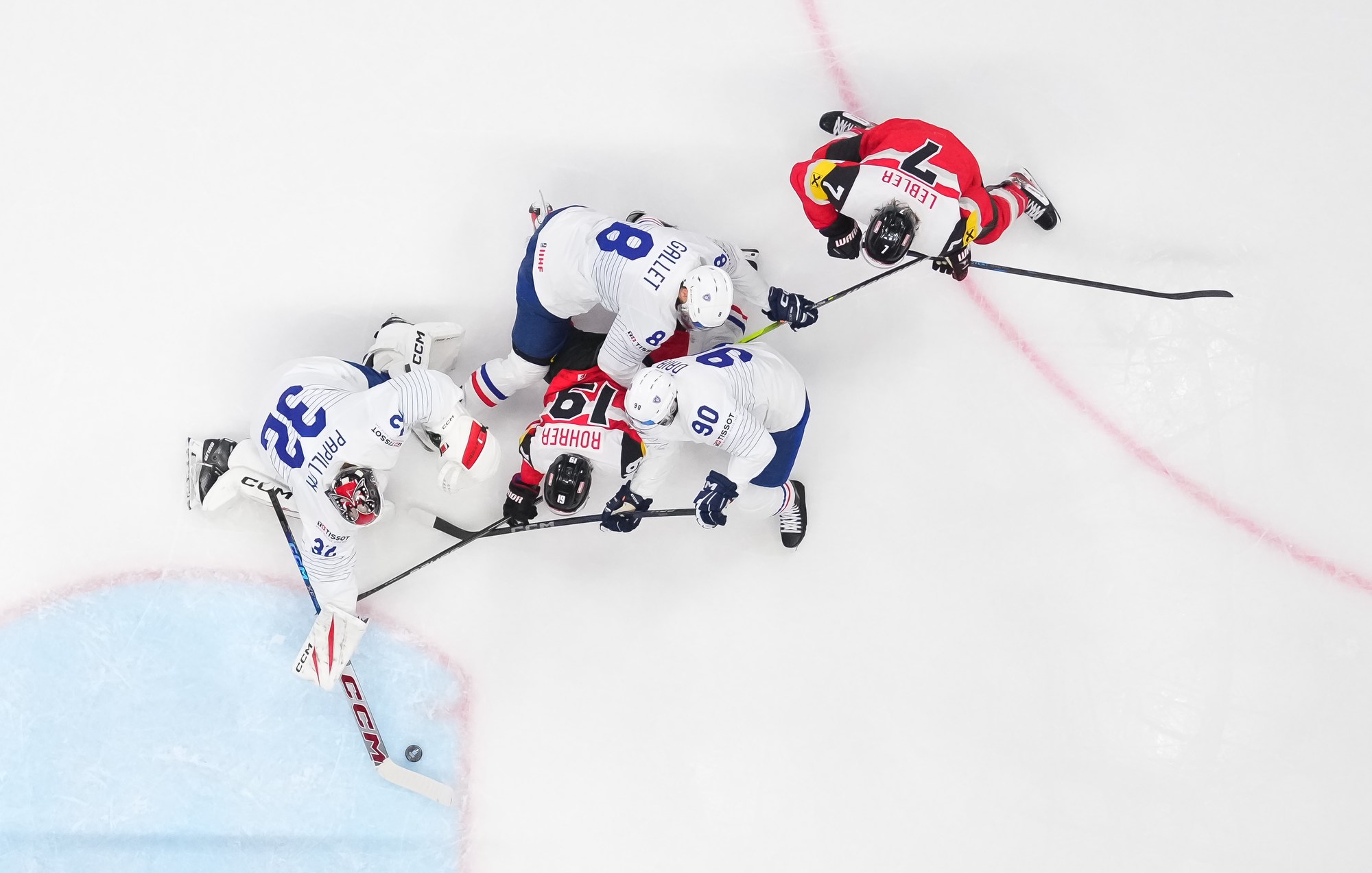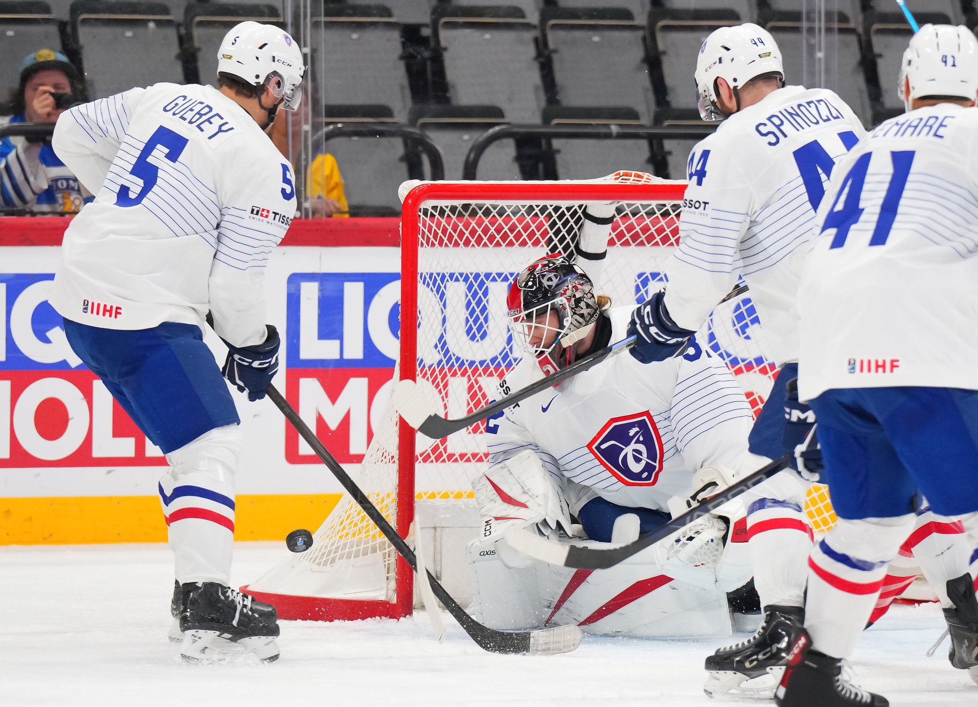 In the shift that followed, Alexandre Texier and Pierre-Edouard Bellemare tic-tac-toed the puck to Jordann Perret who one-timed it in, to get France on the board, at 10.09.
