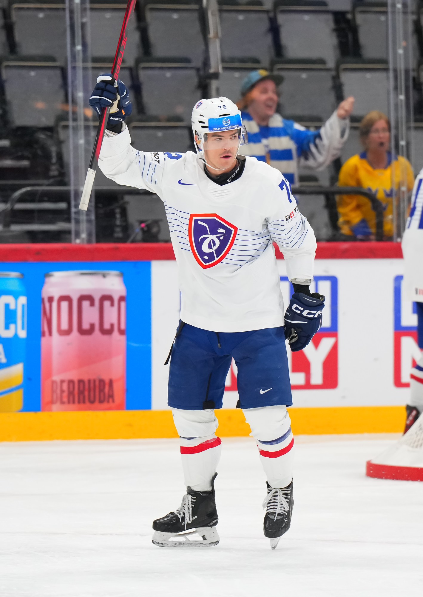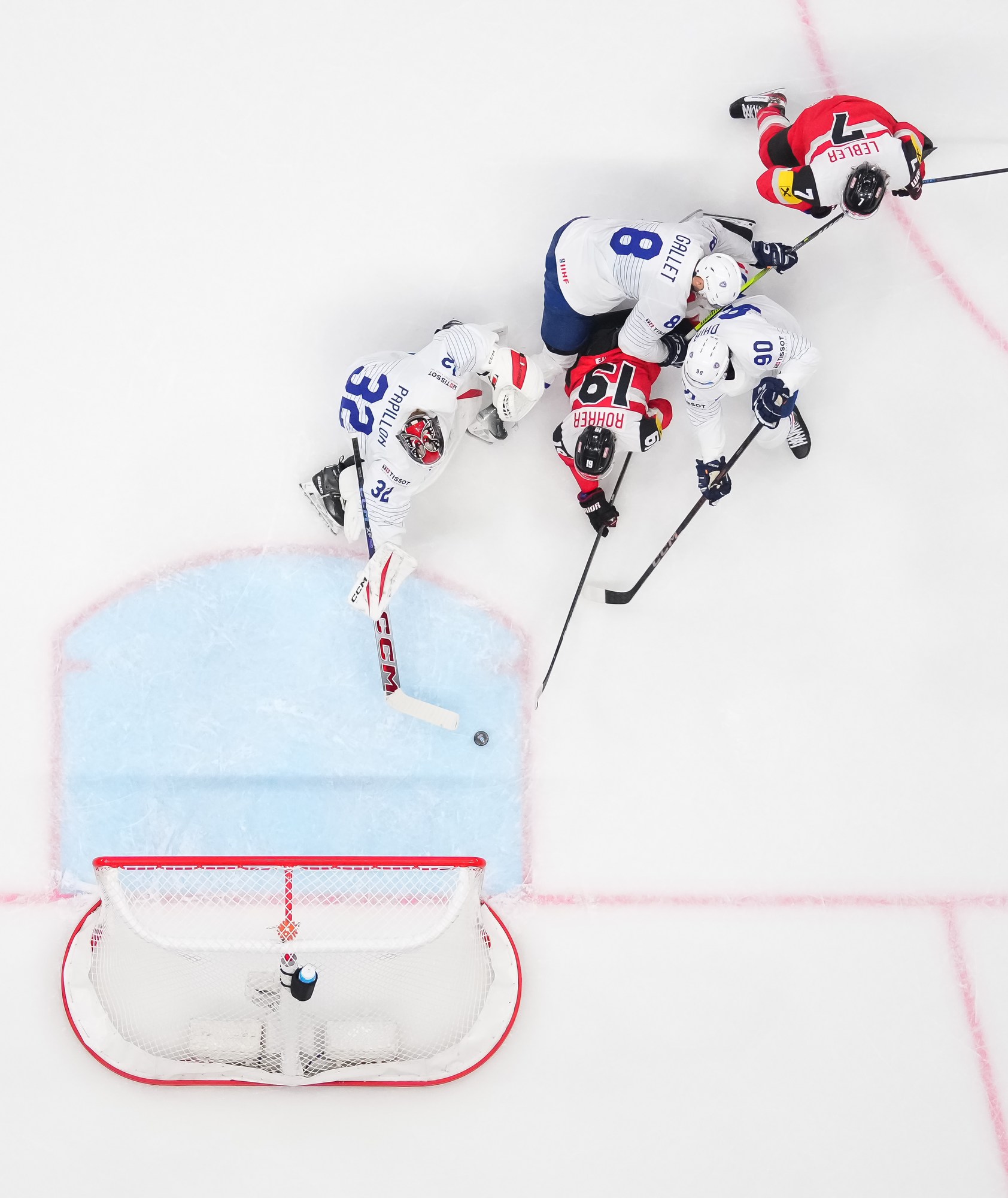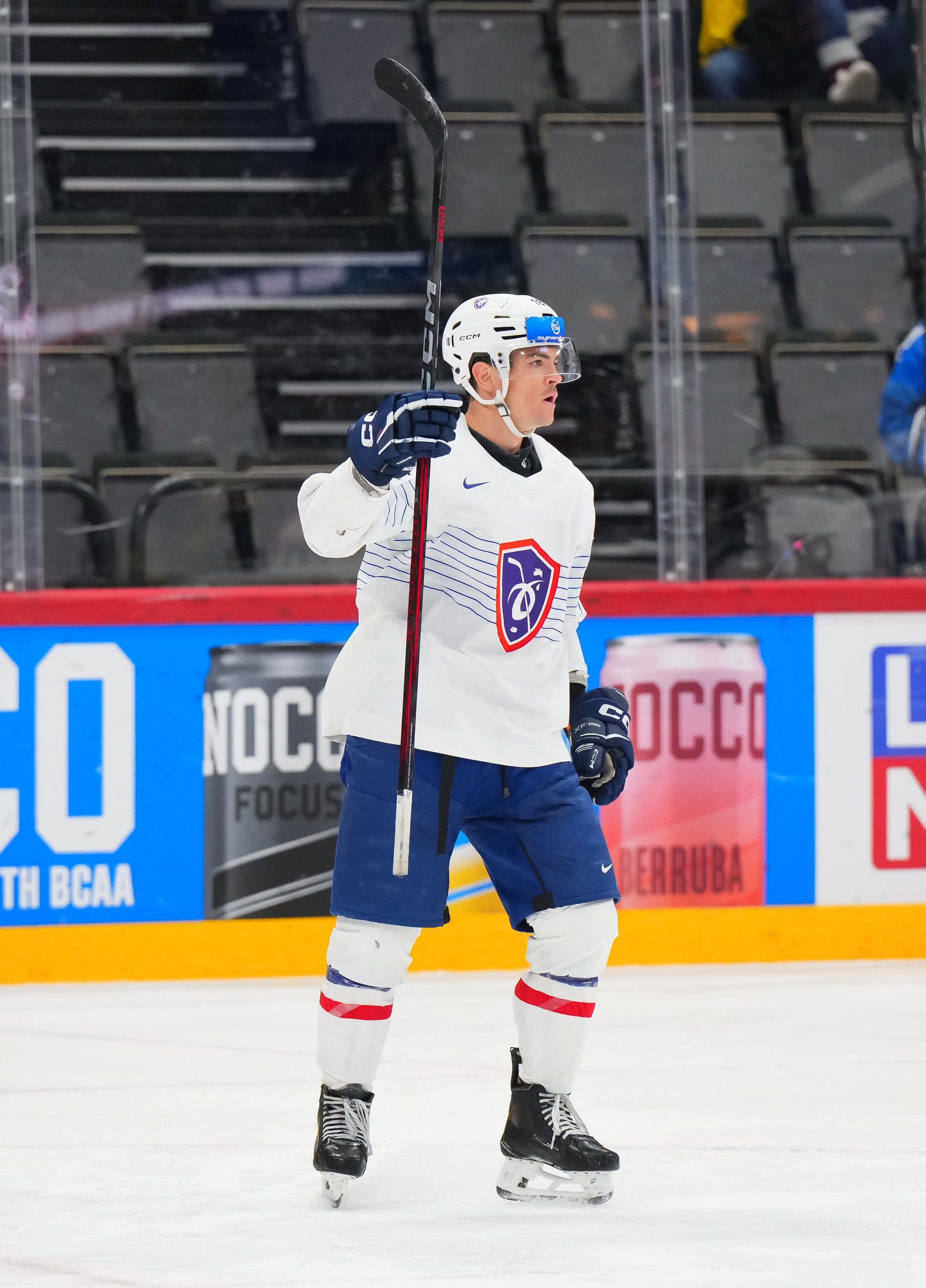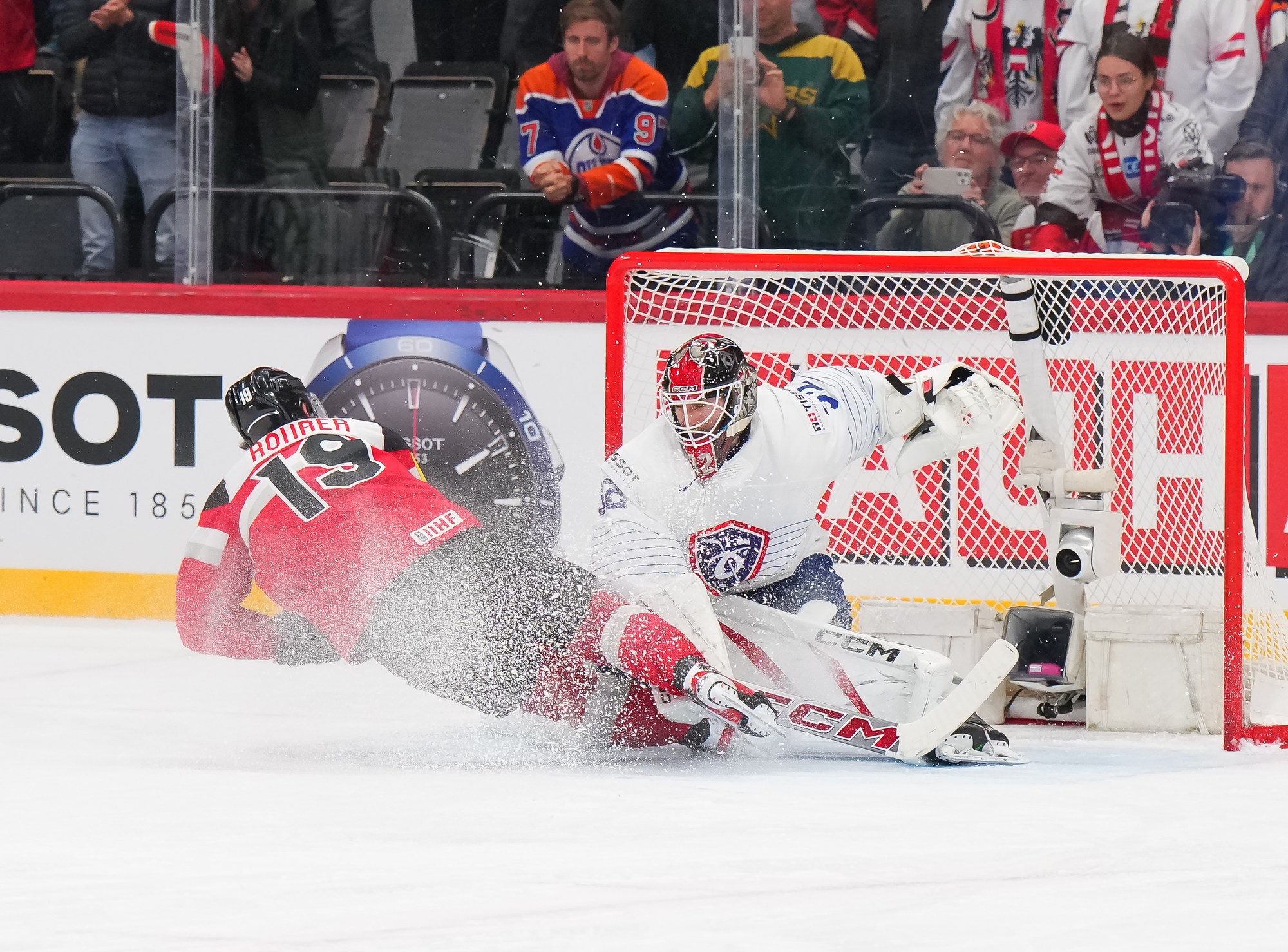 In the shift that followed, Alexandre Texier and Pierre-Edouard Bellemare tic-tac-toed the puck to Jordann Perret who one-timed it in, to get France on the board, at 10.09.