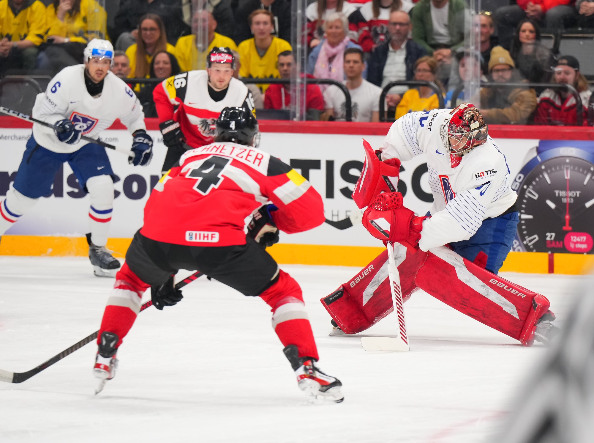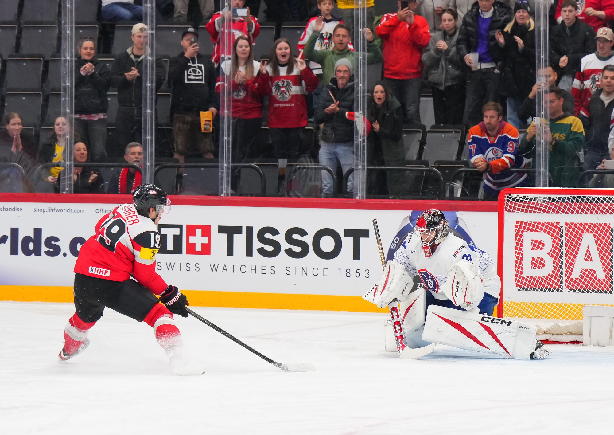 Austria got off to a dream start to the game when Kasper got the puck on the blue line in the first shift. He accelerated and fired a wrister from the faceoff dot and it beat Keller on the short side just 39 seconds into the game.
