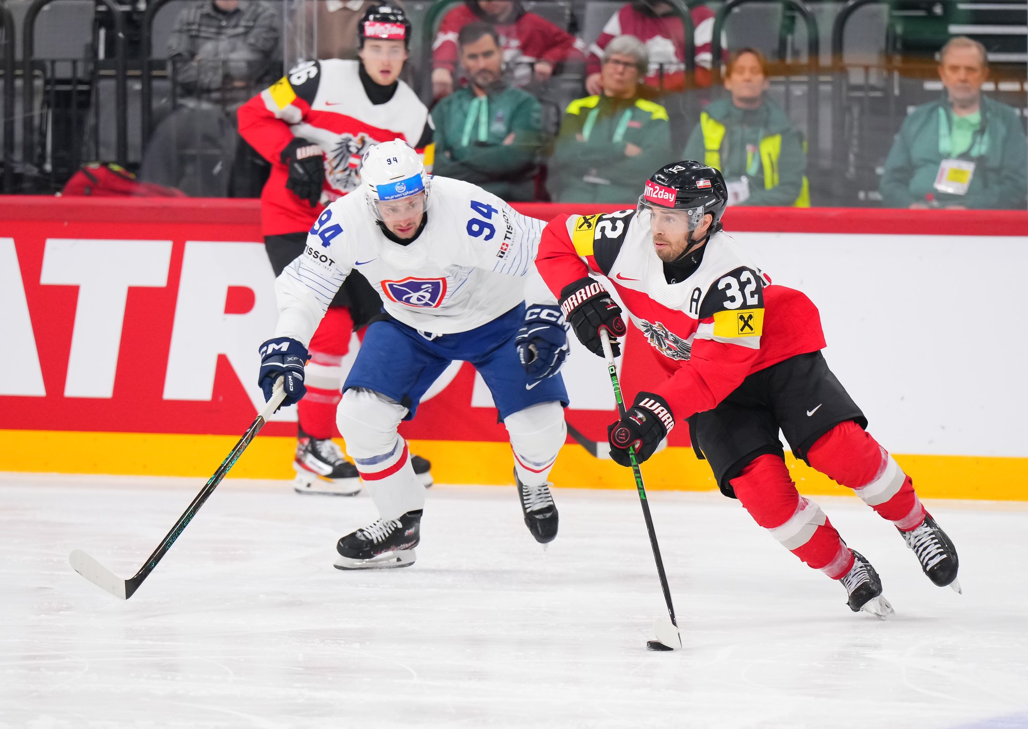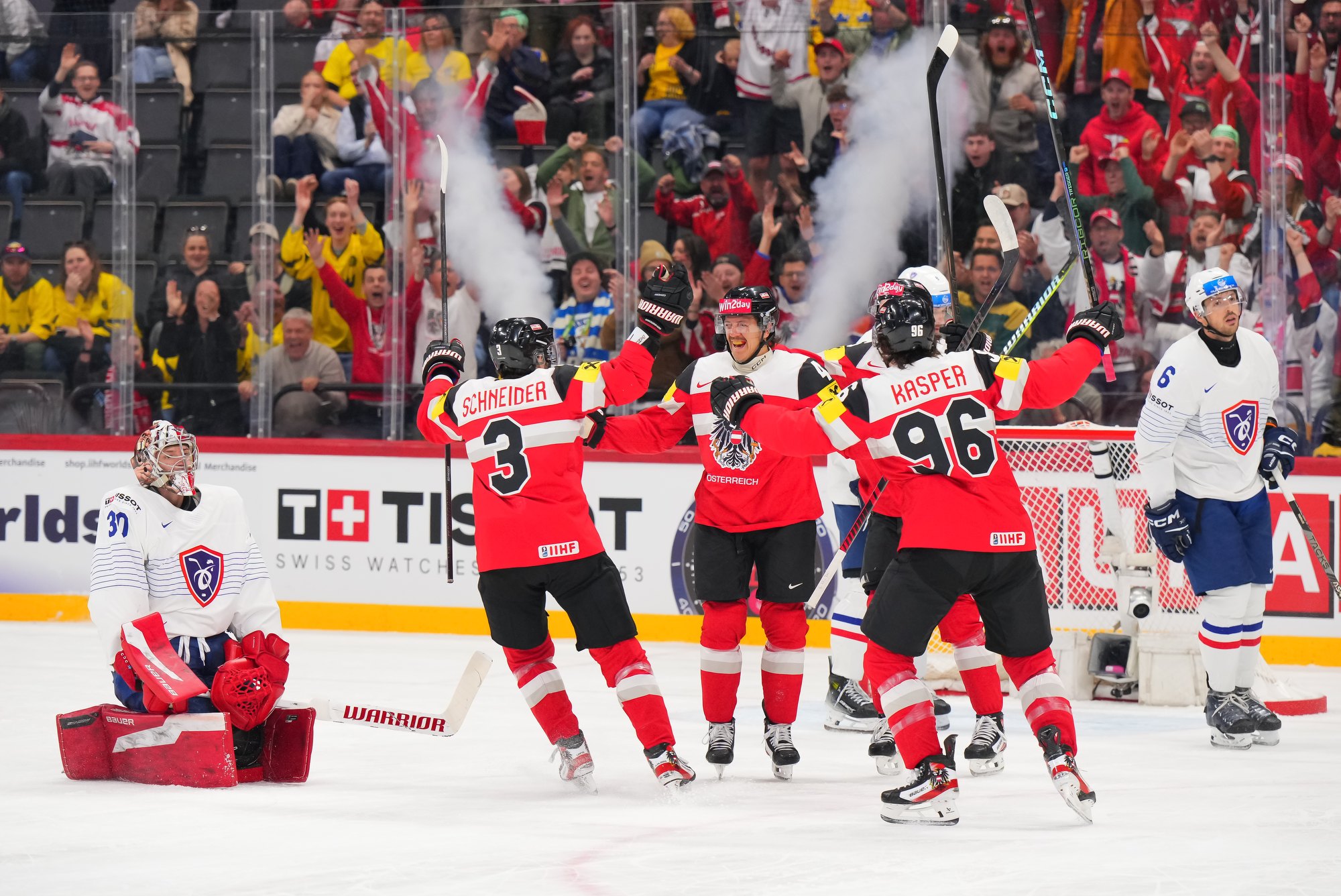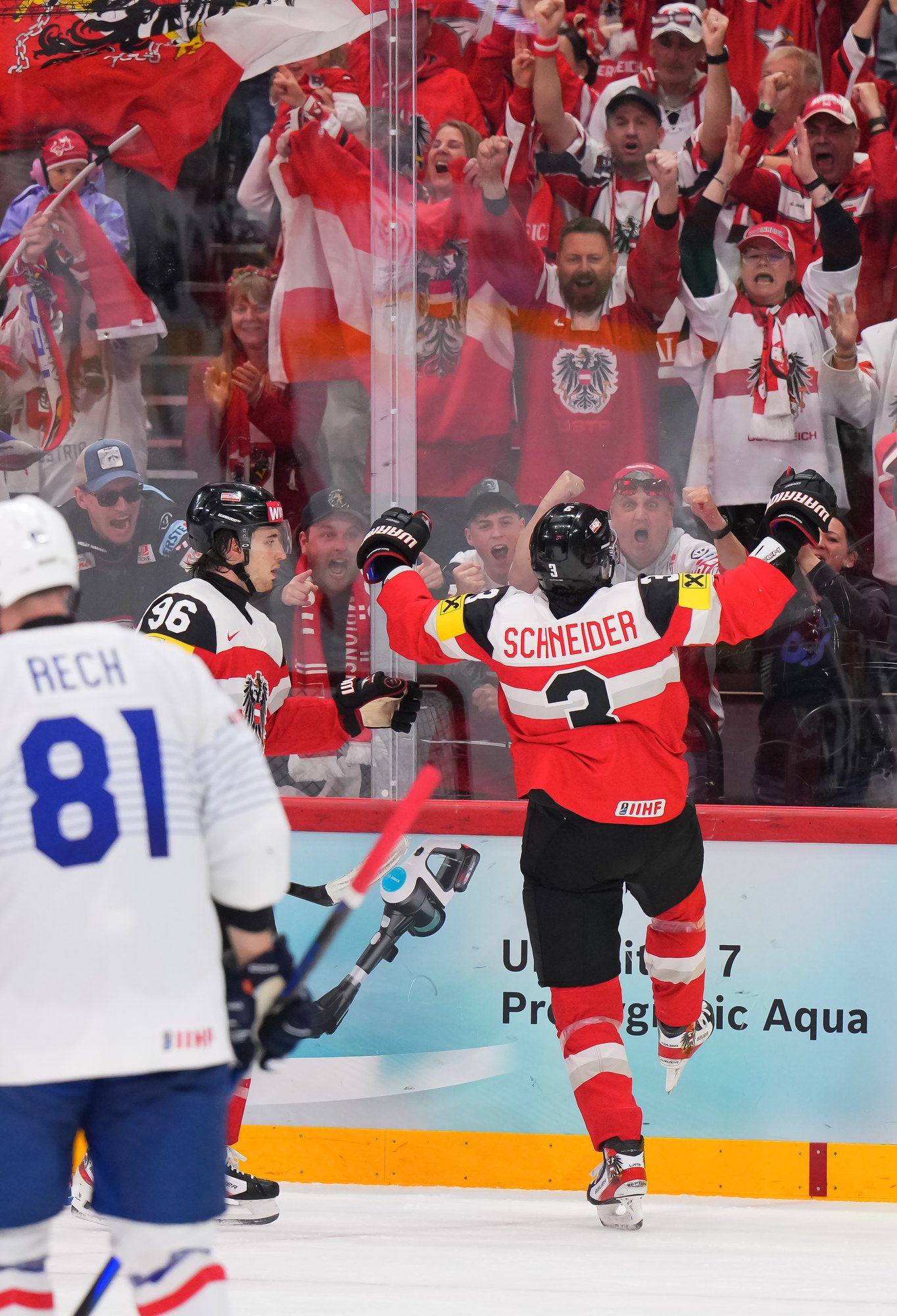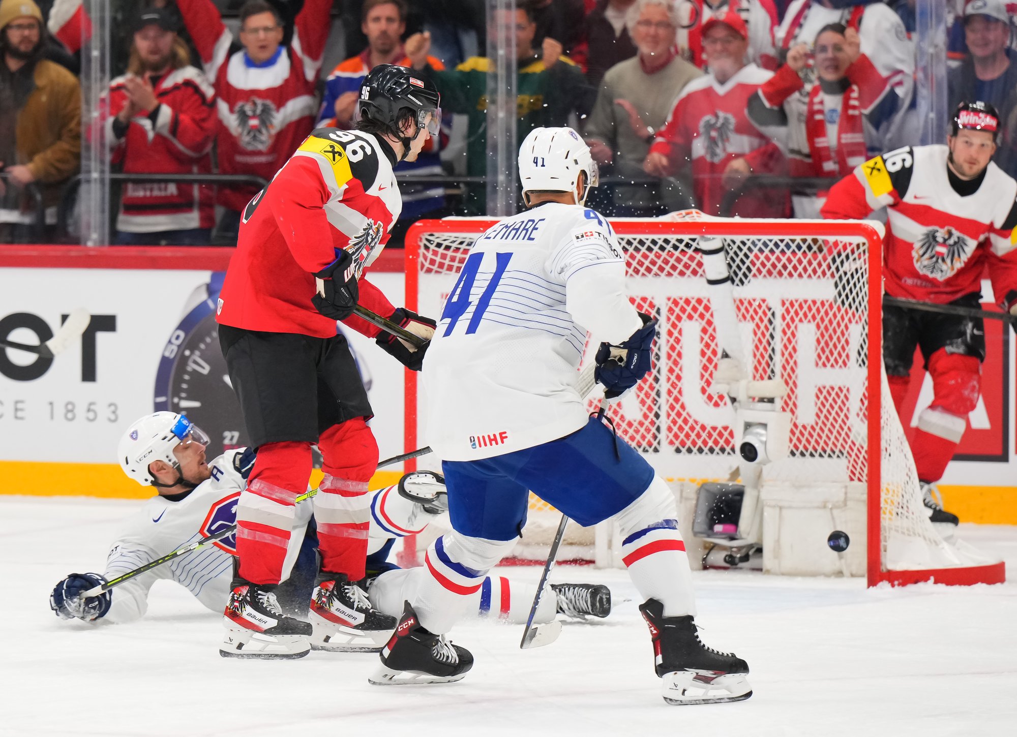 France chased an equalizer, but Austria got the insurance they needed when Peter Schneider scored their fifth goal into an empty French net at 19.09.