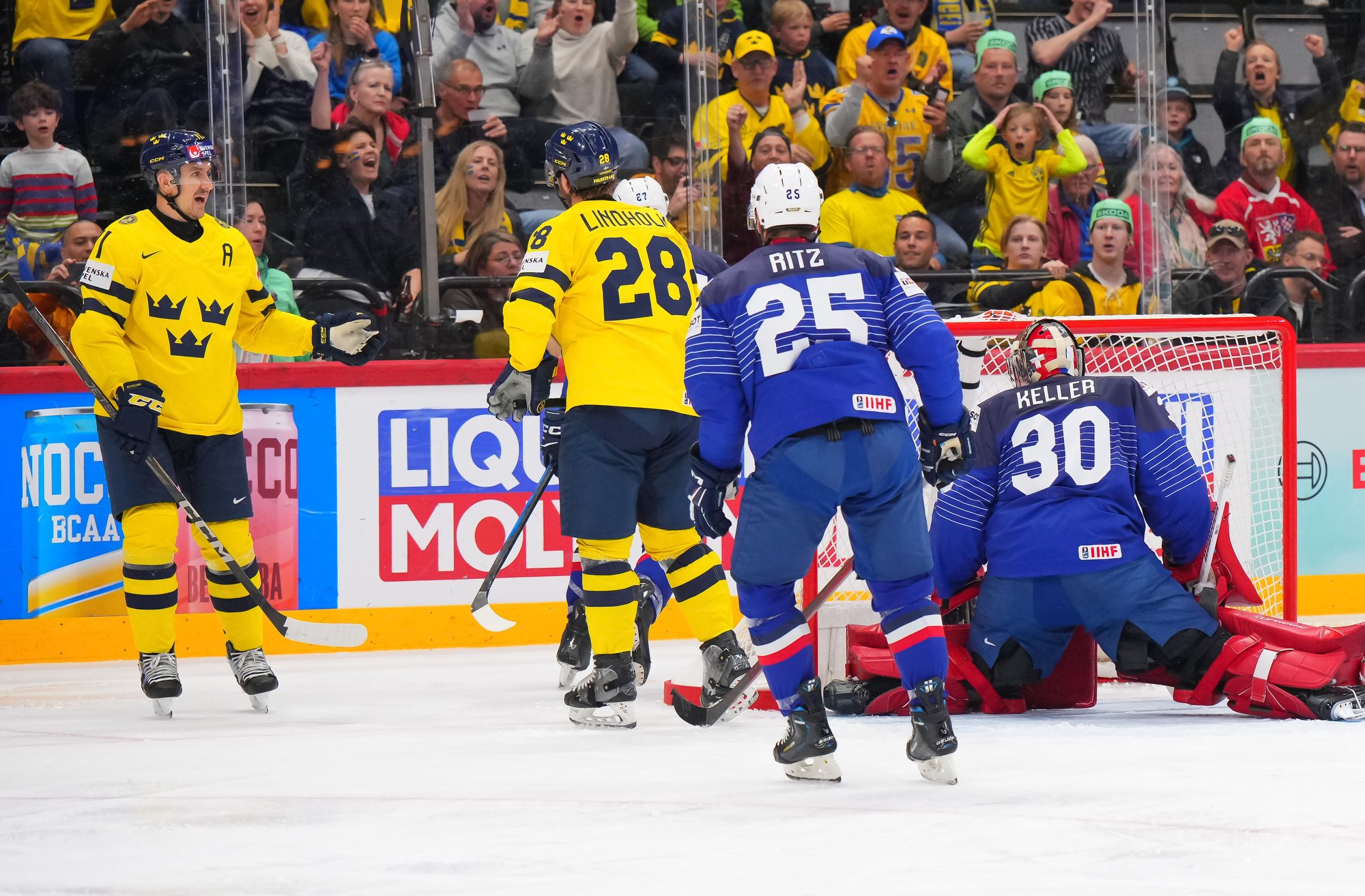 The Swedes added to their lead early in the second when Lindholm scored his fourth goal in less than 24 hours and tournament-leading sixth overall. He took a pass in close from Mikael Backlund and redirected it on goal, but it hit the skate of Pierre Crinon and bounced over the head of Keller and in at 4:39.