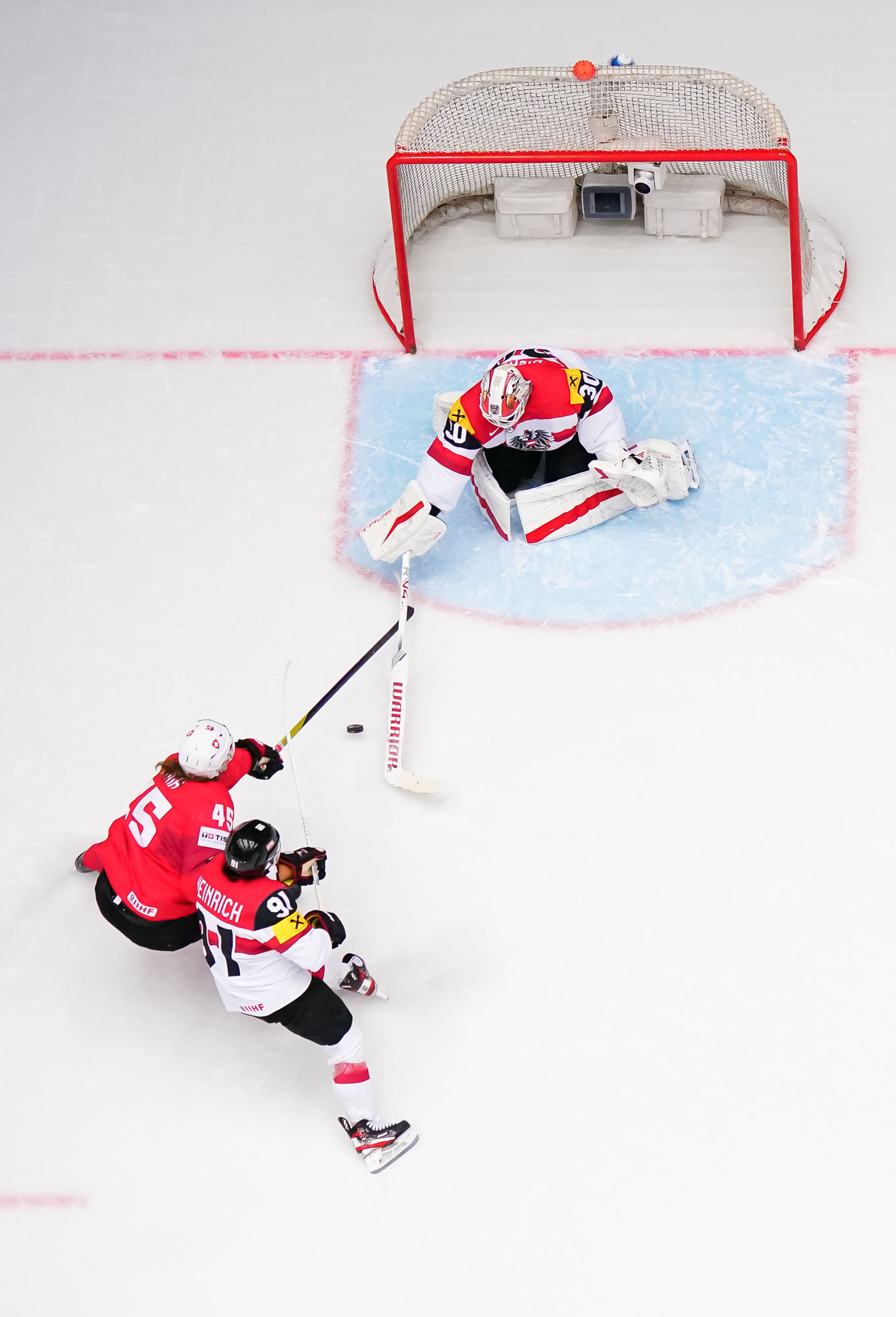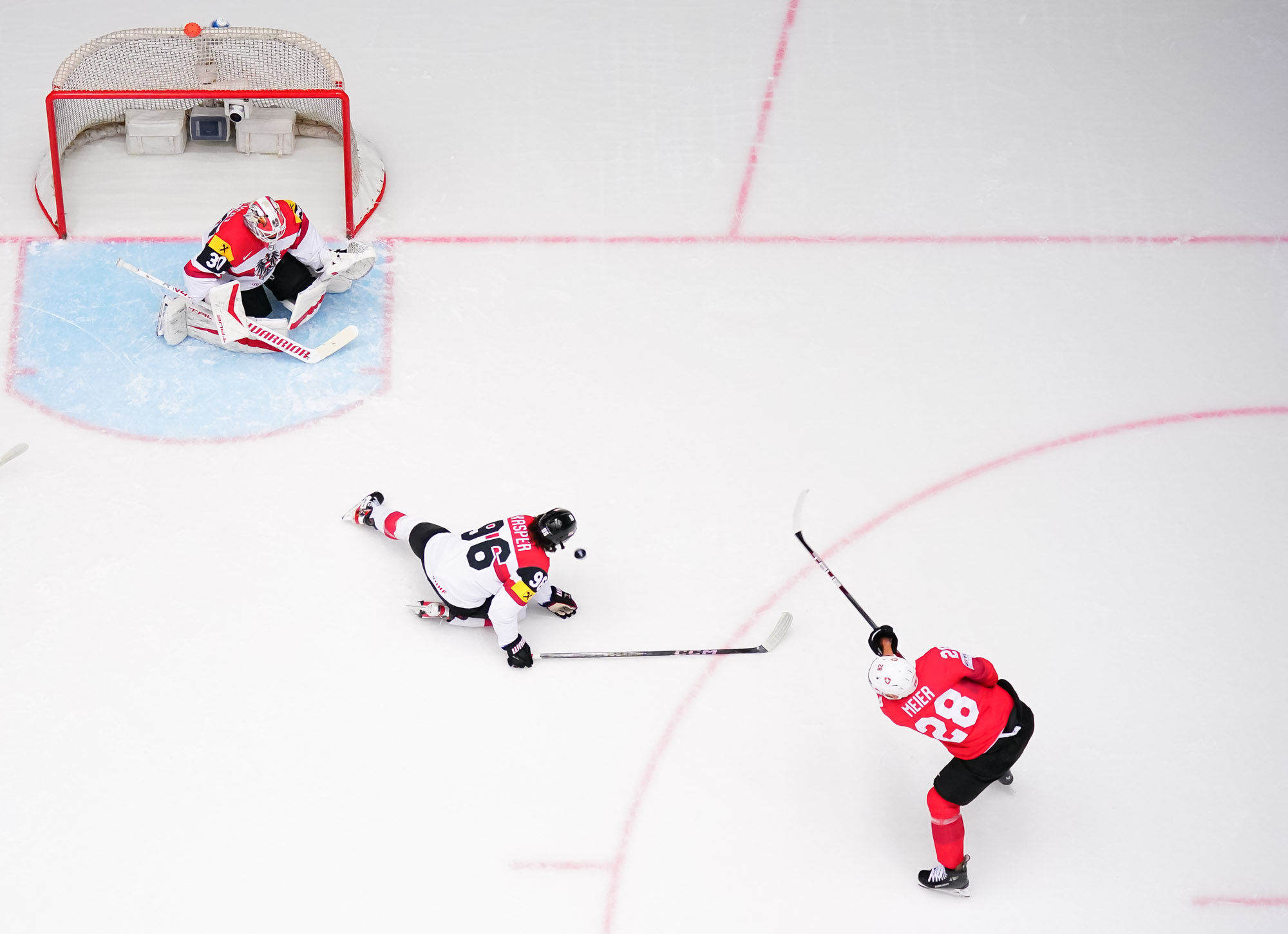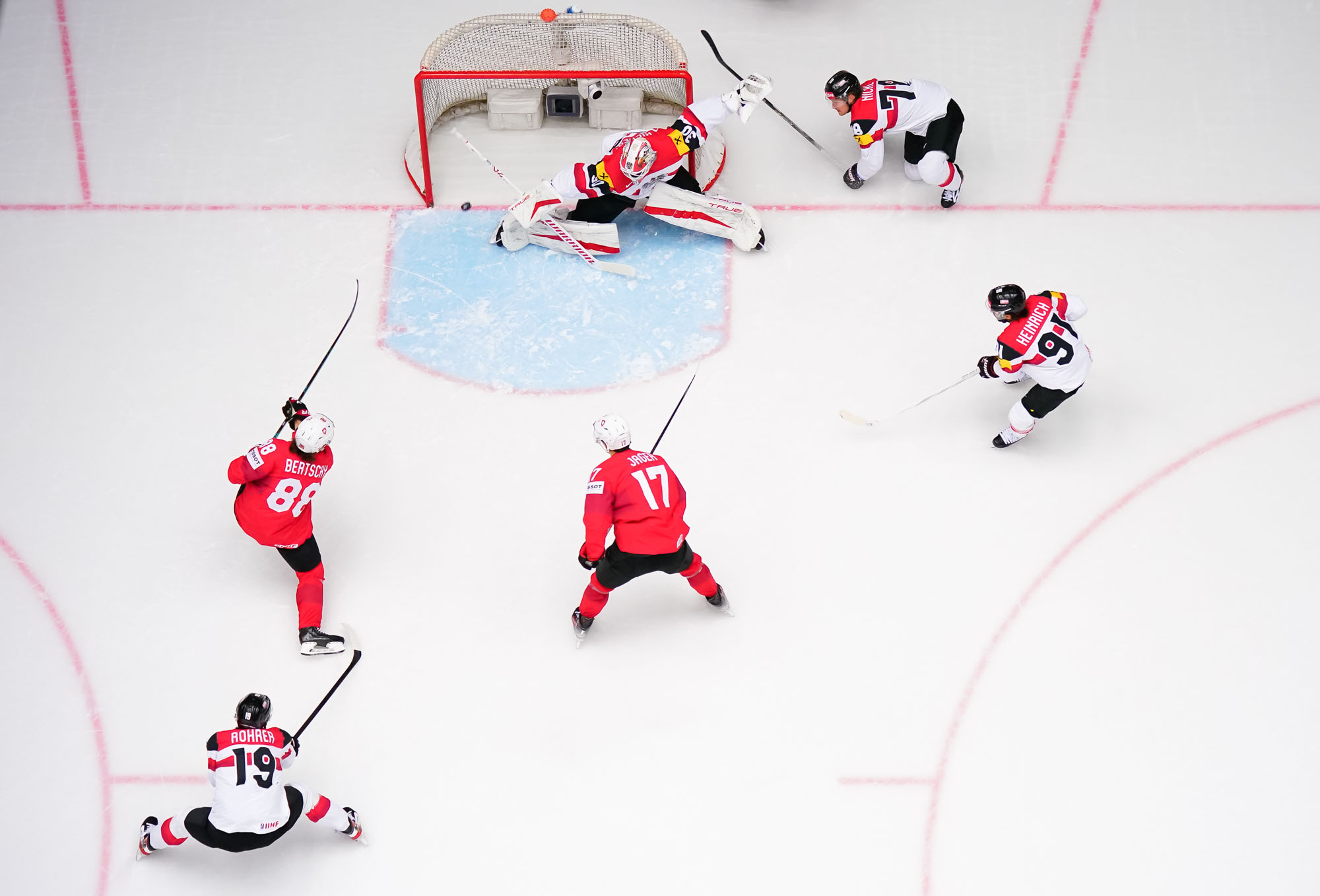 After Lukas Haudum tripped up Bertschy along the side boards, the Swiss power play kept the momentum going. Kickert sharply denied Sven Andrighetto by his left post, but relentless pressure and puck movement spawned Meier’s third goal of the tournament on a quick release from the right faceoff circle at 11:03.