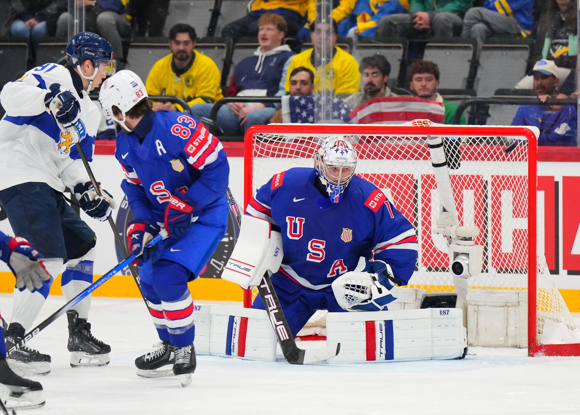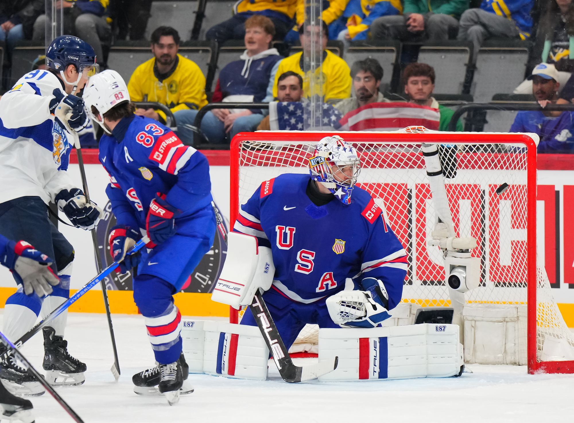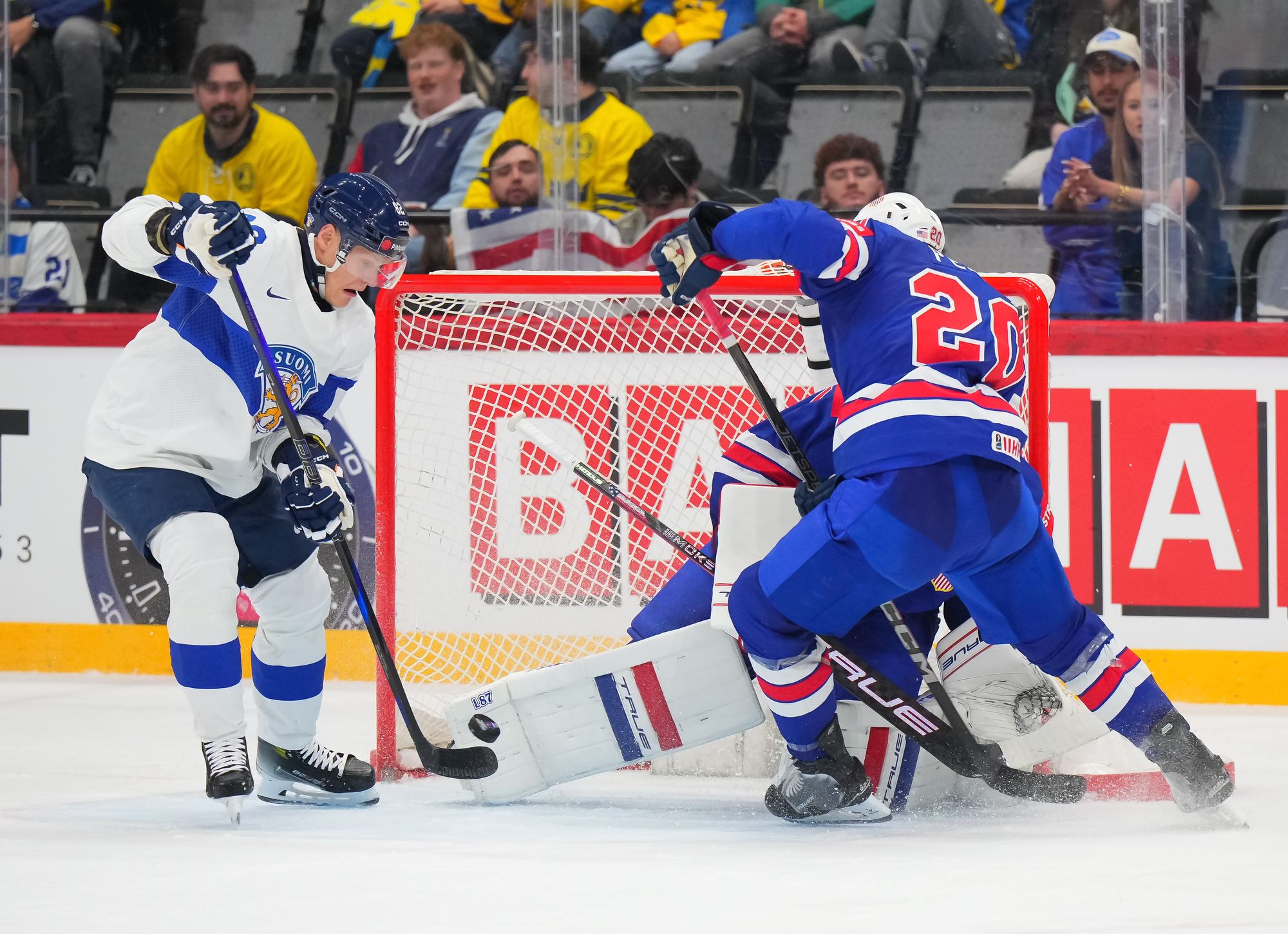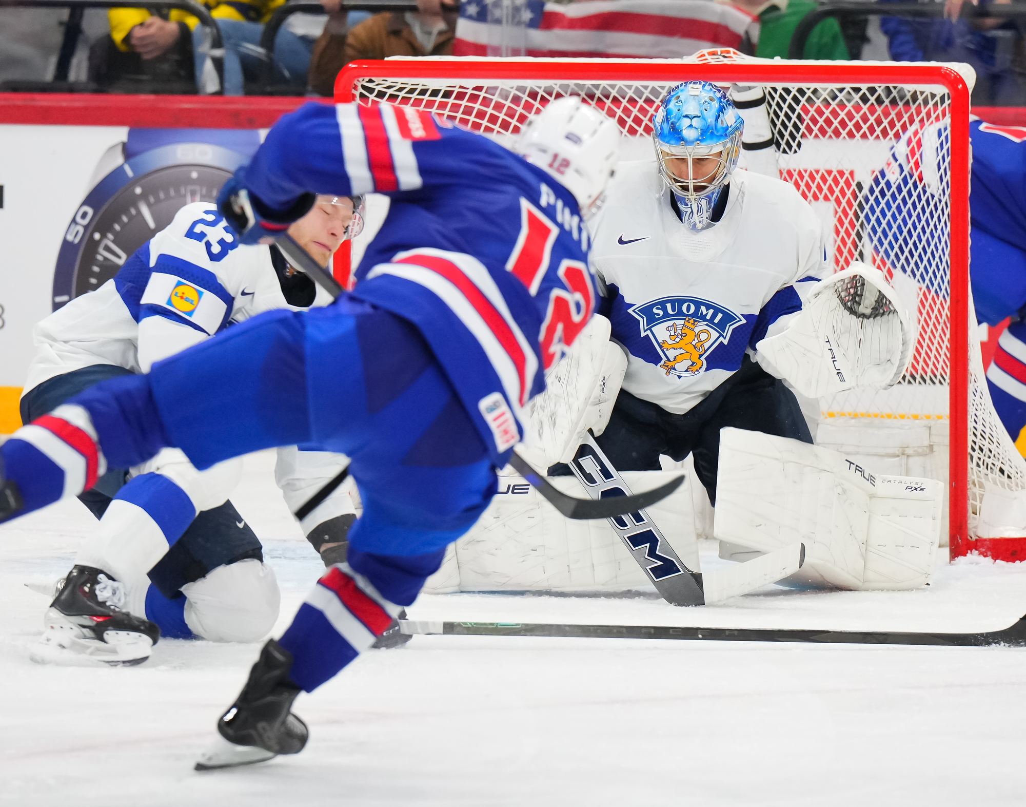 The Finnish defense didn’t make many mistakes, but they did make one small error in the third period, and two passes later, Shane Pinto scored Team USA’s fourth goal. Cutter Gauthier found Will Smith on the left, and he waited for Pinto to show up in the slot. Smith sent a saucer across ice and Pinto scored with a wrister on the blocker side – a carbon copy of the first goal – to extend the Americans’ lead to two at 8:56.