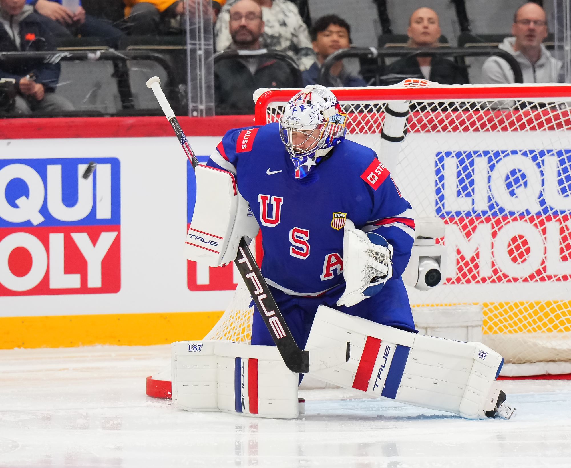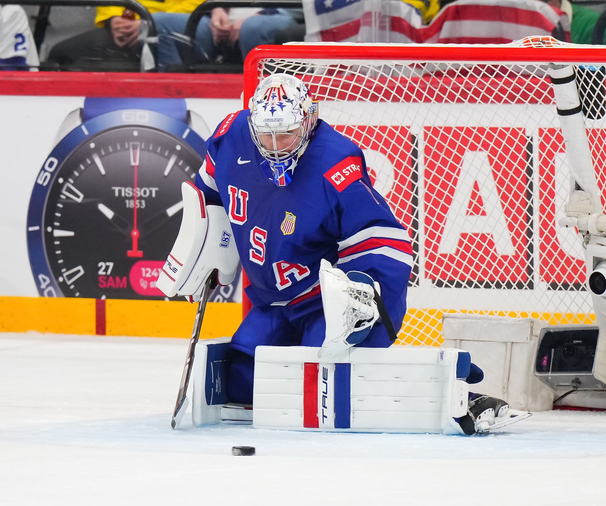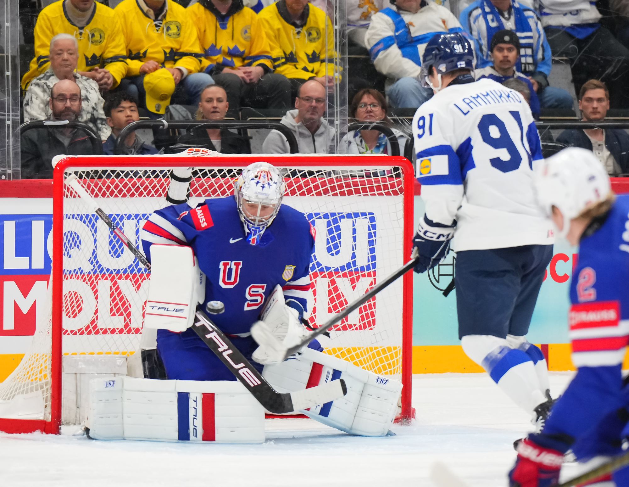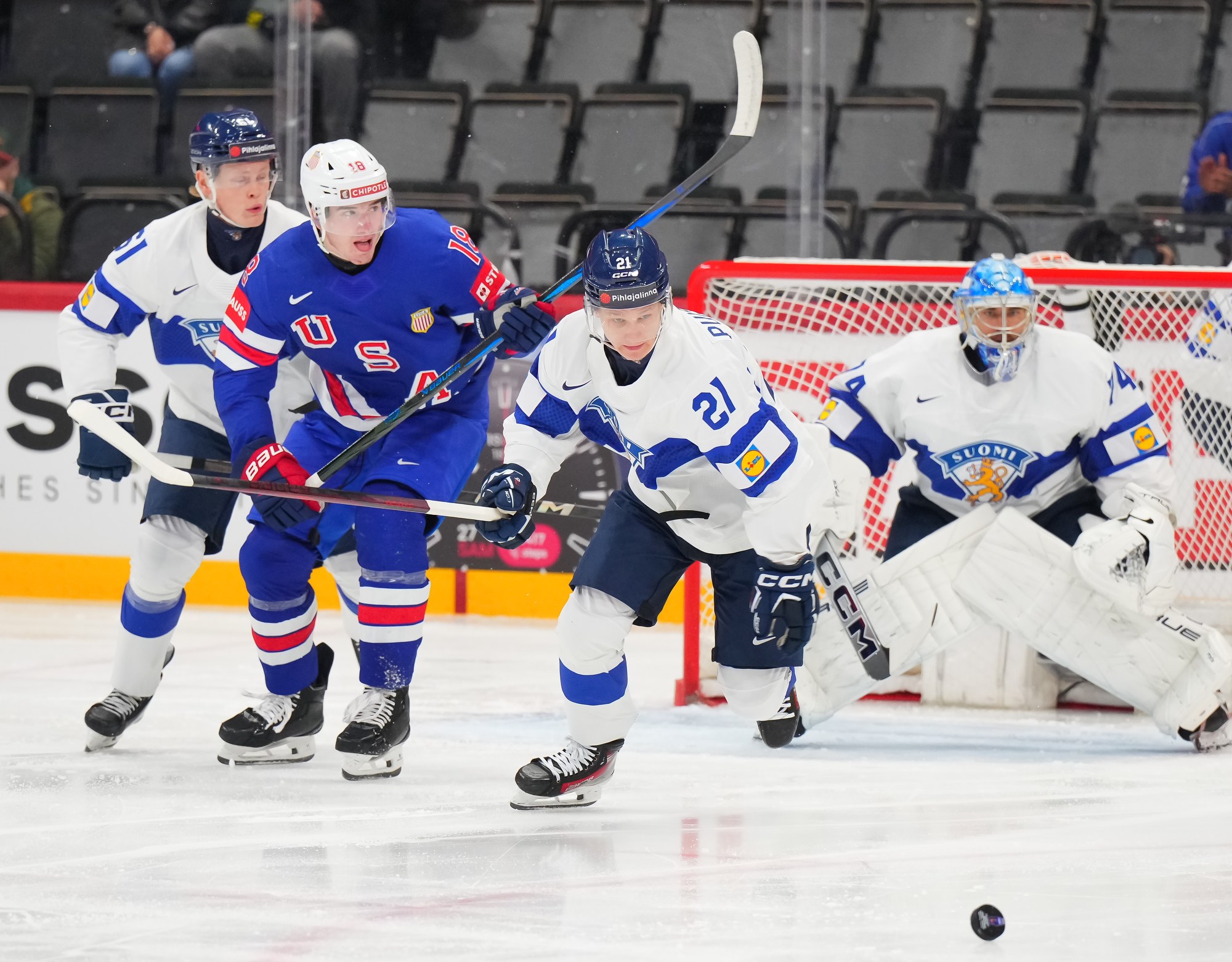 The Finnish defense didn’t make many mistakes, but they did make one small error in the third period, and two passes later, Shane Pinto scored Team USA’s fourth goal. Cutter Gauthier found Will Smith on the left, and he waited for Pinto to show up in the slot. Smith sent a saucer across ice and Pinto scored with a wrister on the blocker side – a carbon copy of the first goal – to extend the Americans’ lead to two at 8:56.