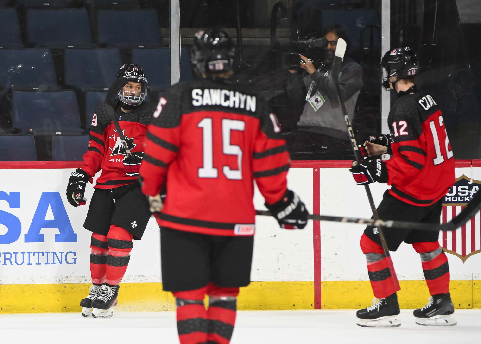 Canada didn’t get its first goal until 12:34, but as it turned out that opener loosened up the Canadian offence. Katzin found Cameron Schmidt in front on a power play to make it 1-0. Less than four minutes later, another man advantage succeeded. This time, Katzin finished the play after a clever back pass in the slot by captain Braeden Cootes.