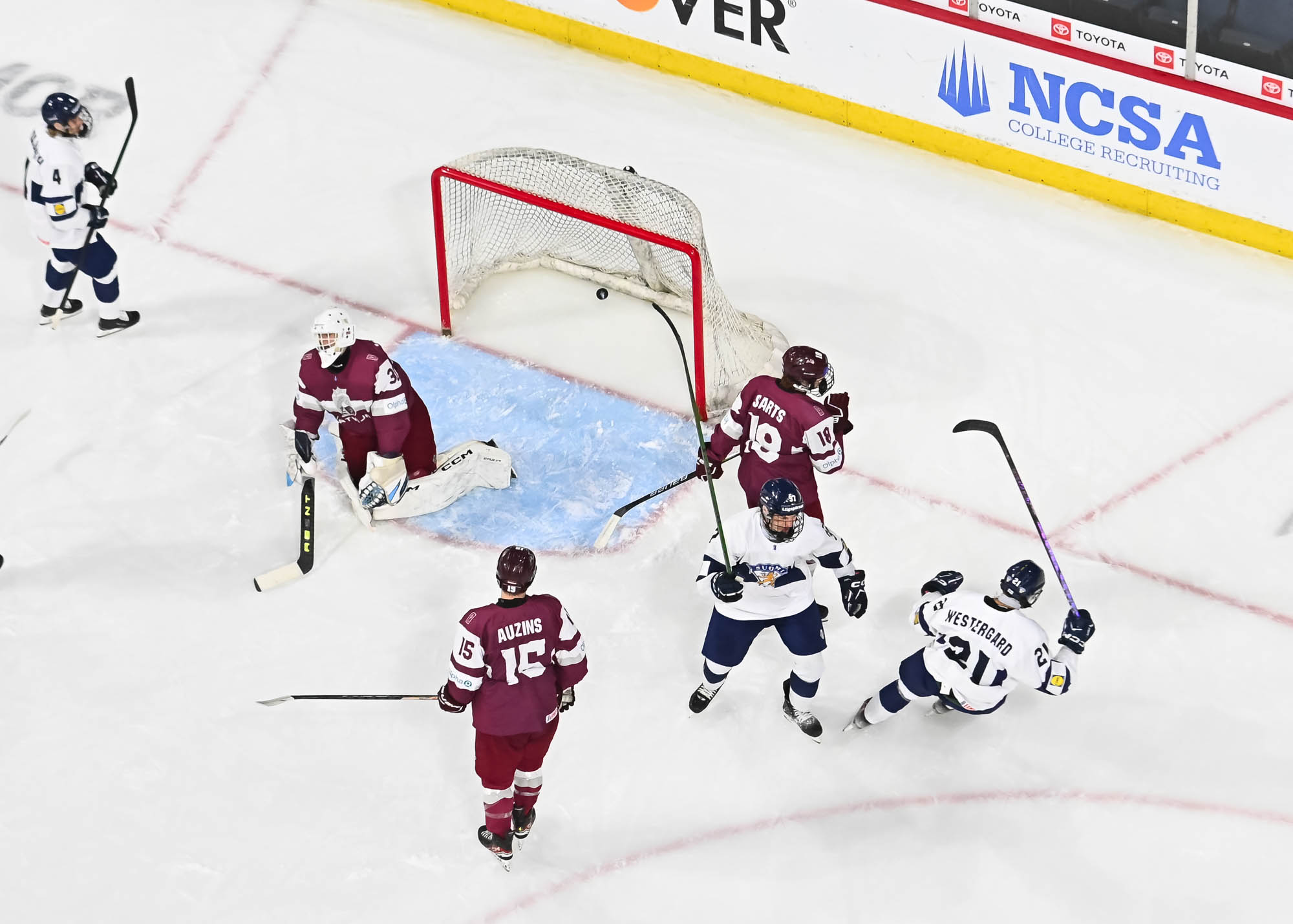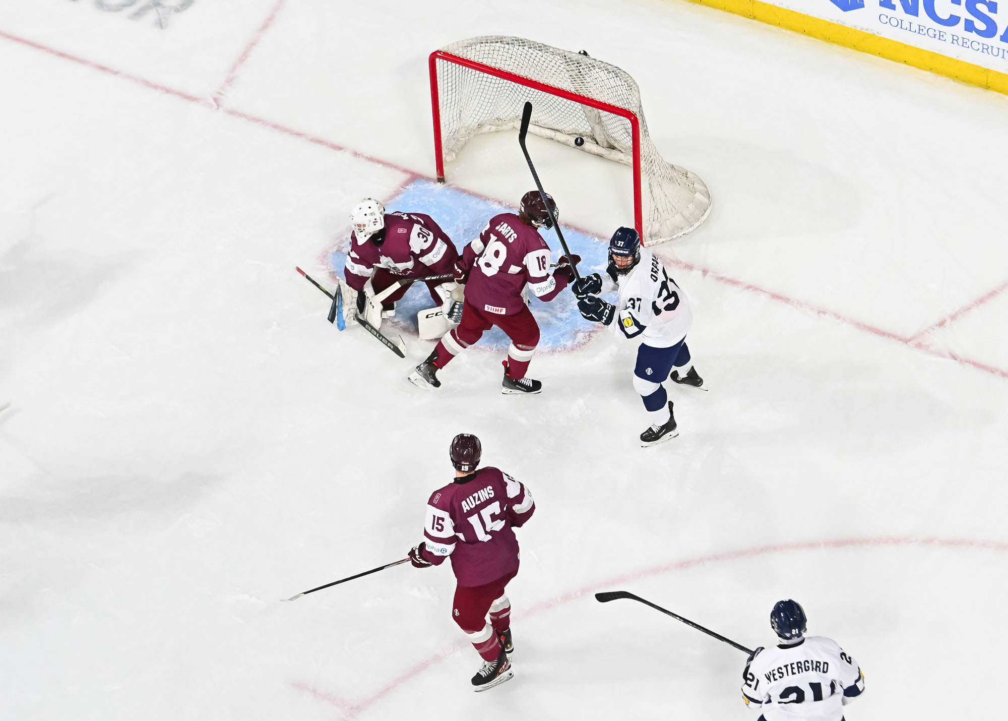 Teams exchanged two more quick goals. Finland went up at 5:40 on a quick pass across the crease from Westergard to Rasmus Pakarinen, prompting Latvian coach to pull Capars in favour of Ivans Kufterins. Just 64 seconds later, Latvia tied it again. Reinis Auzins was in the slot to claim a loose puck, and he snapped another high shot past Kerkola.