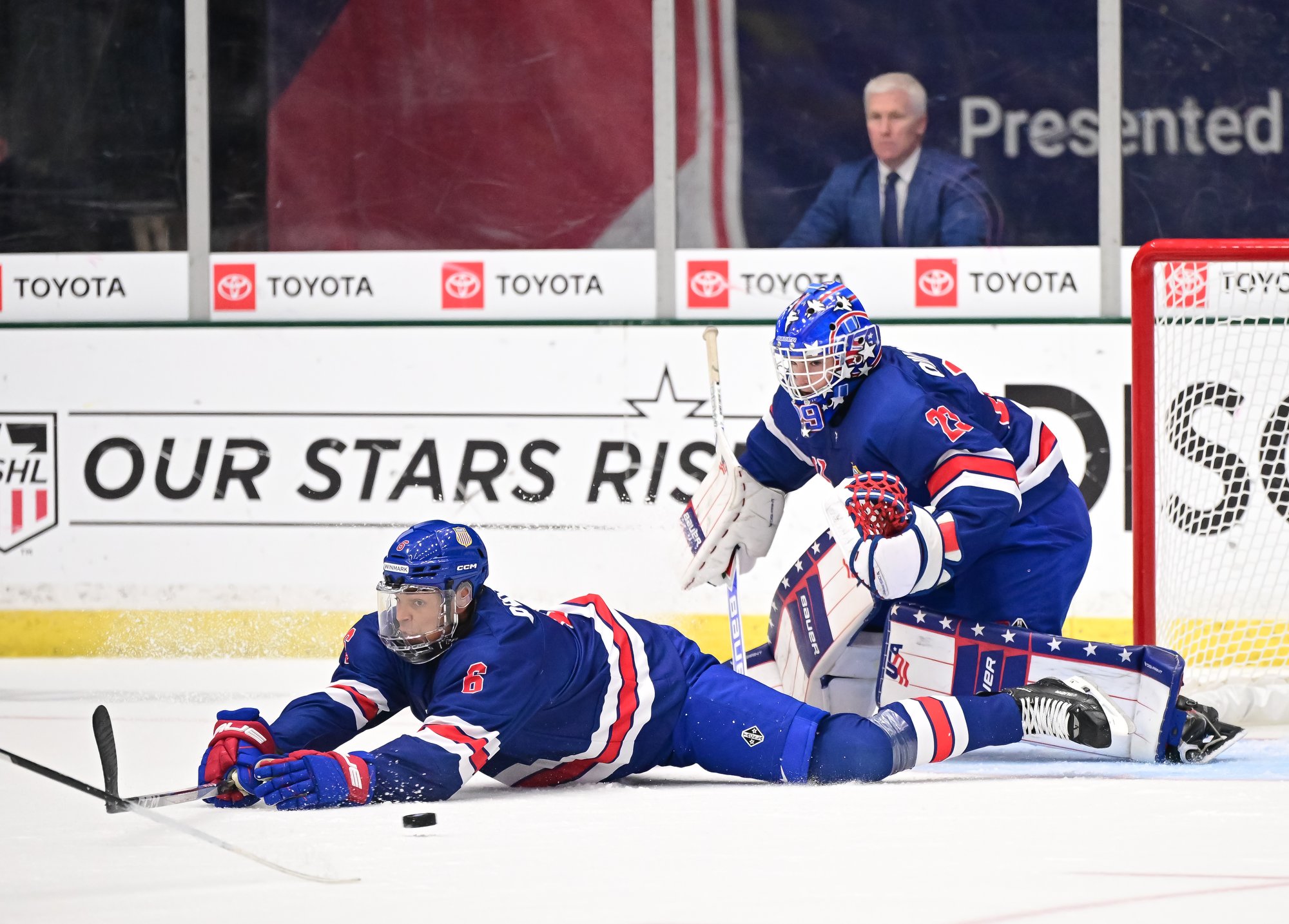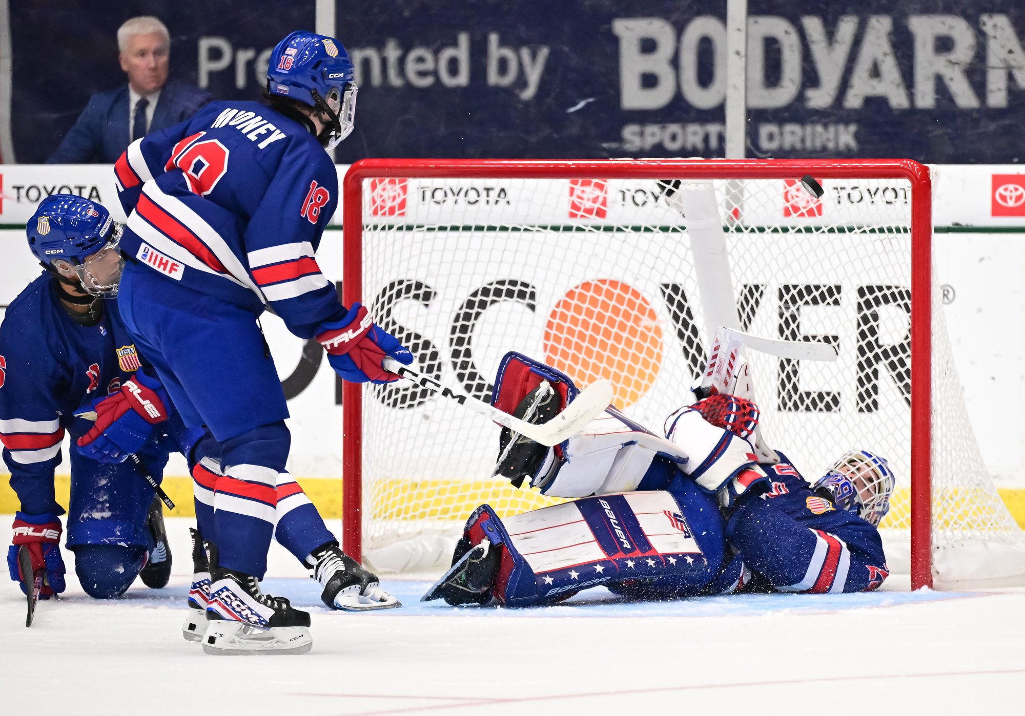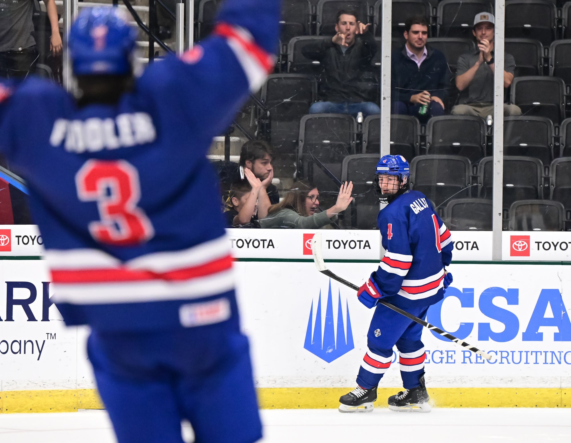 The Americans finally settled down and played NDTP-quality hockey, scoring twice in 70 seconds to take their first lead. Will Horcoff’s high shot beat Kaiser, who went down early, at 15:22, and then Gallant converted a short-handed breakaway to make it 4-3 for the U.S.