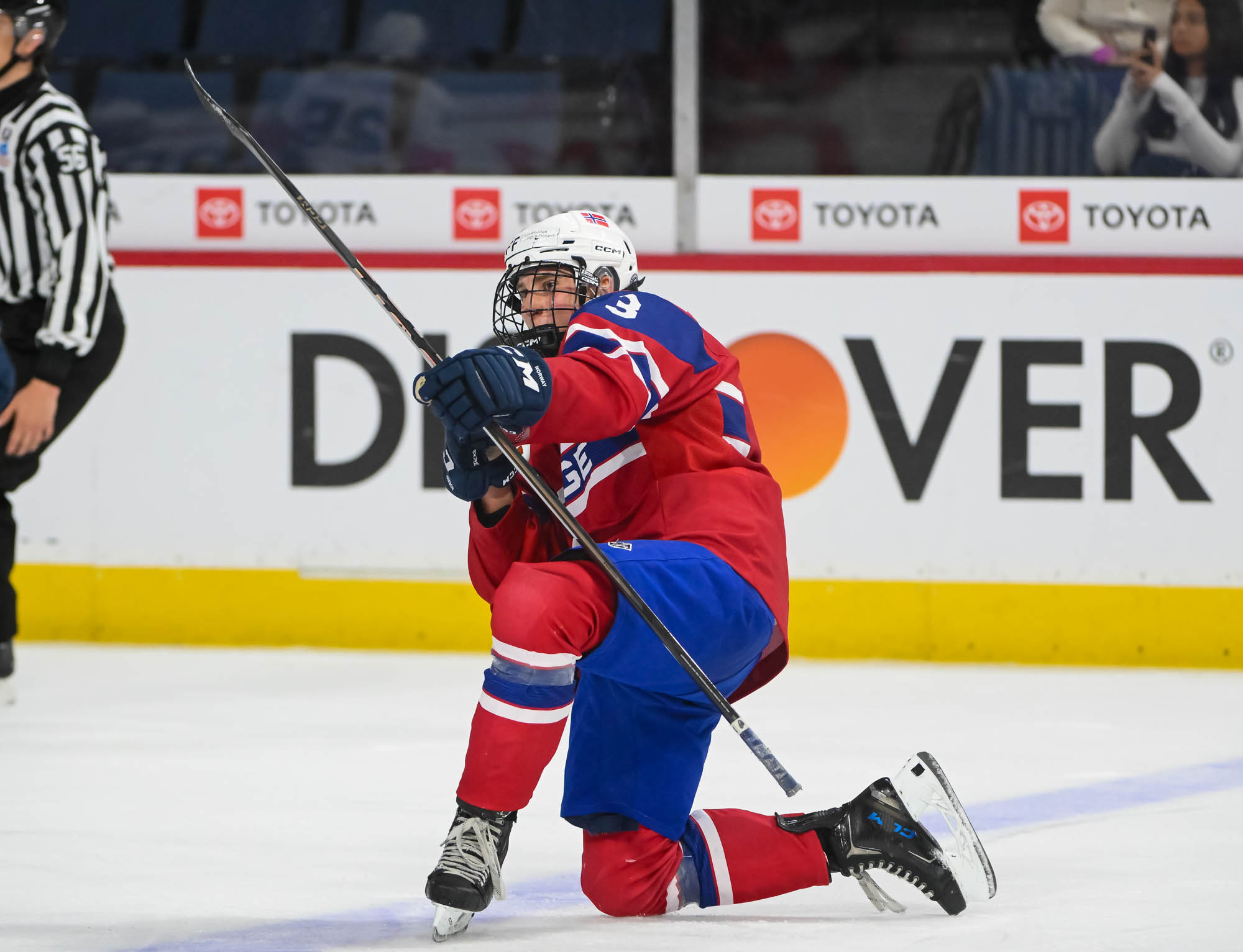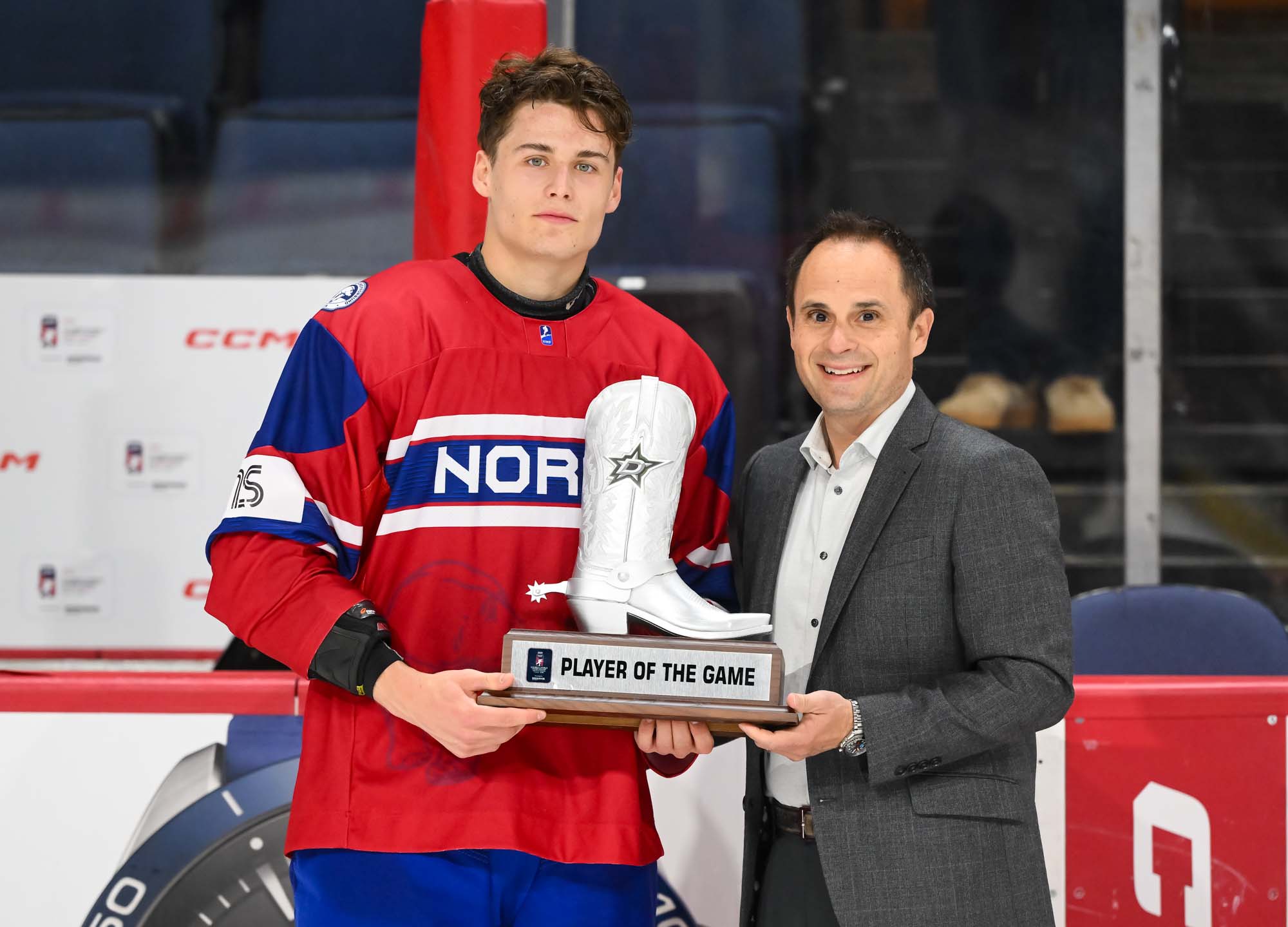 Aaram-Olsen, who had four points in the game, got his second goal – once again on a powerplay – early in the second. He took a pass from Birk Hjelmaas, walked in from the top of the circle, and wired a shot high just inside the post.