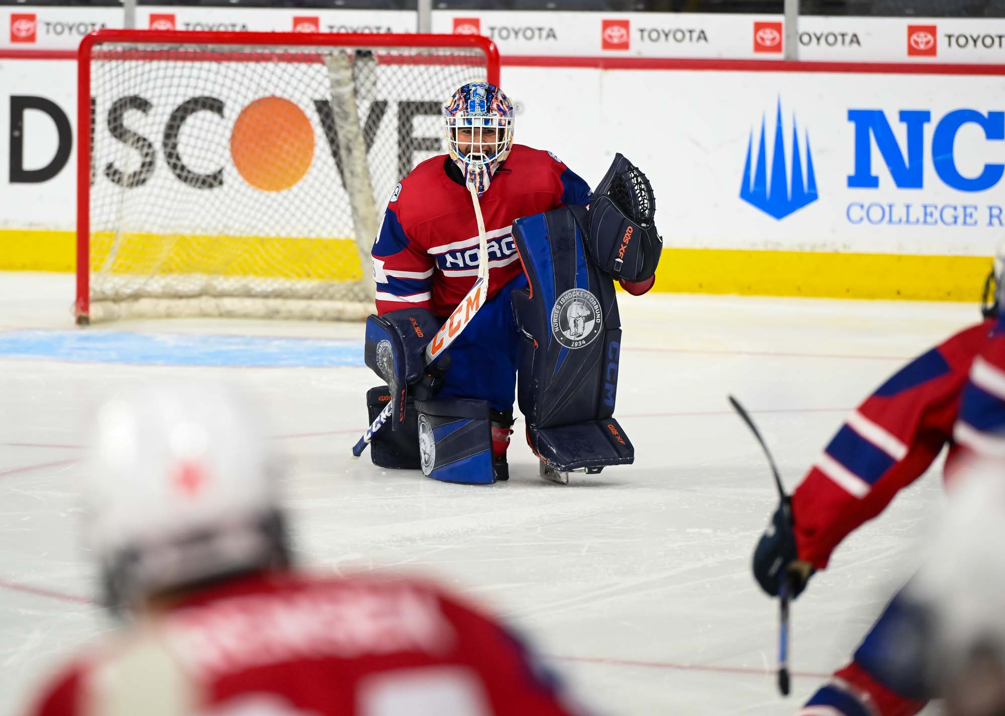 With under five to play in the first, Aaram-Olsen made it 2-0 when he took a pass from Eriksen and drove wide and to the net, sneaking the puck past Birchler.