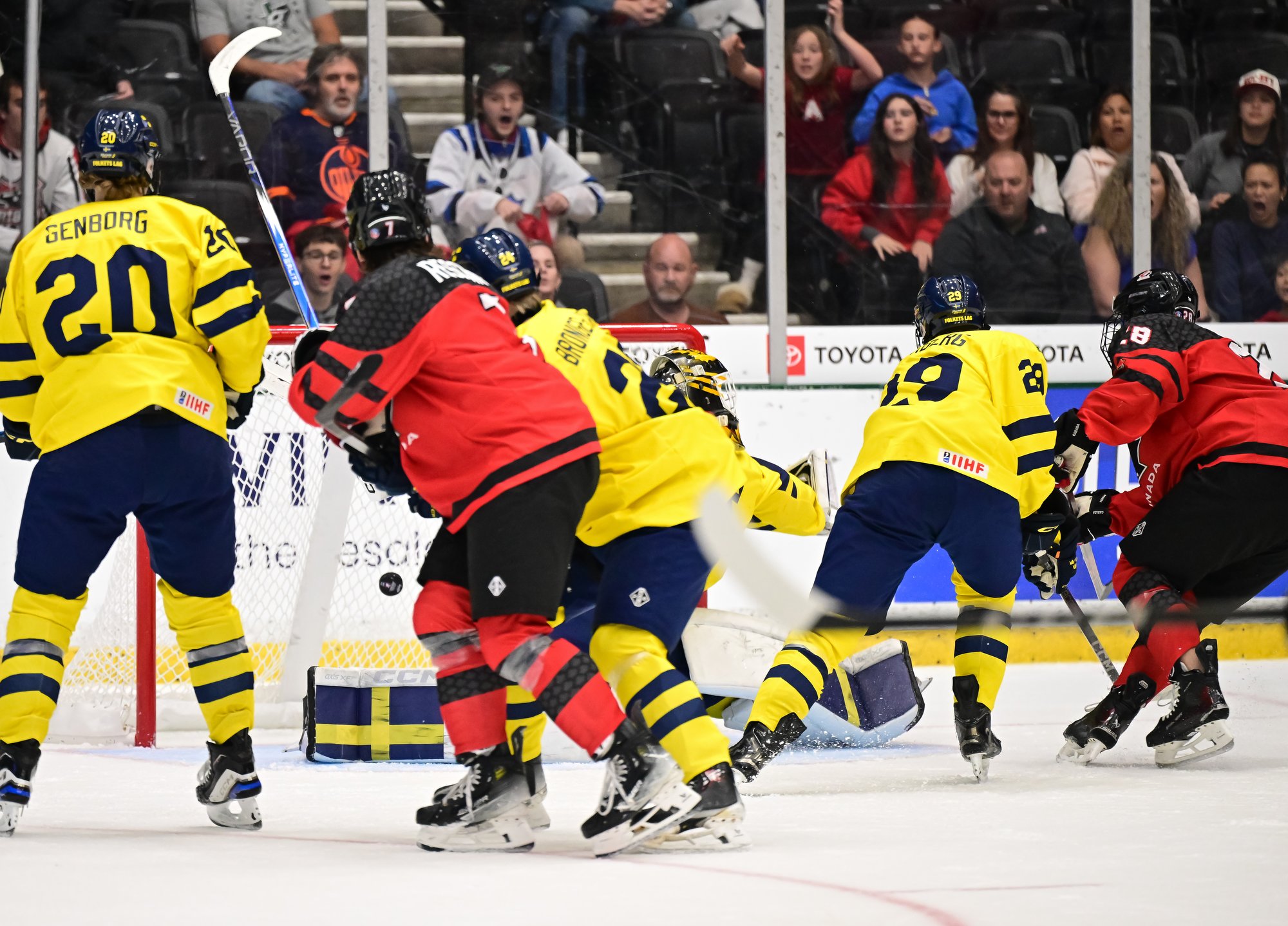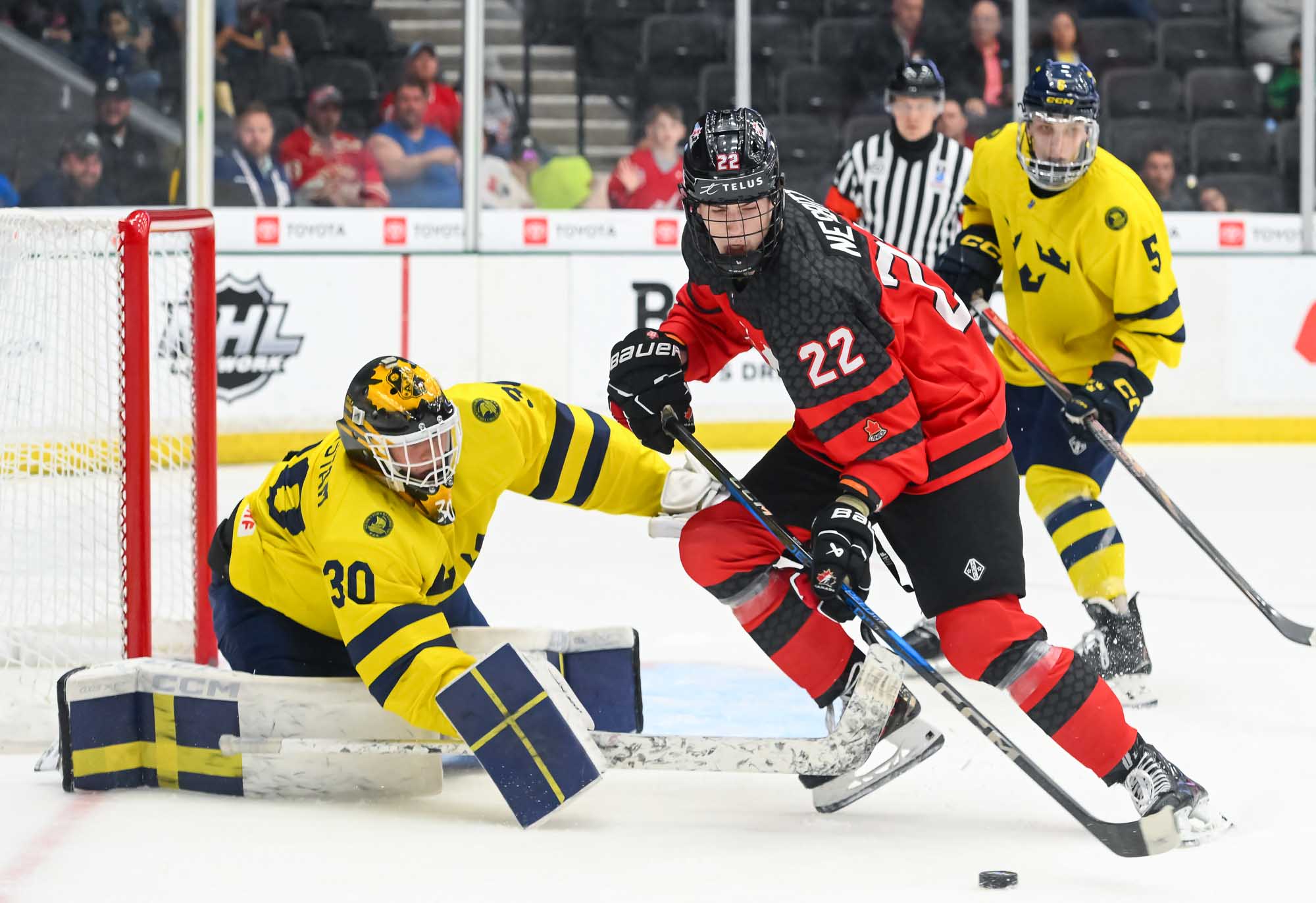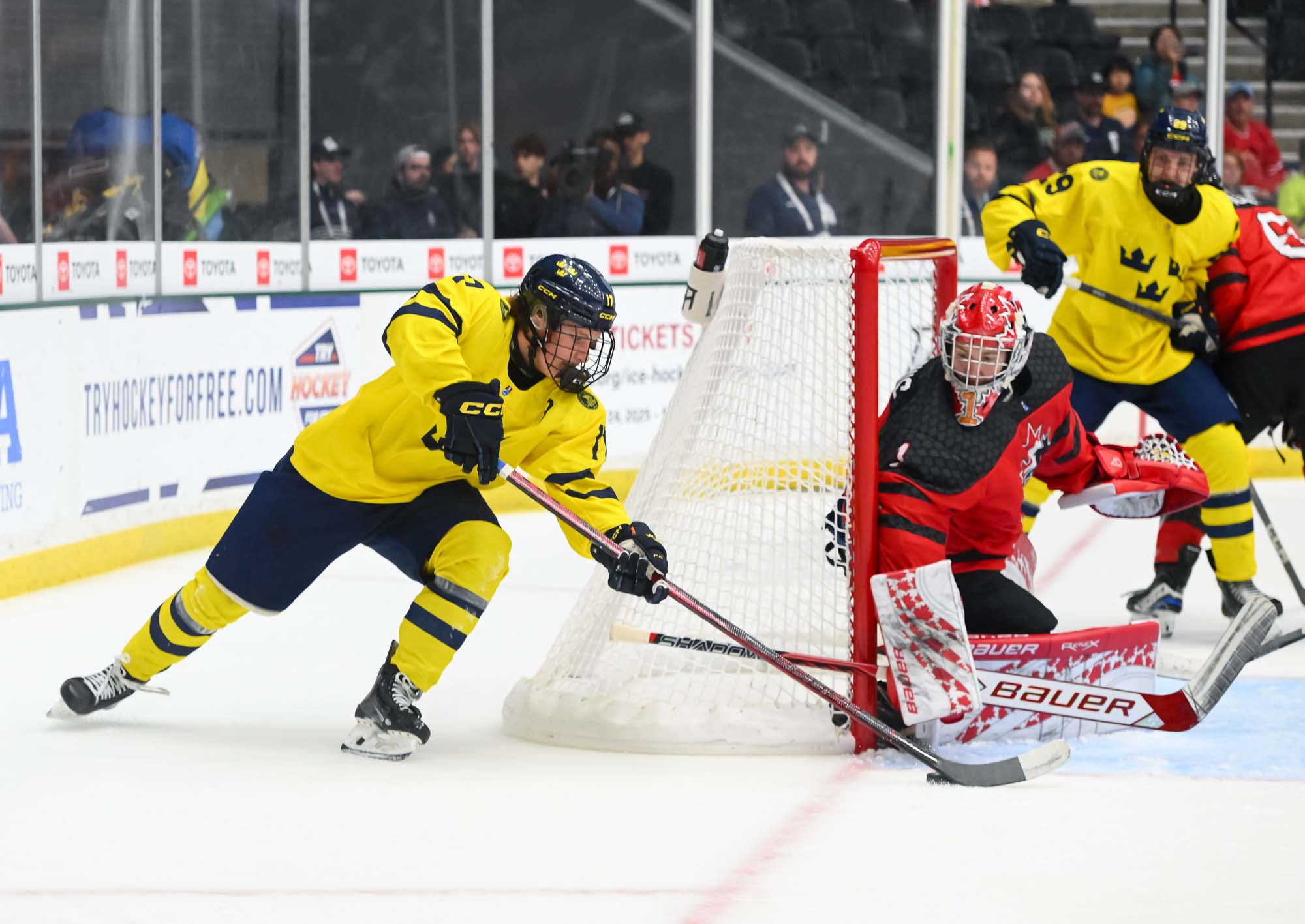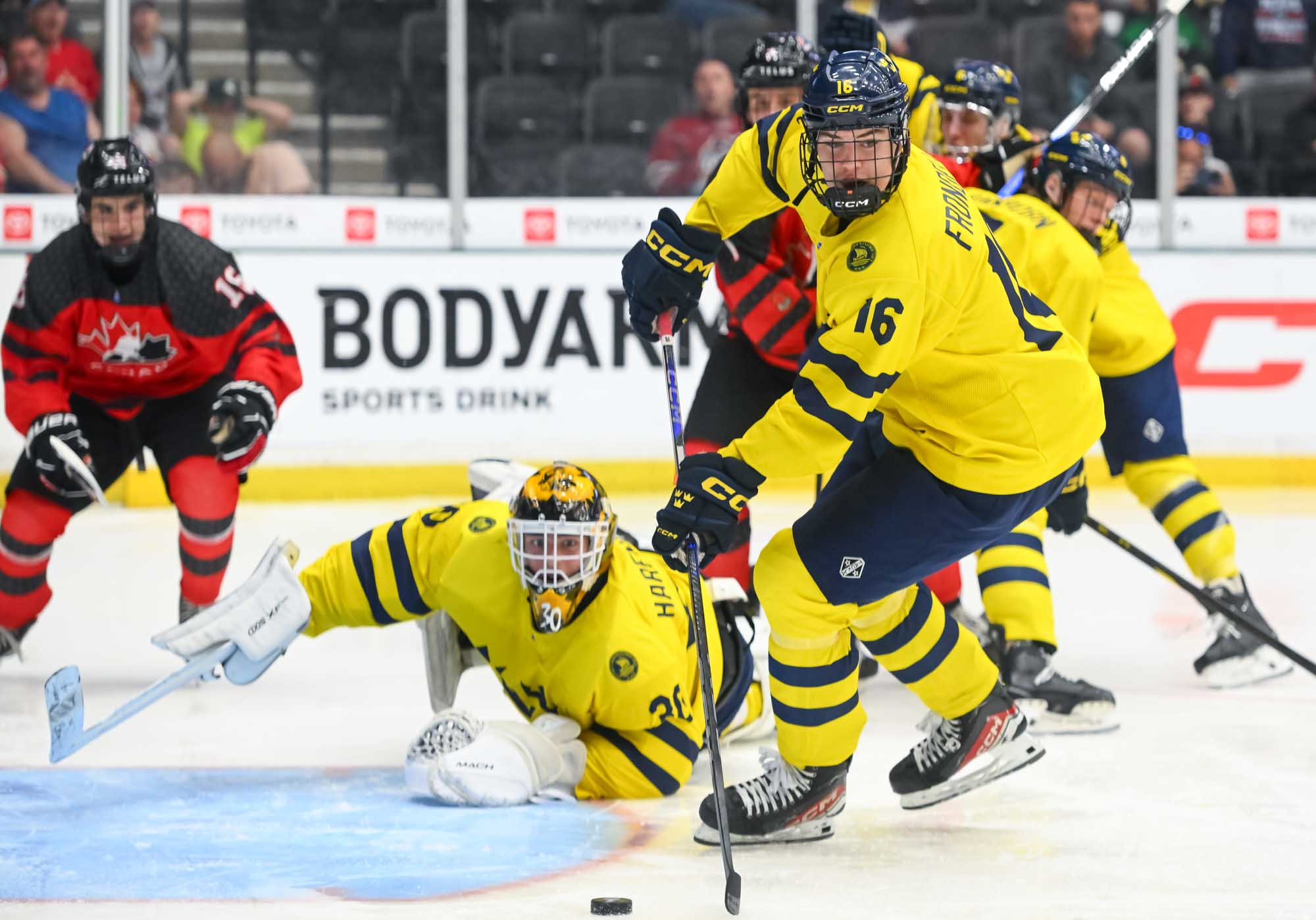 Canada jumped into an early 2-0 lead and relied on Ivankovic in goal to do his usual thing—stop pucks. The game was barely four minutes old when Milton Gastrin had the puck slide off his stick in his own end. It rolled right to defender Xavier Villeneuve, and his long shot beat Love Harenstam under the glove. It was the 11th goal by blueliners for Canada in the tournament (compared to two for Sweden).