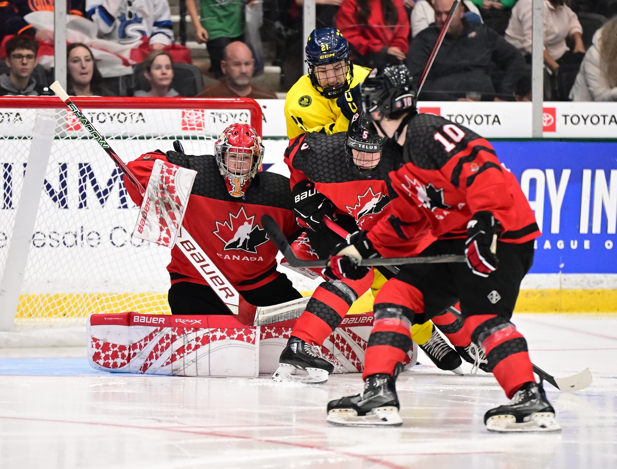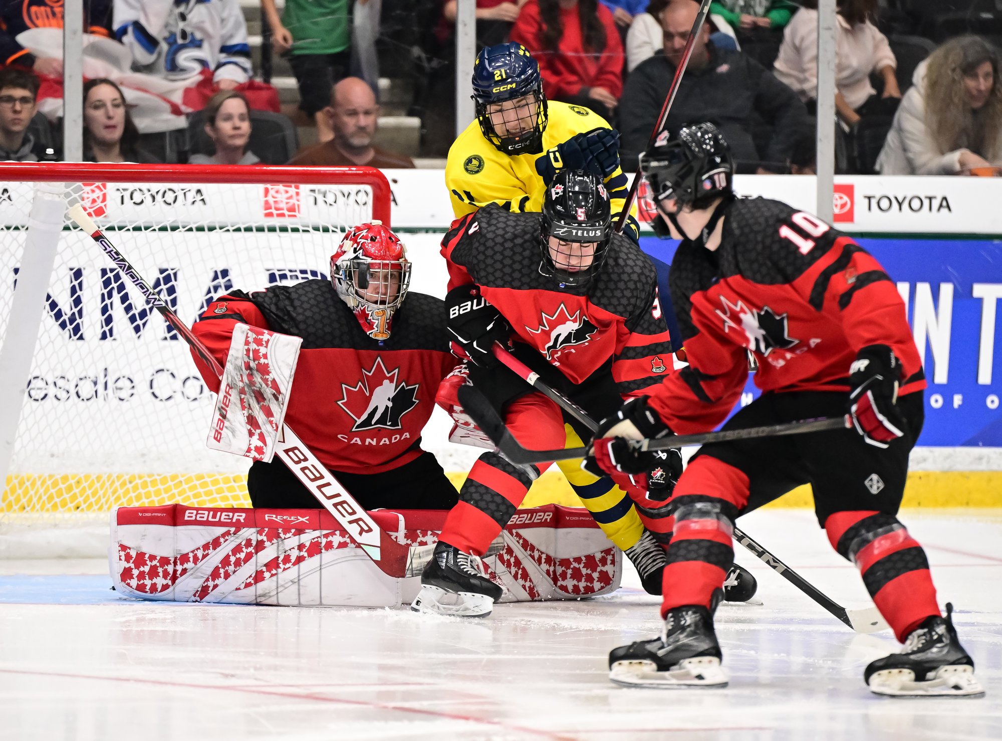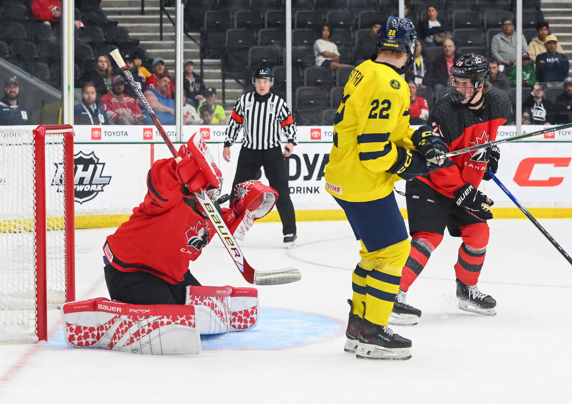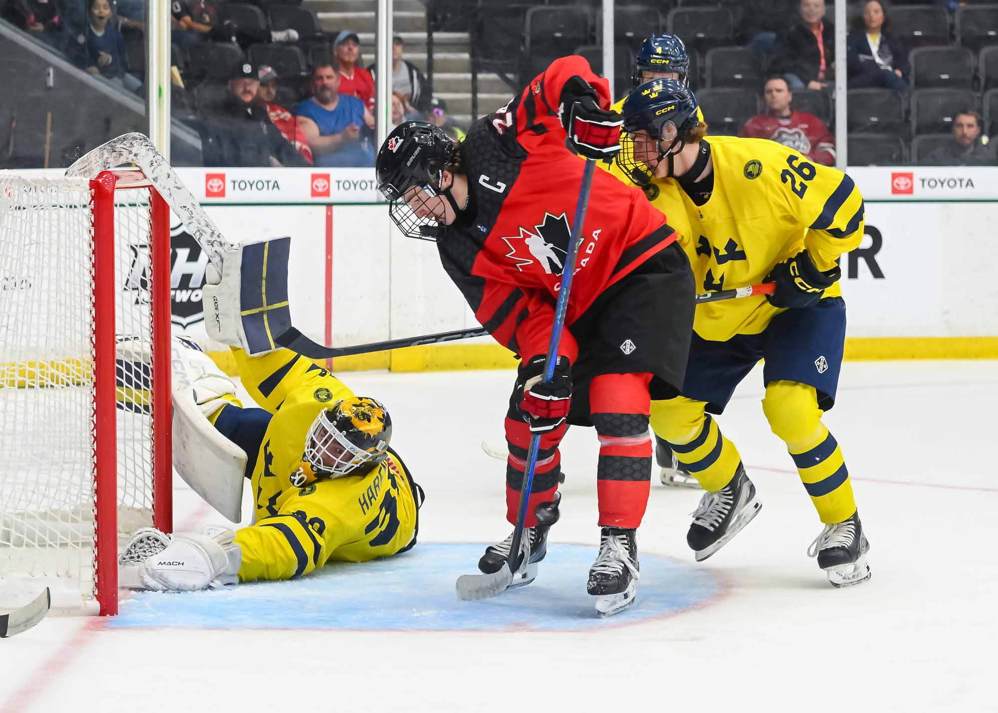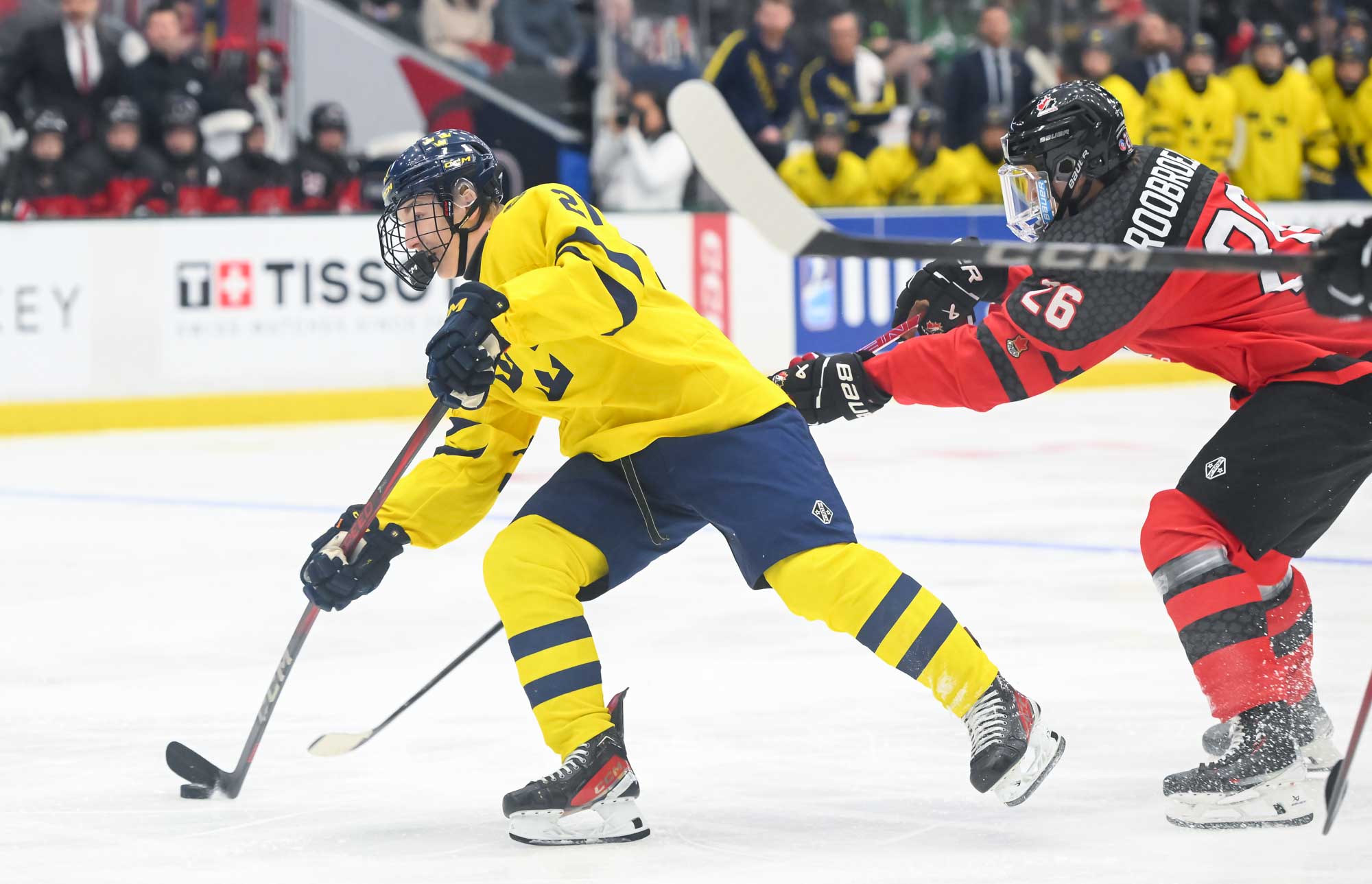 Canada jumped into an early 2-0 lead and relied on Ivankovic in goal to do his usual thing—stop pucks. The game was barely four minutes old when Milton Gastrin had the puck slide off his stick in his own end. It rolled right to defender Xavier Villeneuve, and his long shot beat Love Harenstam under the glove. It was the 11th goal by blueliners for Canada in the tournament (compared to two for Sweden).