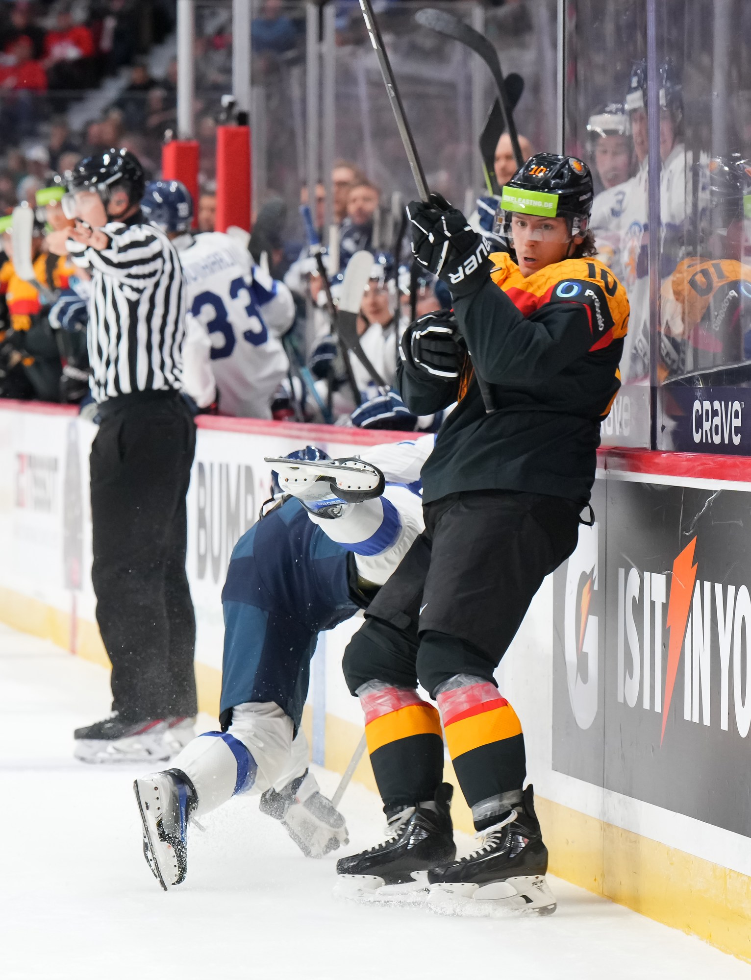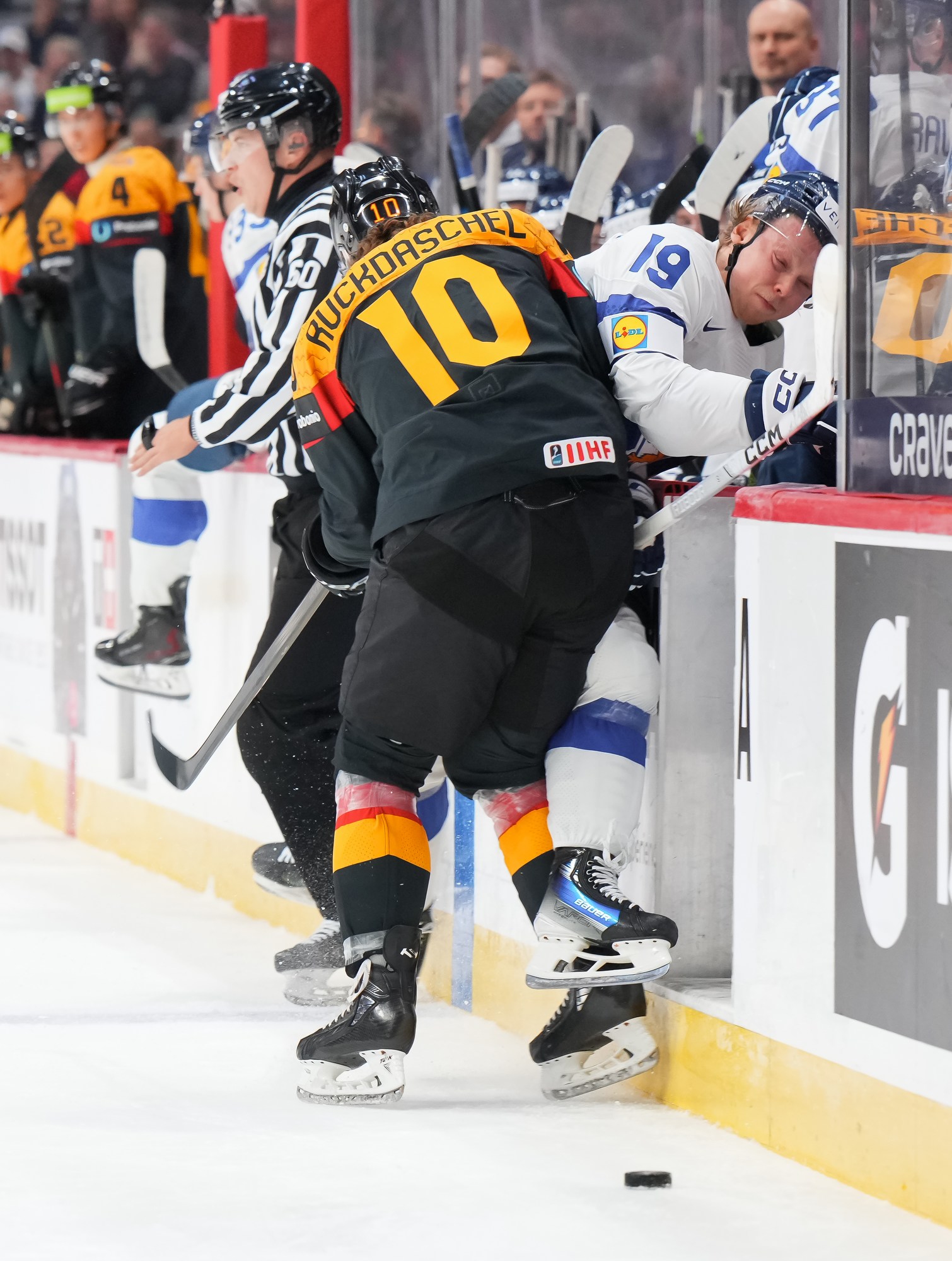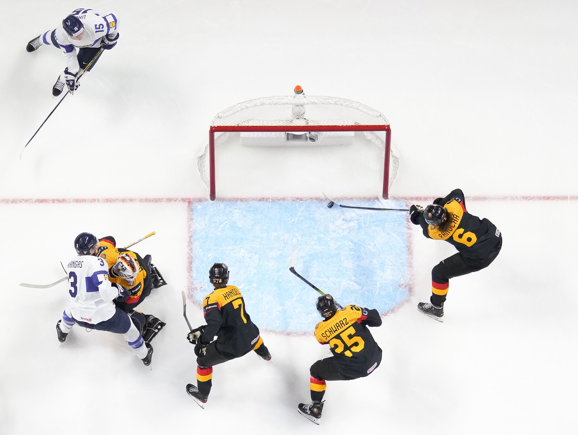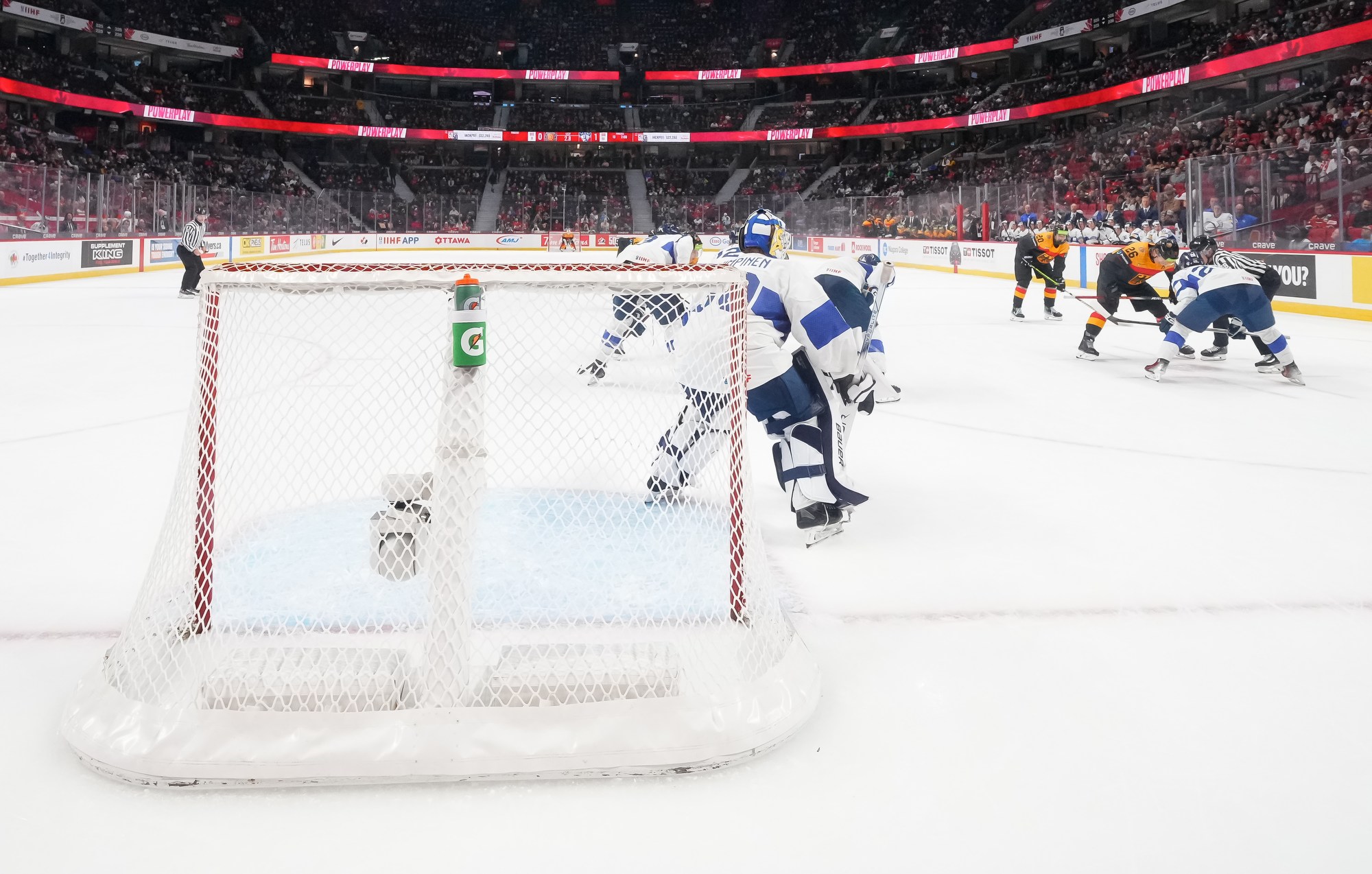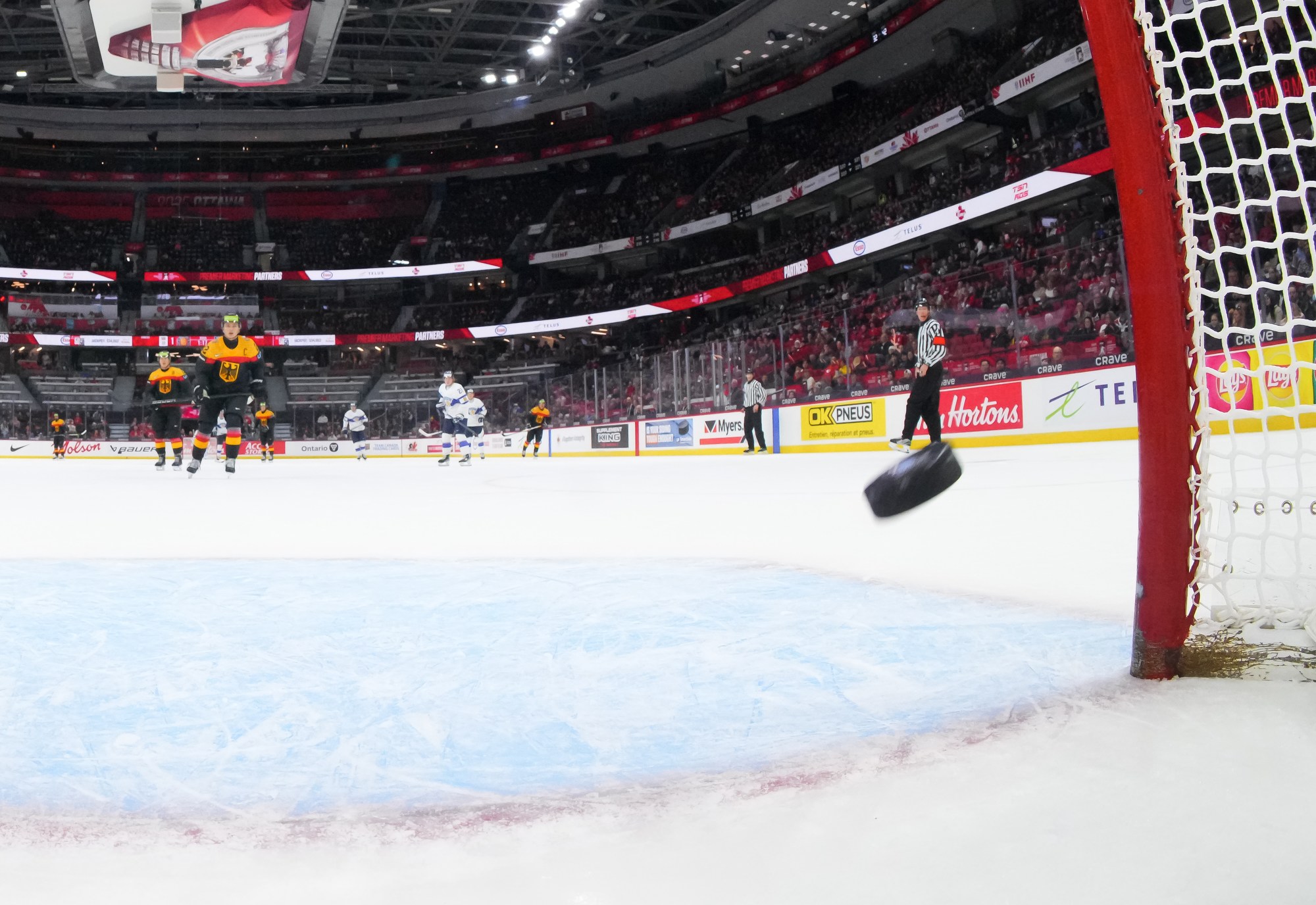 But German coach Tobias Abstreiter thought the play was offside and challenged. Officials, however, confirmed the call on ice and penalized the Germans for delay of game. They killed off the penalty to perfection and then replied with a goal of their own.