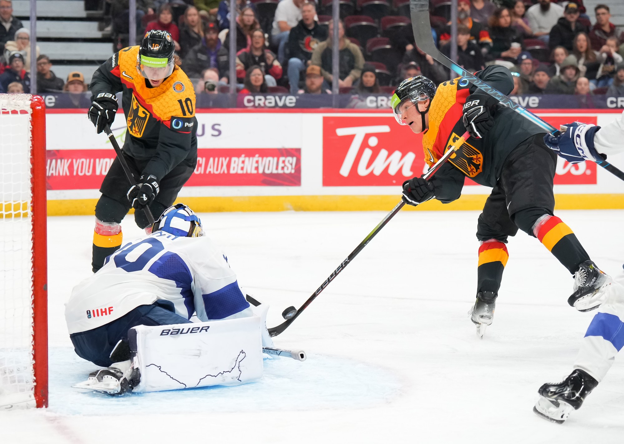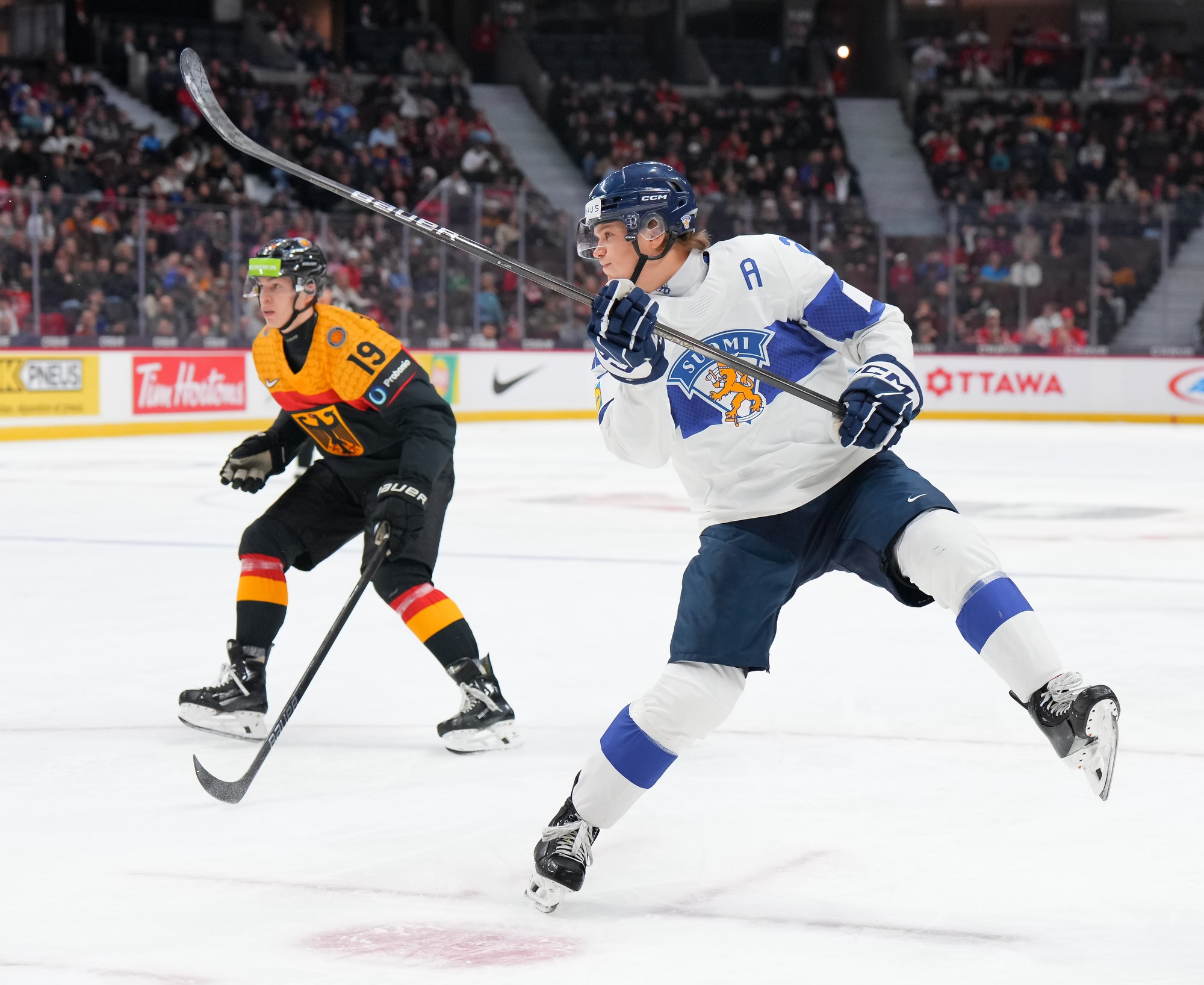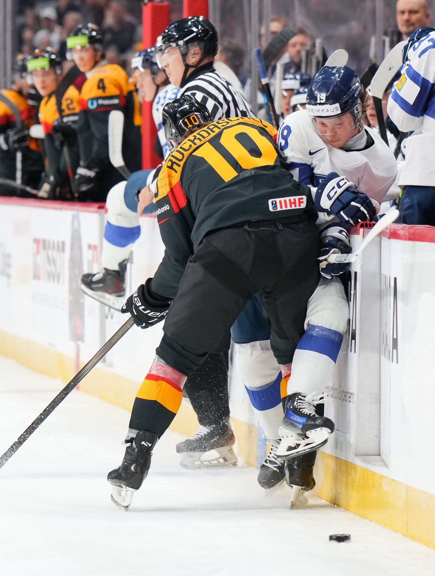 Julius Sumpf had two excellent chances for the Germans in the opening period but came up empty. He made a nice steal at his blue line and went in alone, only to blast a shot wide. Near the end, he outwitted a Finnish player from the slot but again couldn’t convert.