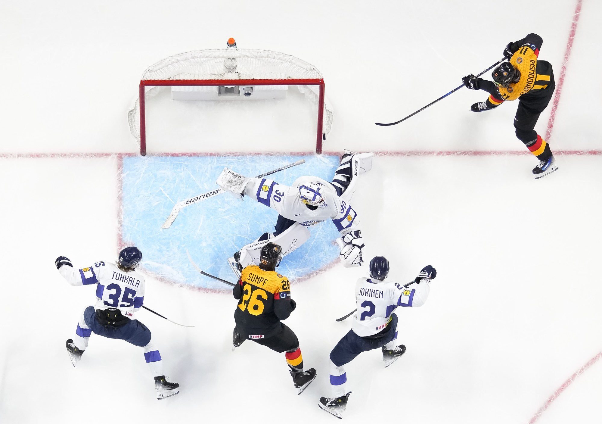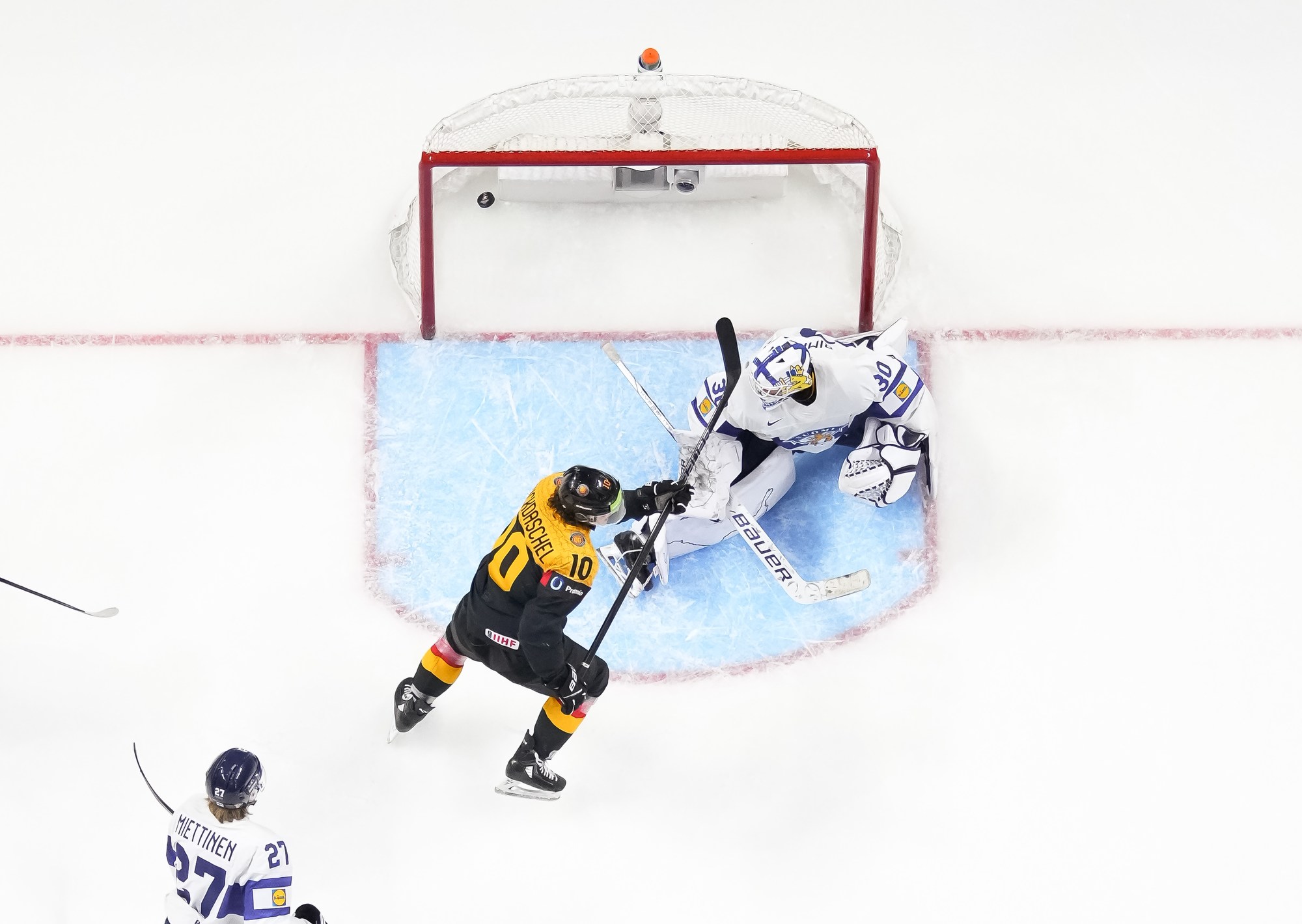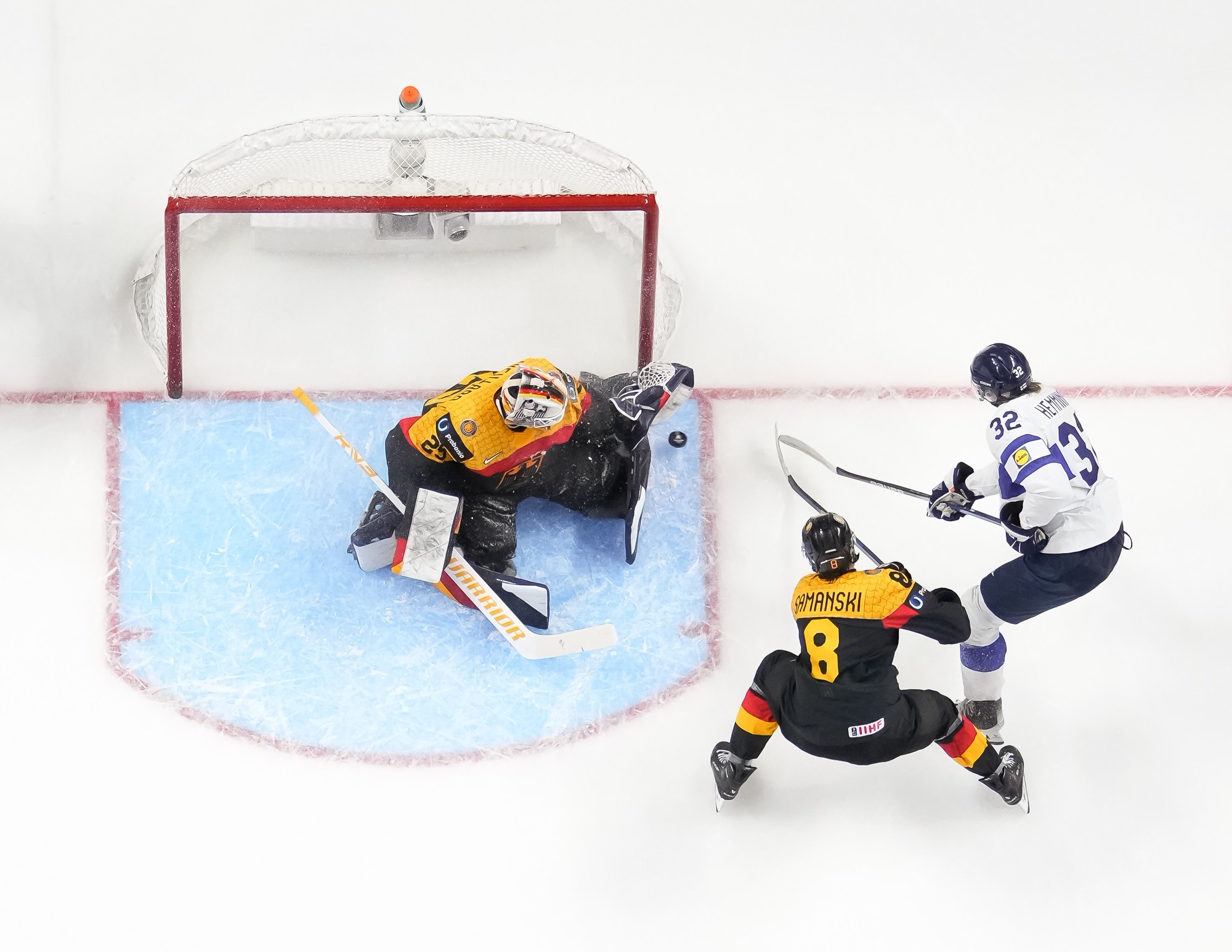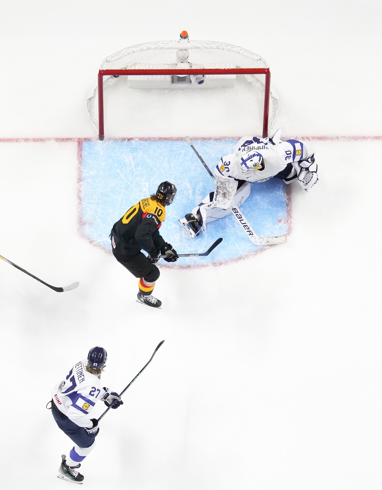 Germany had a great chance to tie the game midway through the third. Simon Seidl had the puck alone in front, but he was in tight and didn't have much room to make much of a move on Rimpinen. That was as close as Germany got. Jesse Kiiskinen added an empty netter at 18:43 to seal the victory for Suomi.
