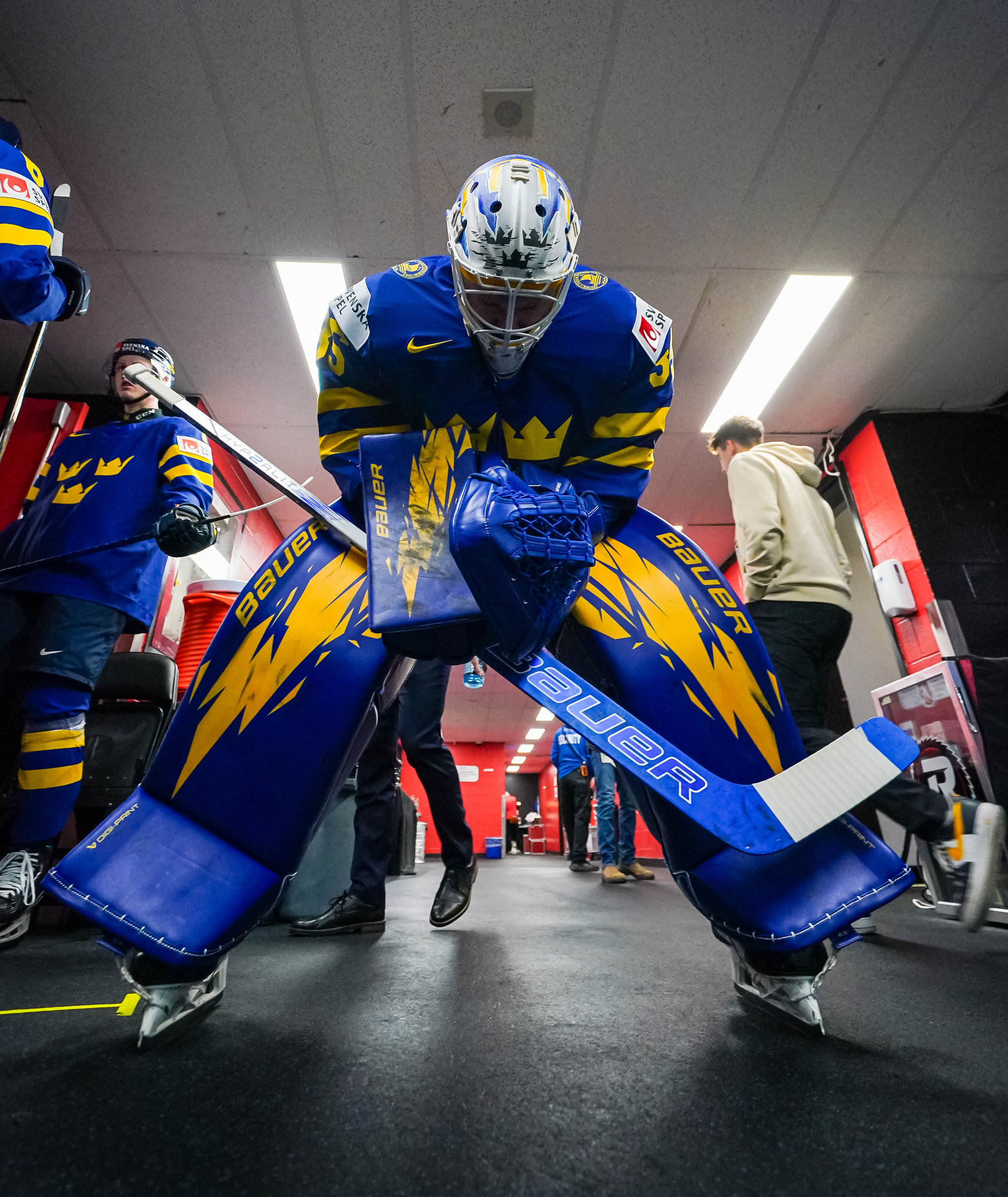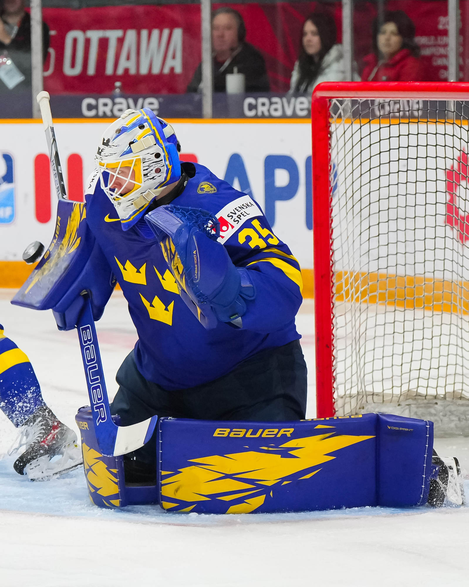 Felix Unger Sorum made it 3-1 at 18:17, going bar down from the right faceoff circle. At 18:47, Anton Wahlberg scored the fourth Swedish goal, going to the net to take a Felix Nilsson feed and kicking the puck up to his stick before tucking it in.