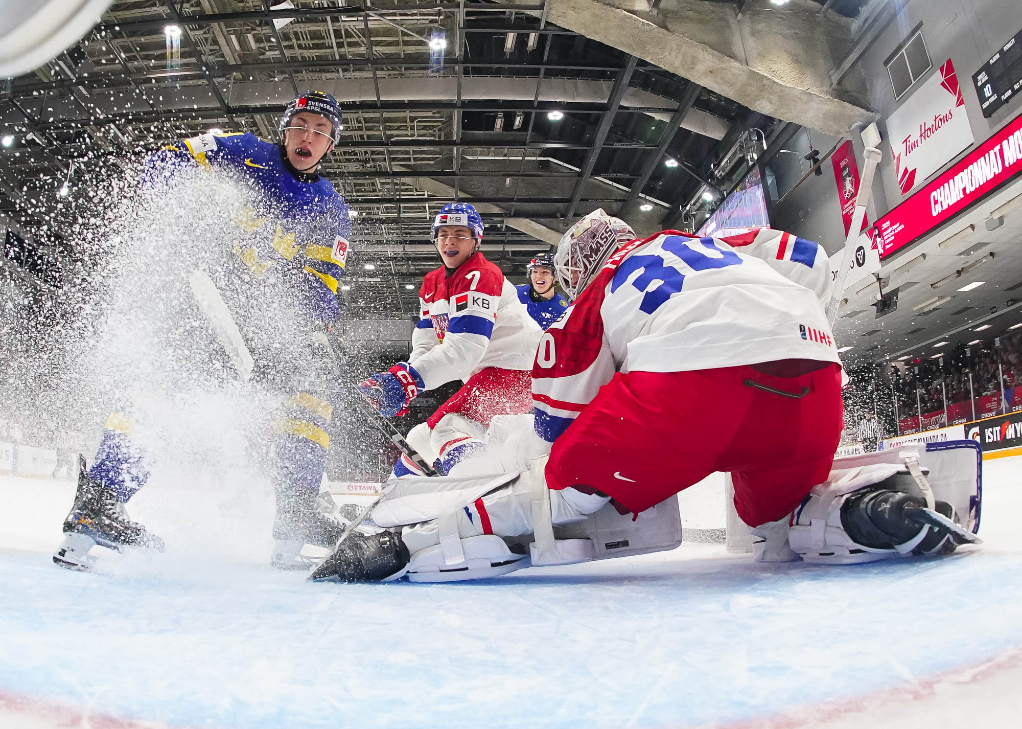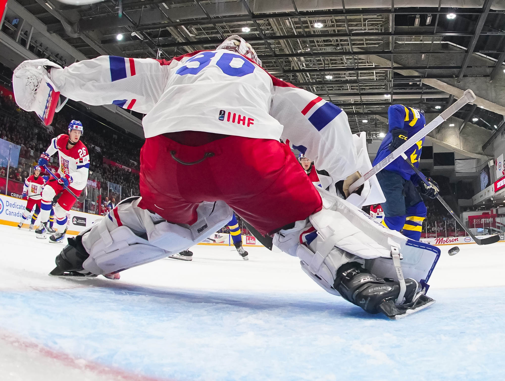 The starting goalies – Czechia’s Michael Hrabal and Sweden’s Melker Thelin – had to be on their toes from the get-go. In a scoreless first period, shots favoured Sweden 16-12. There were, however, few Grade-A chances at either end.