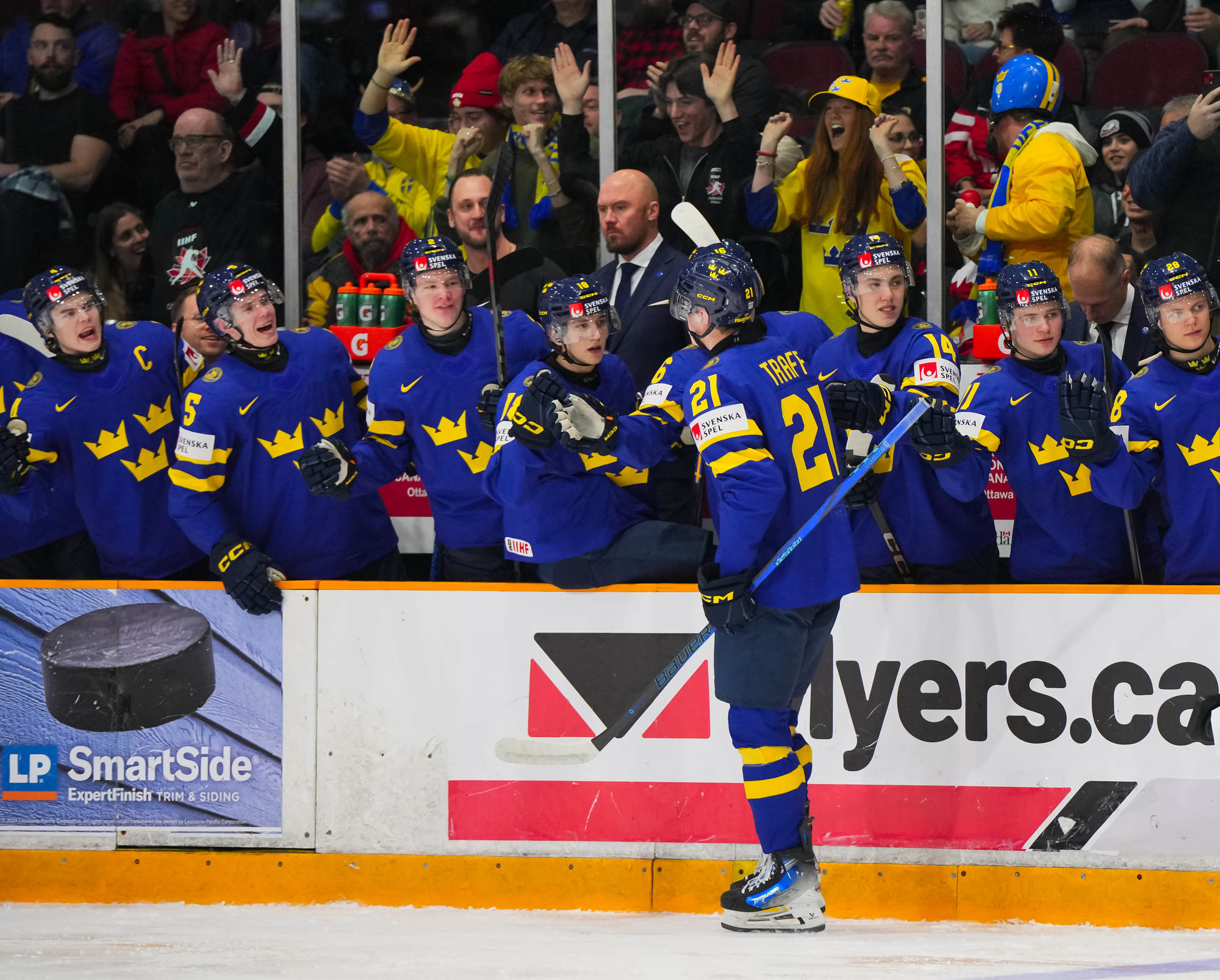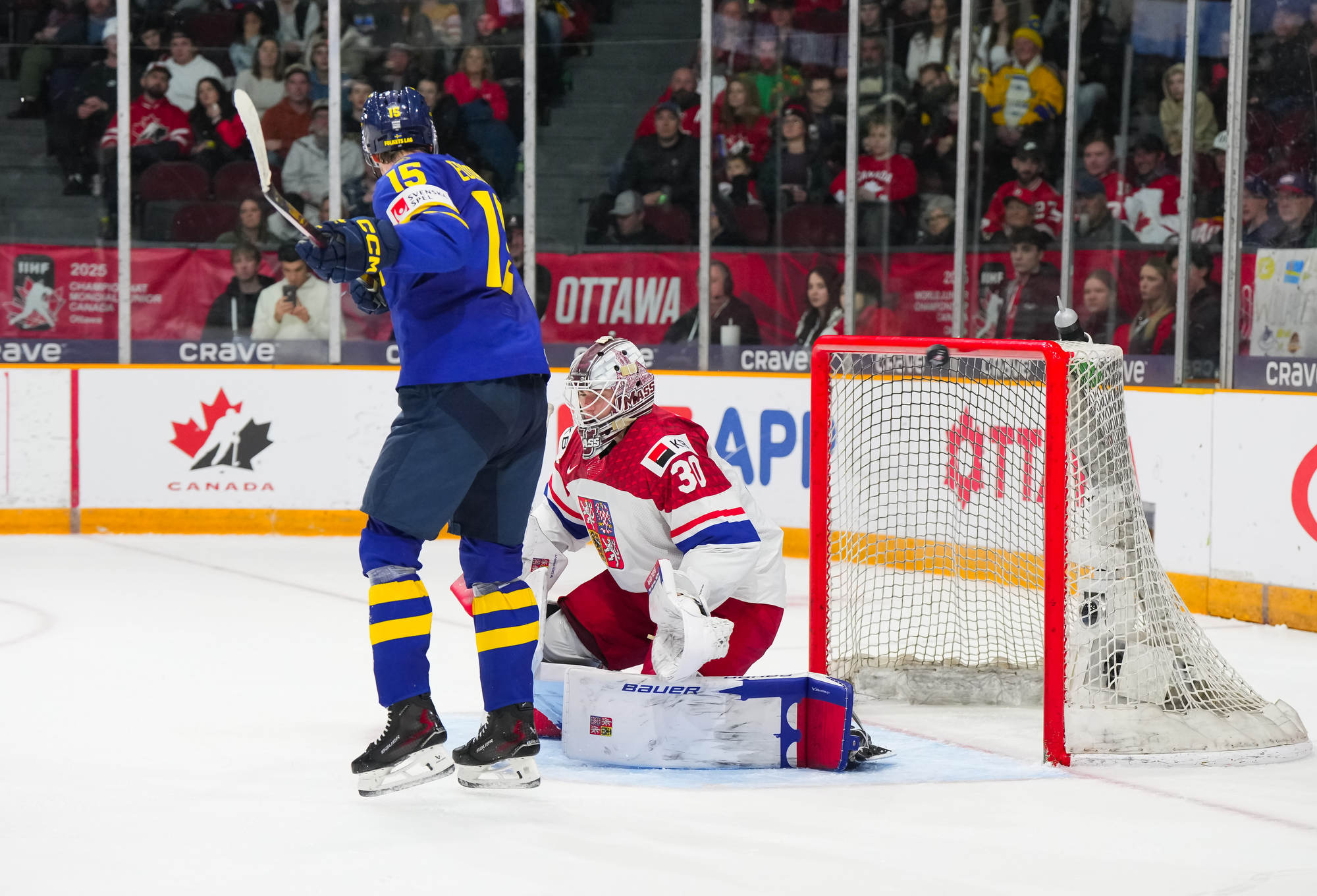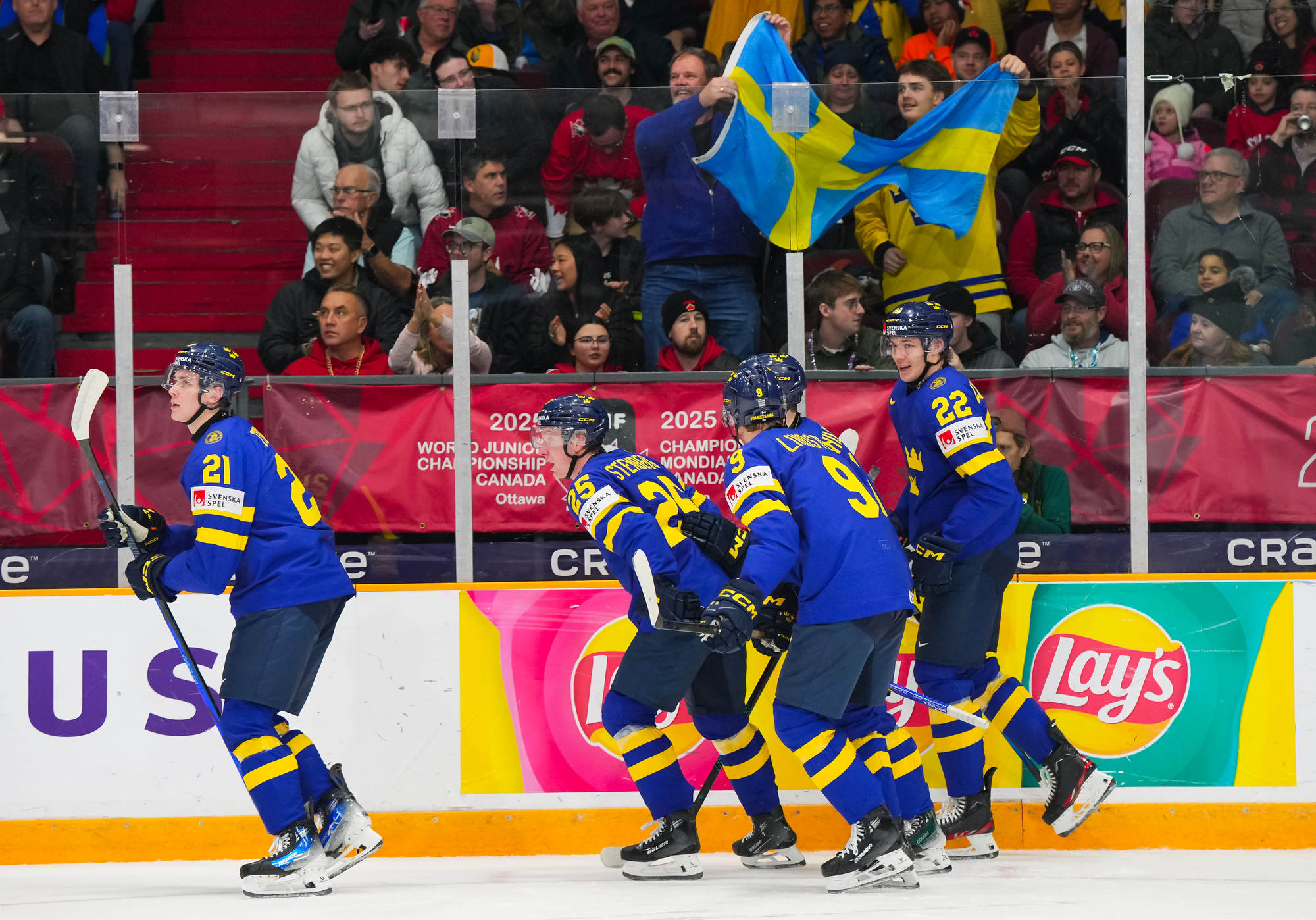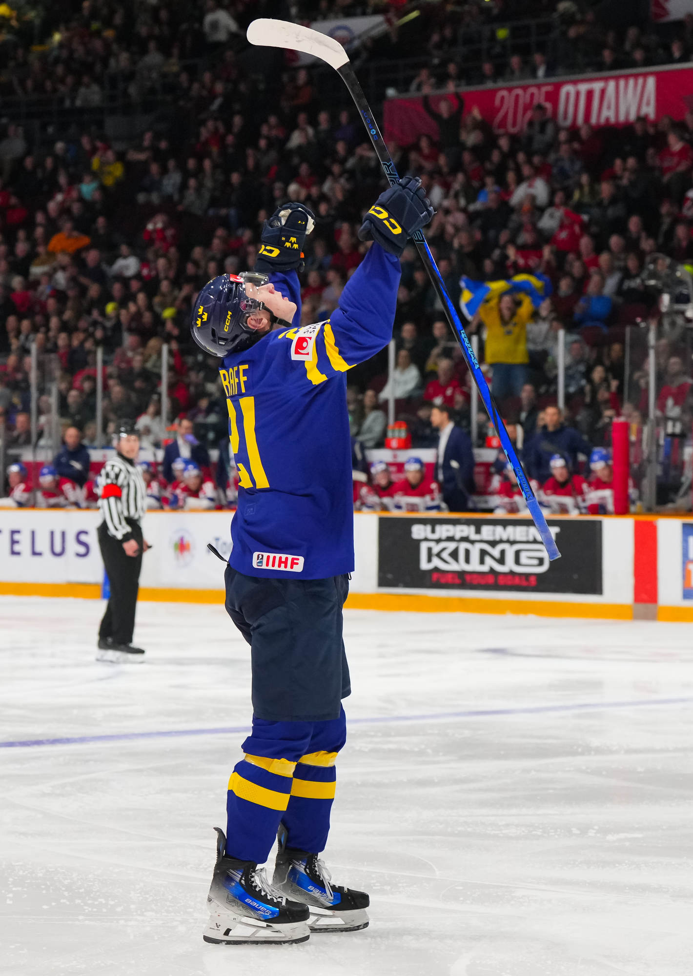 Sweden's Herman Traff (#21) whoops it up after scoring his second goal in a 4-2 victory over Czechia to claim first place in Group B at the 2025 World Juniors in Ottawa.