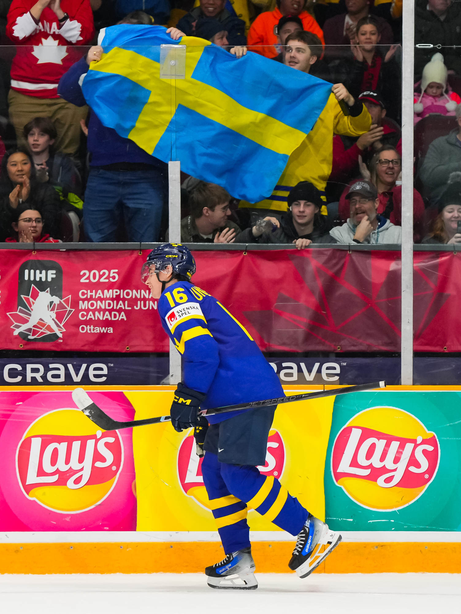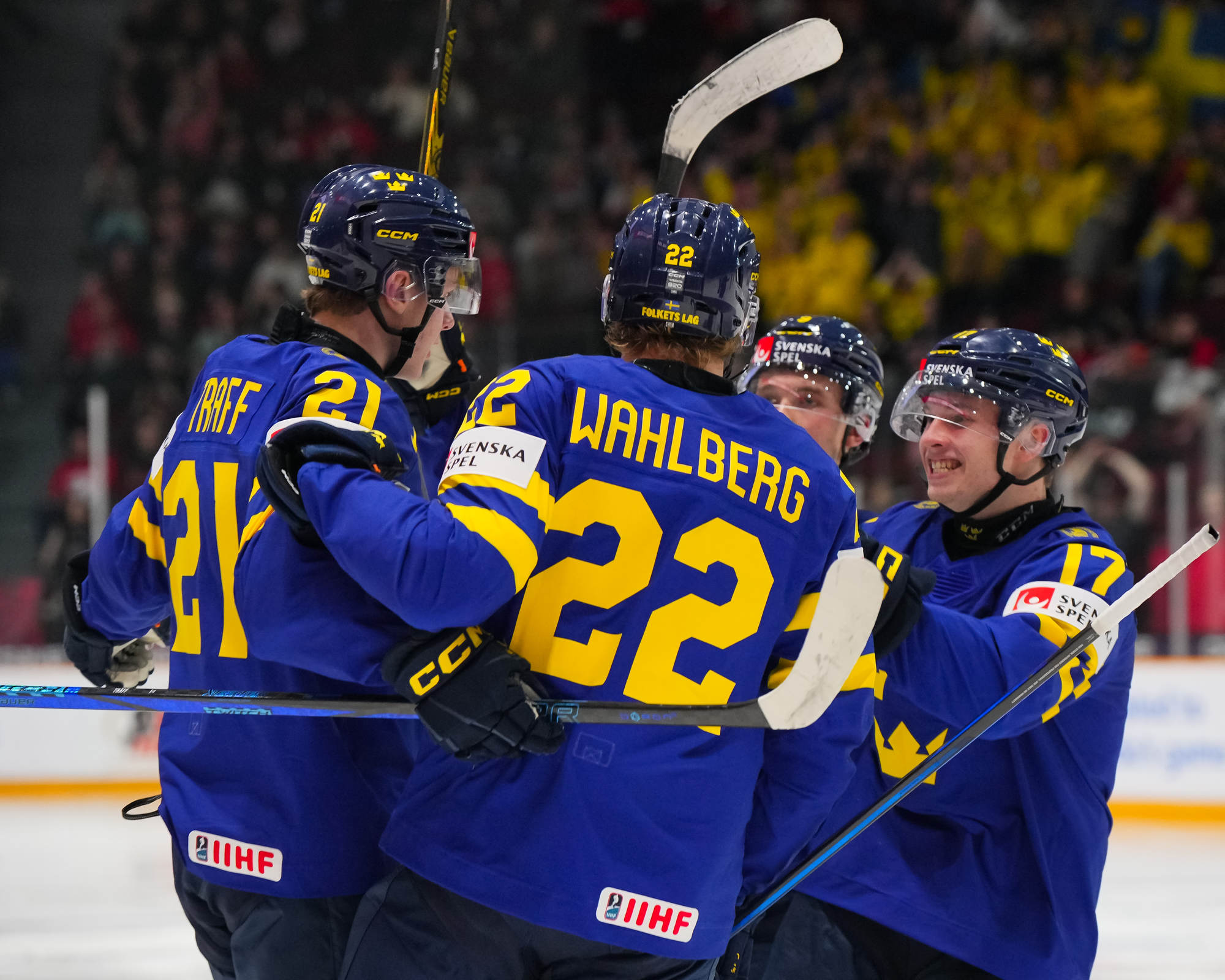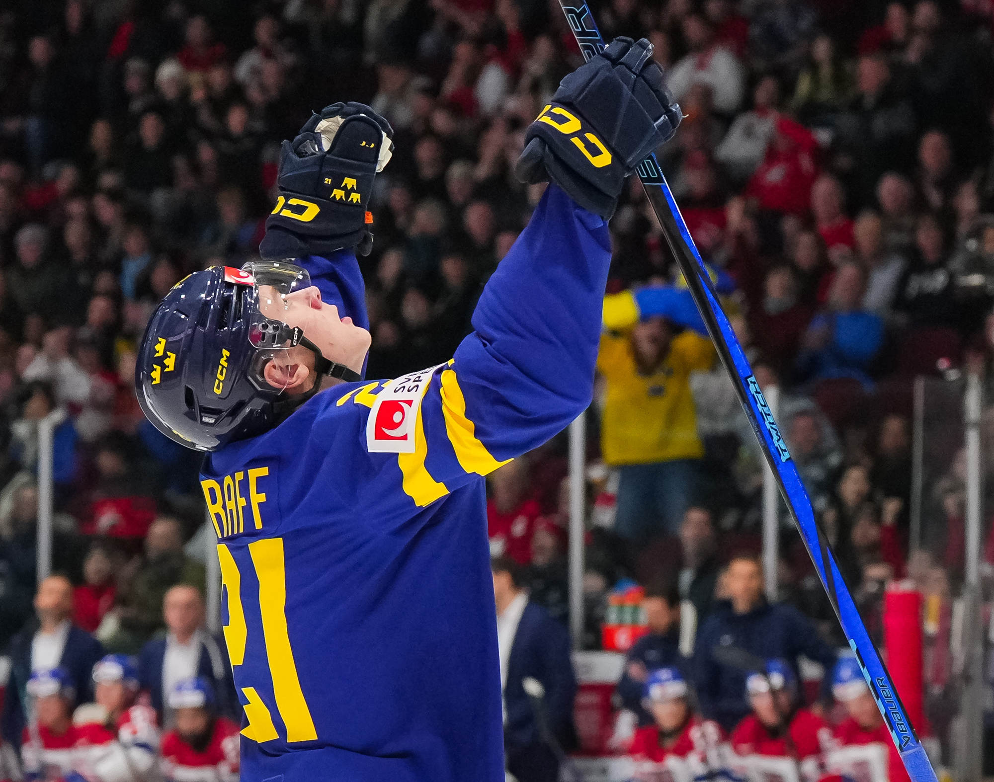 Sweden's Herman Traff (#21) whoops it up after scoring his second goal in a 4-2 victory over Czechia to claim first place in Group B at the 2025 World Juniors in Ottawa.