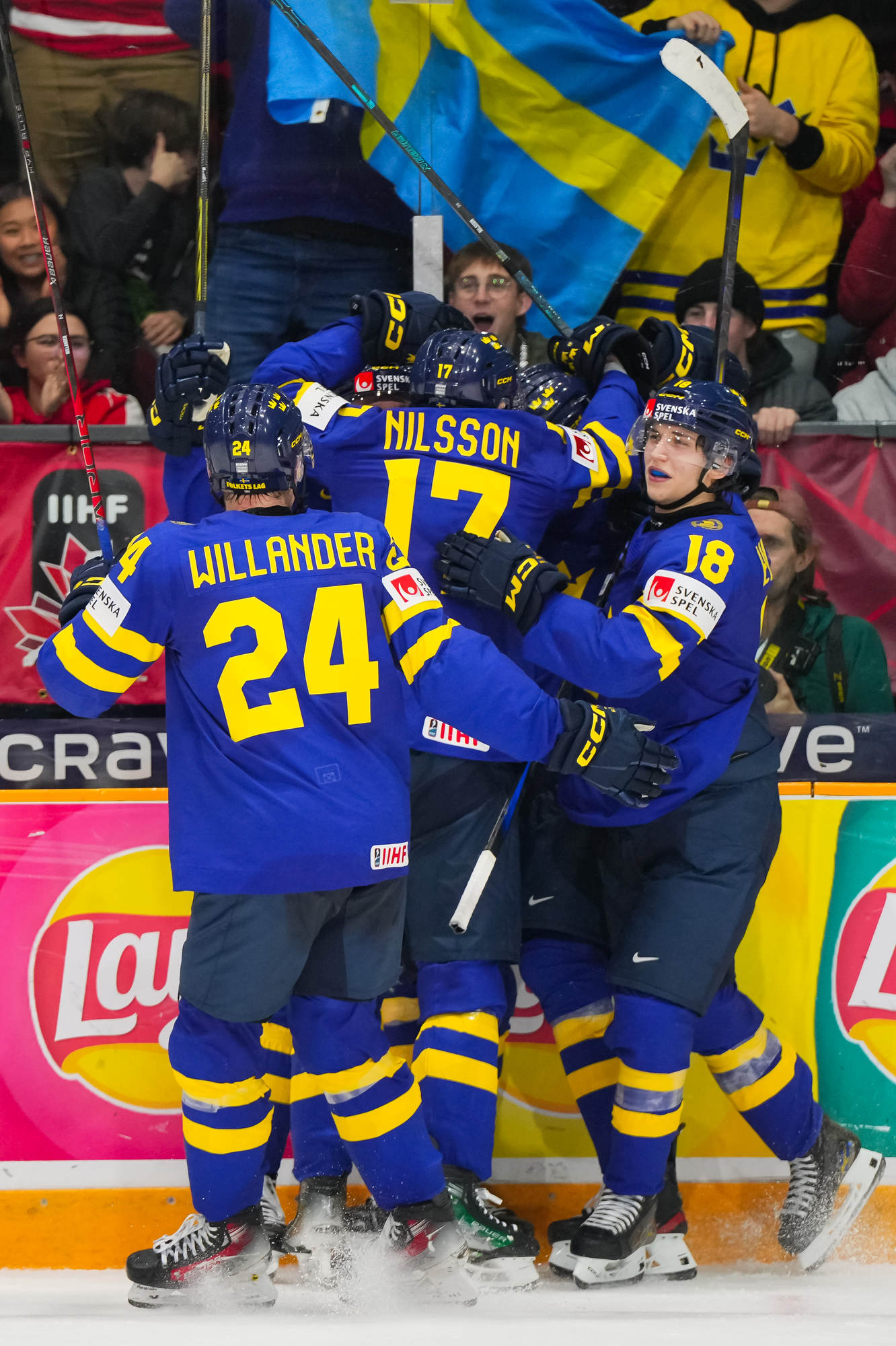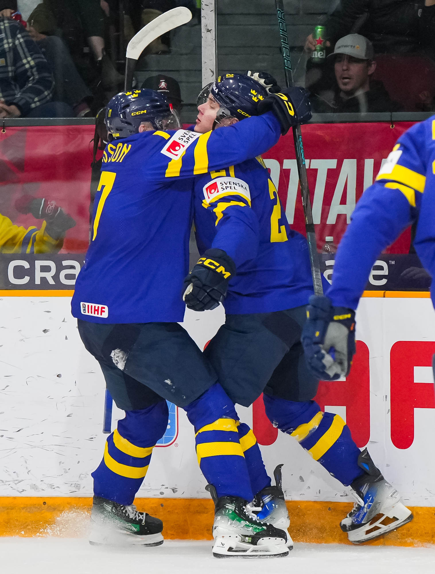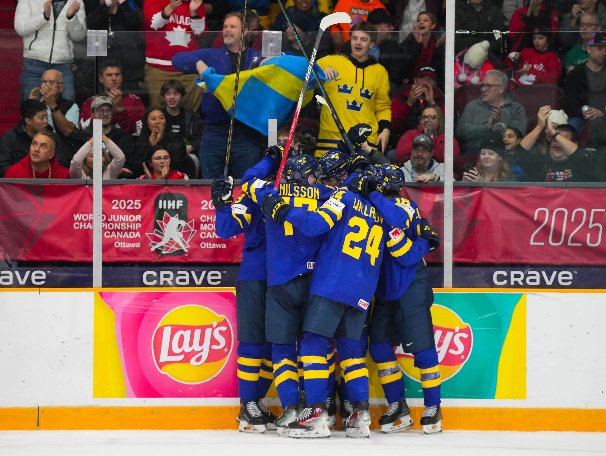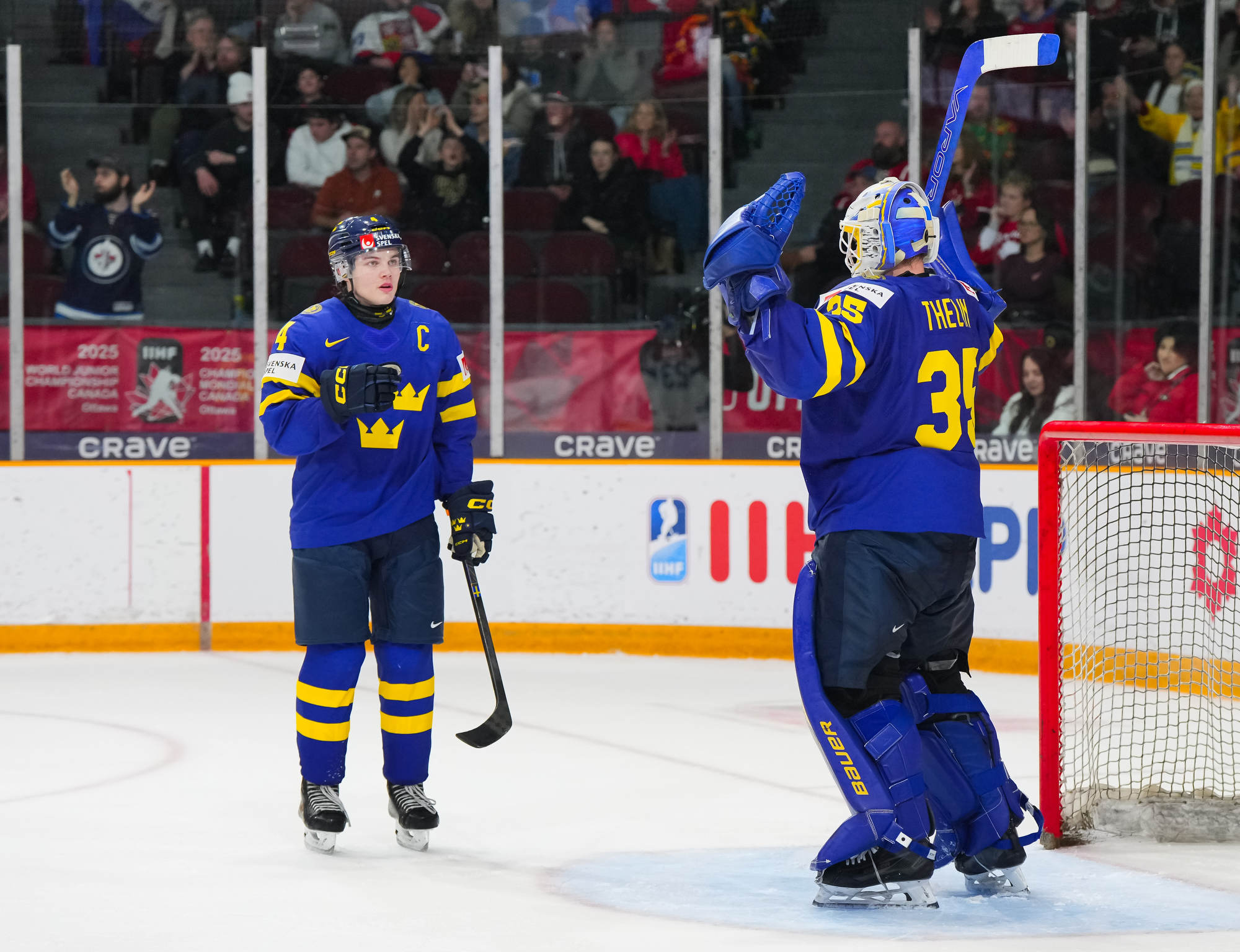 Sweden's Herman Traff (#21) whoops it up after scoring his second goal in a 4-2 victory over Czechia to claim first place in Group B at the 2025 World Juniors in Ottawa.