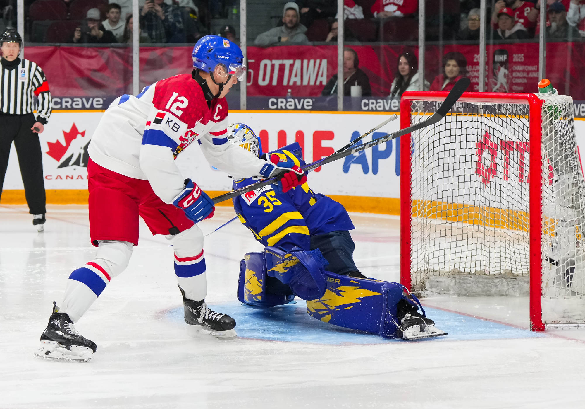 The Czechs struck back at 11:57 on the power play. Thelin had little chance as Petr Sikora one-timed home a great cross-ice feed from Adam Jecho.