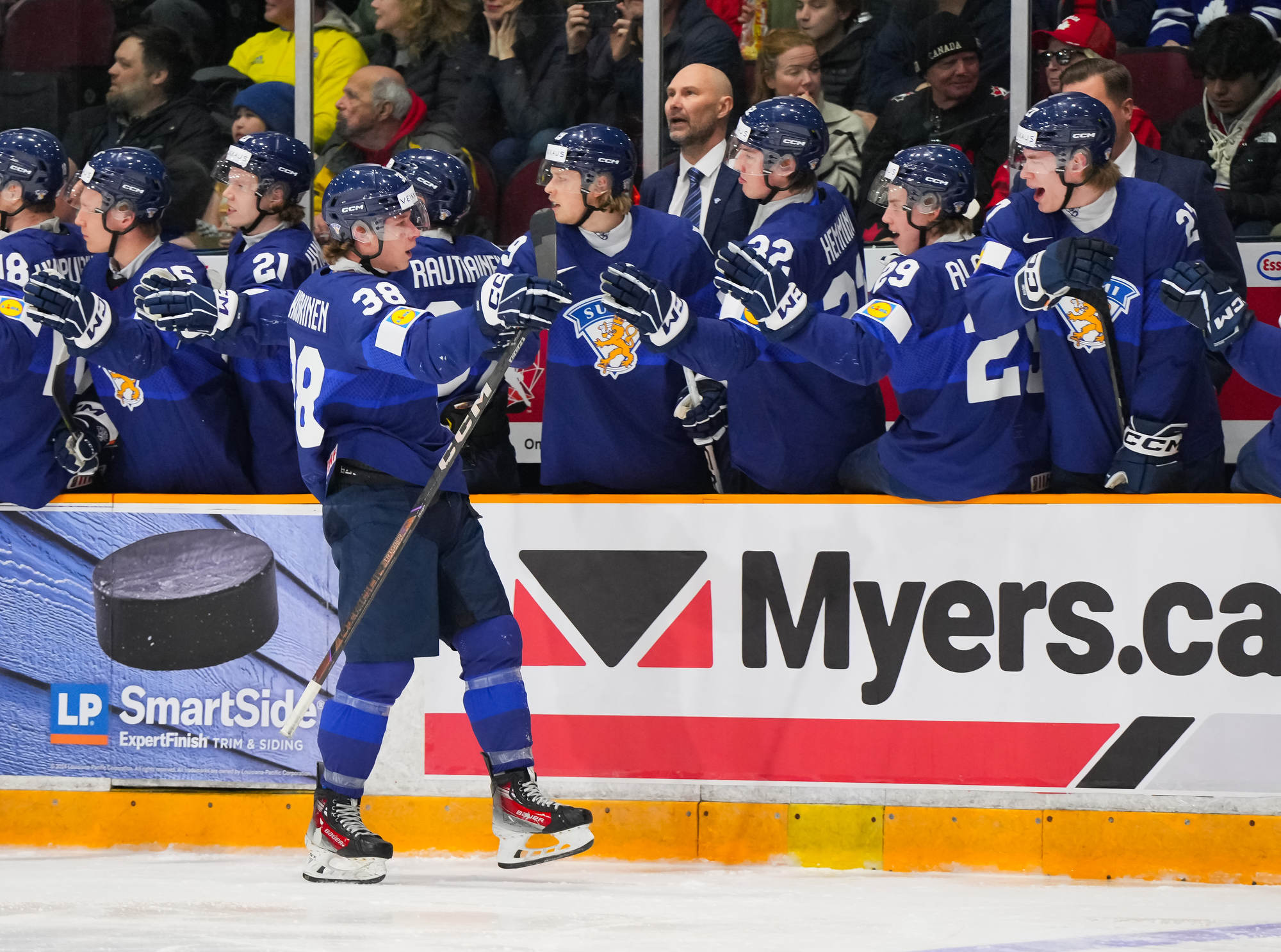 Jesse Nurmi celebrates at the Finnish bench during a 5-3 quarter-final victory over Slovakia at the 2025 IIHF World Junior Championship.