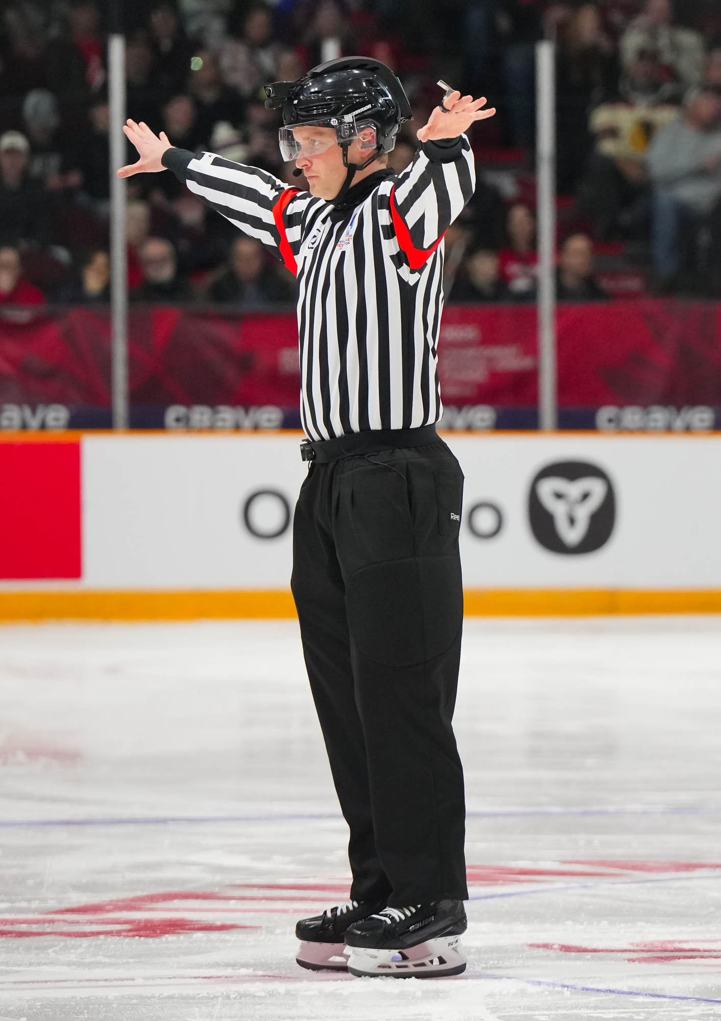 In the opening minute of the second period, Topias Hynninen barged to the net and Konsta Helenius's shot went in off his right skate. An unusual sequence ensued. After a video review, it was ruled a good goal. Fenes promptly challenged for goalie interference, and after another review, the officials waved off the goal.