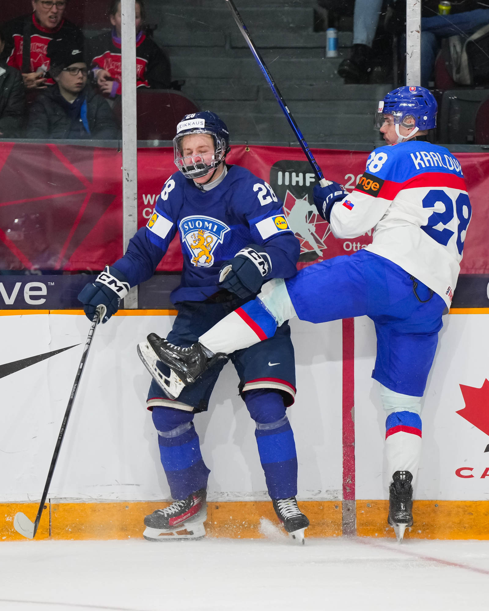 The Finns brought a physical game, too. Blueliner Emil Pieniniemi nailed Roman Kukumberg in the neutral zone. And at 3:54, Nurmi doubled Finland’s lead off the rush, taking a fine pass from Kiiskinen in the left faceoff circle and going high to the glove side.