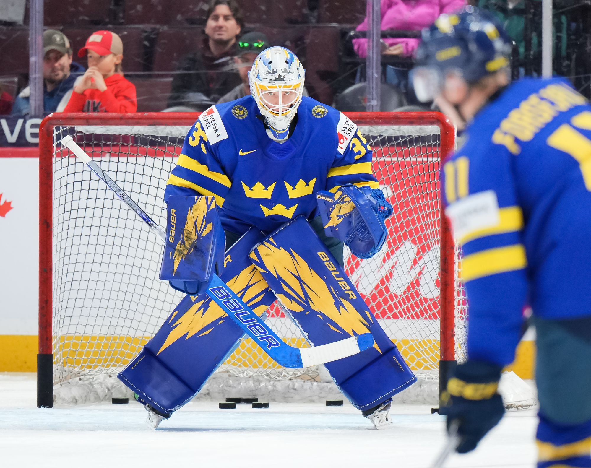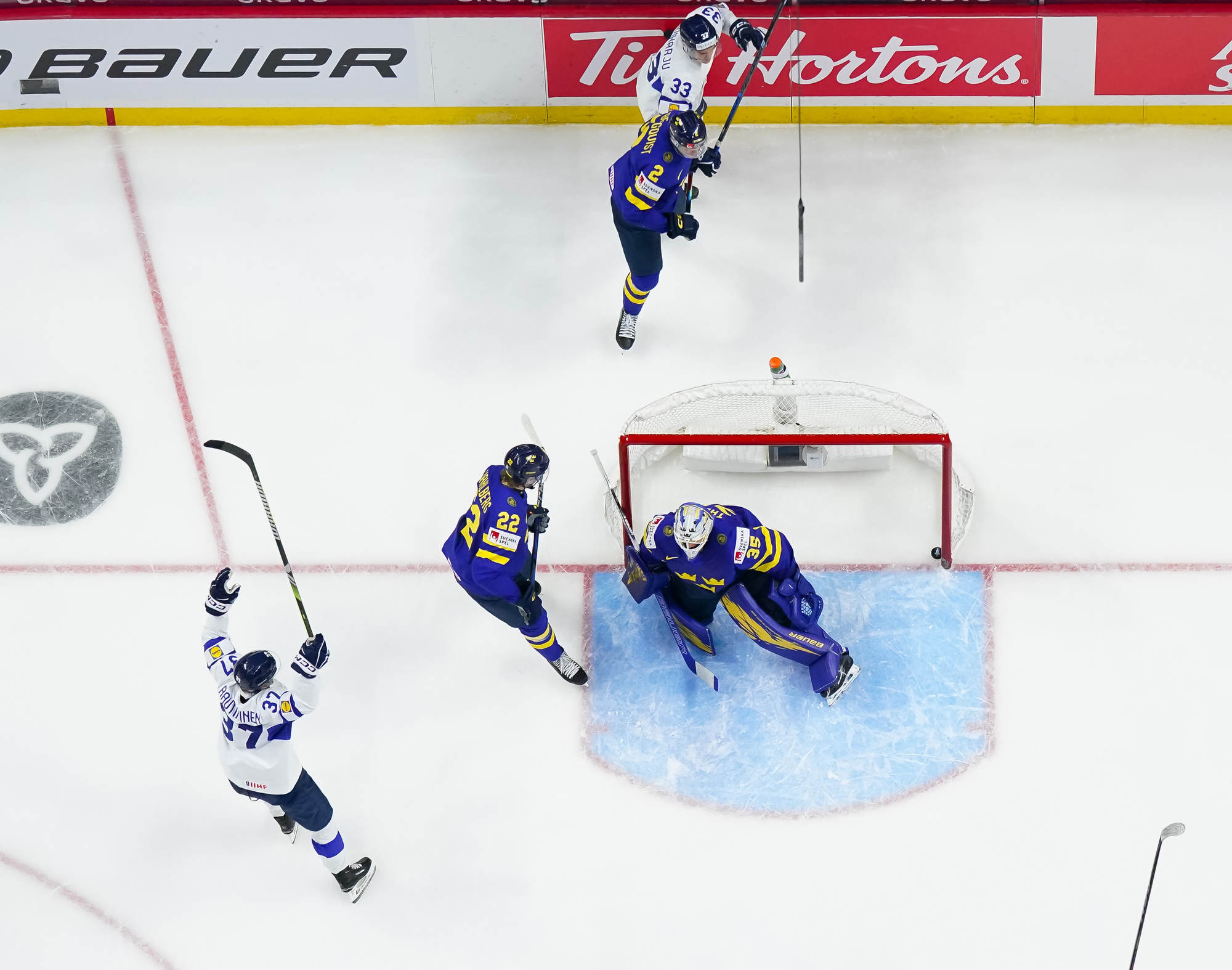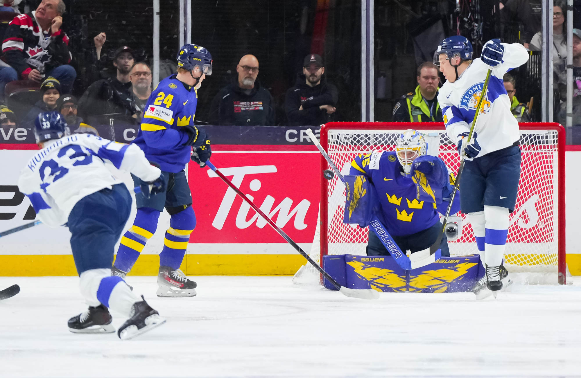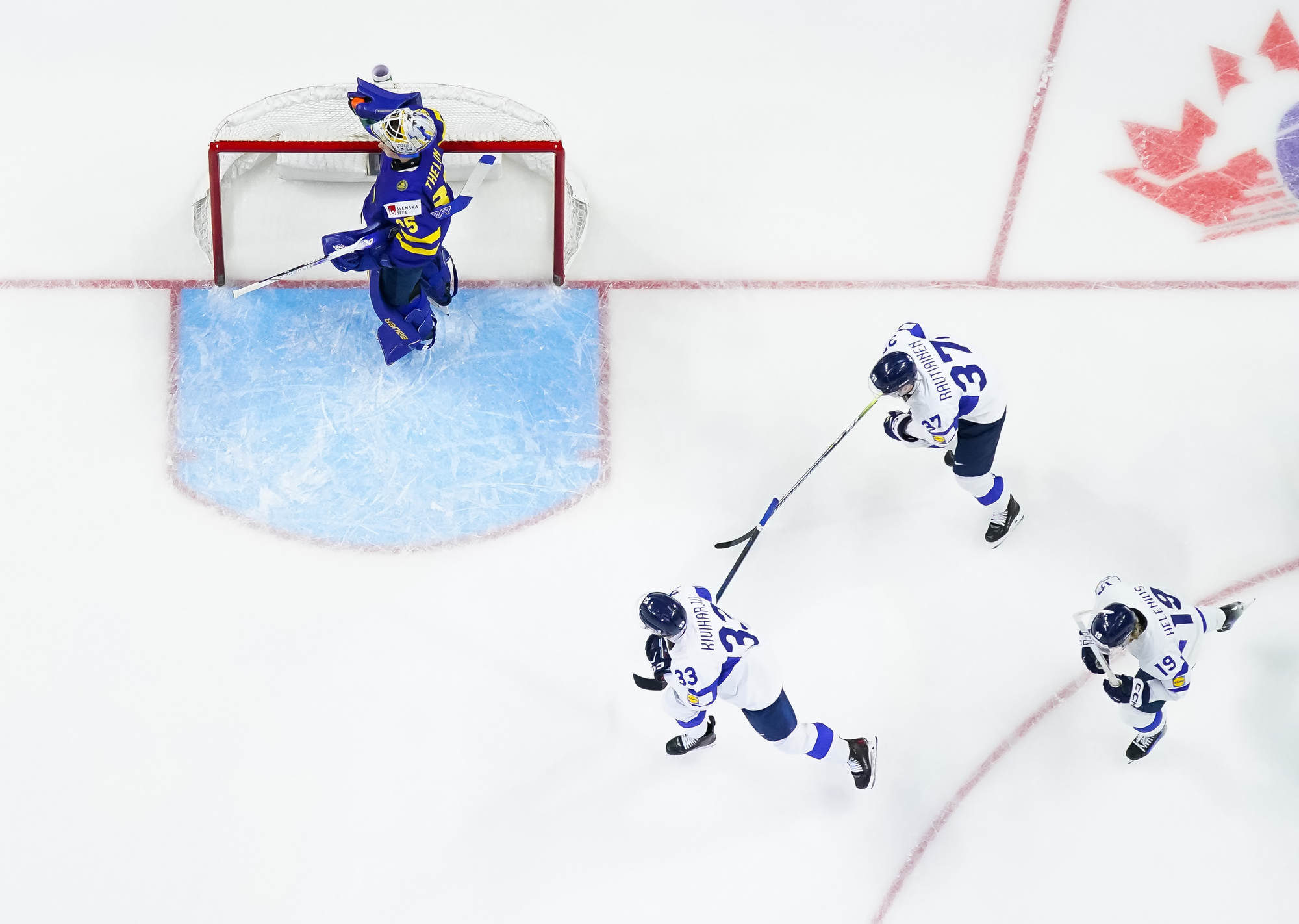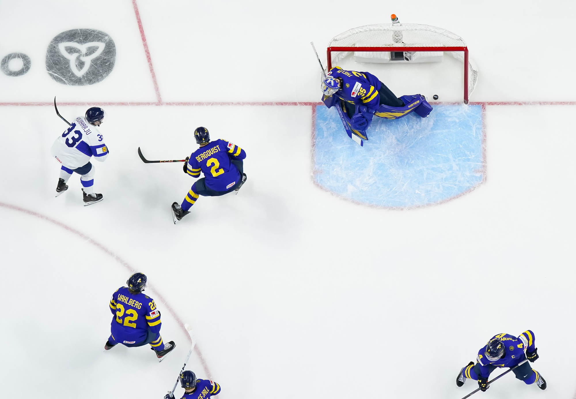 About four minutes later, Finnish captain Aron Kiviharju thought he'd put his team ahead when he sneaked a shot under Thelin's right pad, but following a coach's challenge from Sweden's Magnus Havelid, the play was video-reviewed and nullified due to an offside. Undaunted, the Finns kept buzzing around Thelin's net and the Bjorkloven netminder made a fine point-blank stop on Jesse Nurmi.
