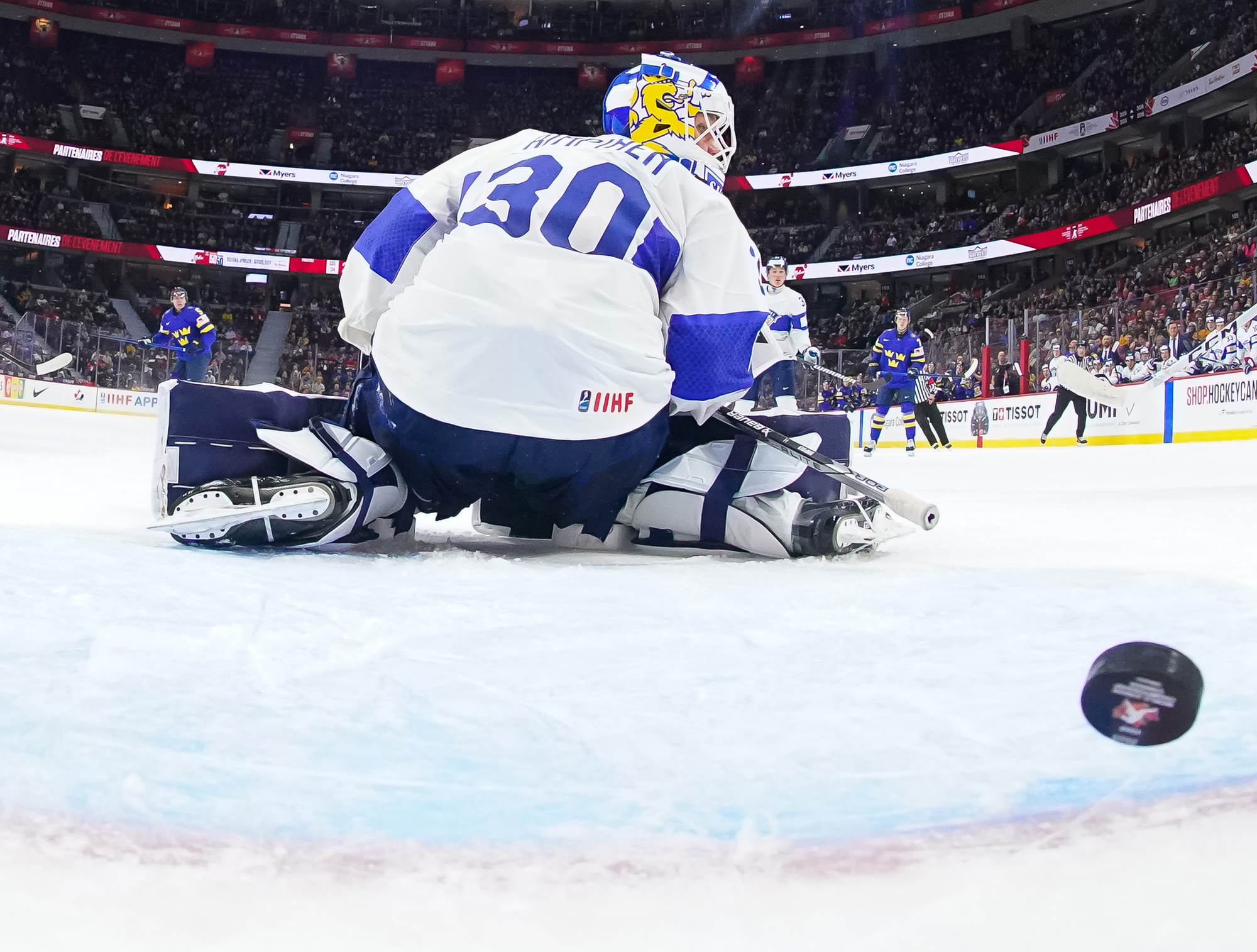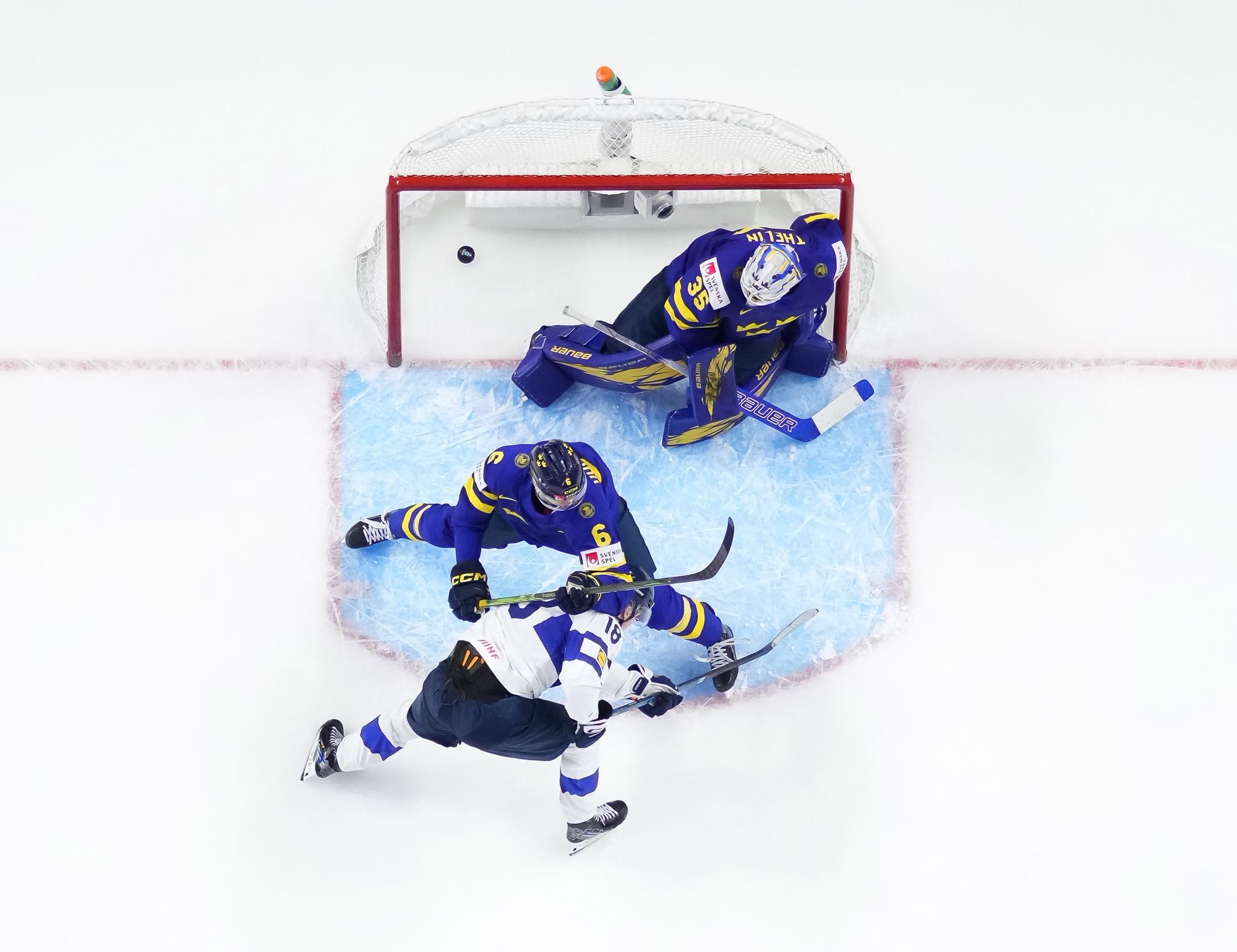 The Finns dominated the second period, but the Swedes came at their Nordic rivals even harder in the third period and most of overtime. Sweden outshot Finland 46-35. Finnish starting goalie Petteri Rimpinen excelled to win his duel with Thelin.