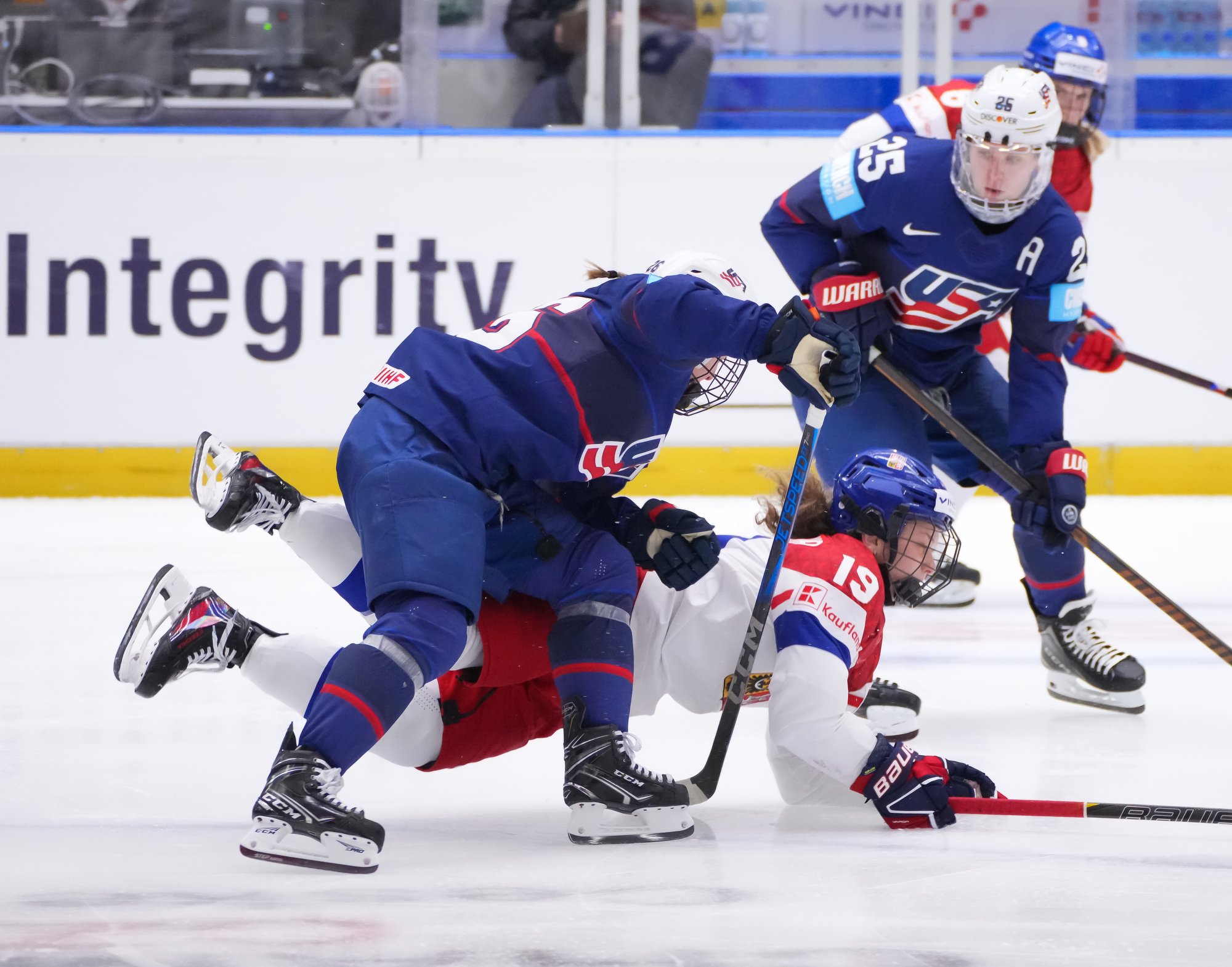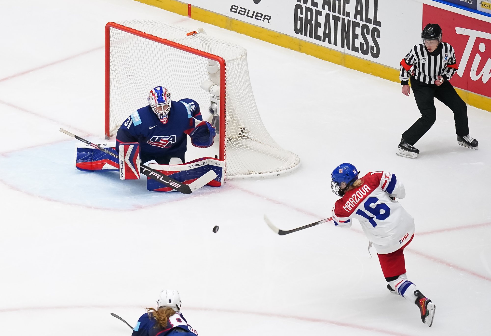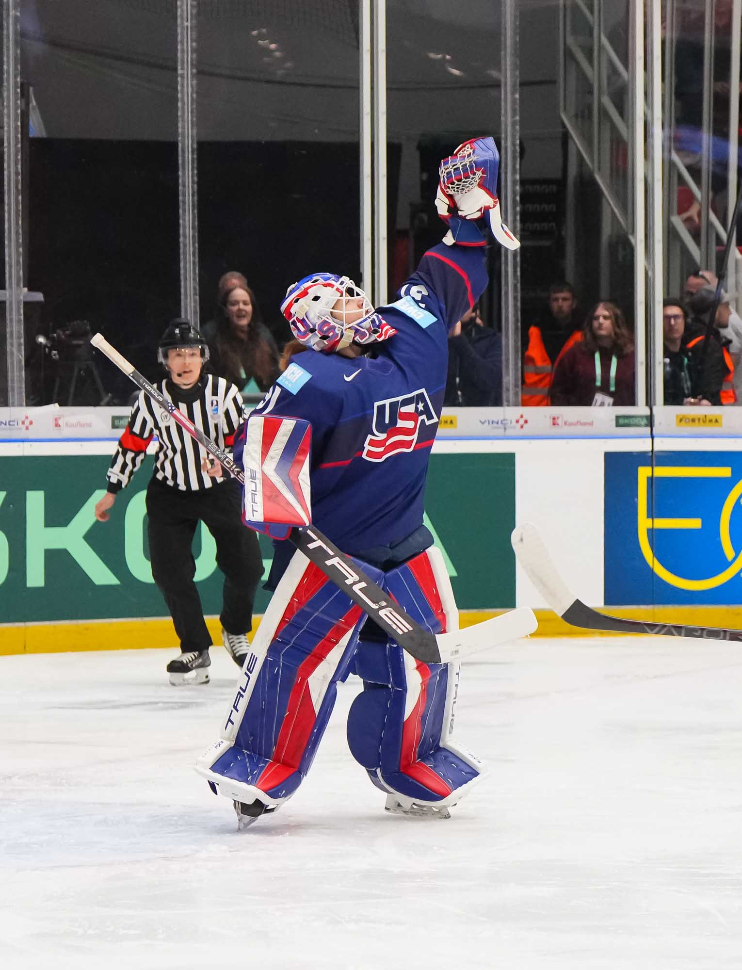 But if the final outcome was expected, the game was anything but routine. Czechia fought like Lionesses, hassling and harrying the Americans at every turn. A huge defensive effort, with total buy-in from every player, was augmented by courage on the counterattack to pose a huge test for the USA. Having previously lost 1-7 and 1-9 in World Championship semi-finals, here the Czechs played with an empty net in search of a tying goal.