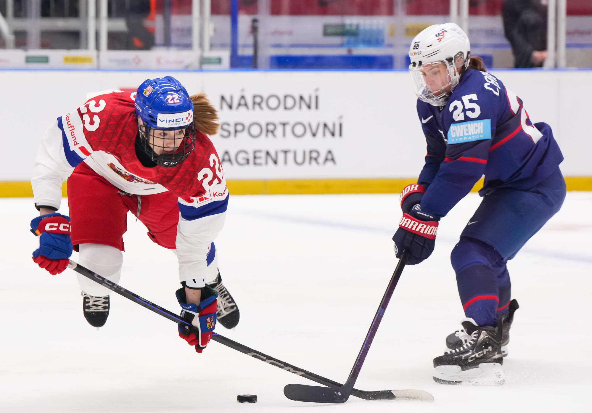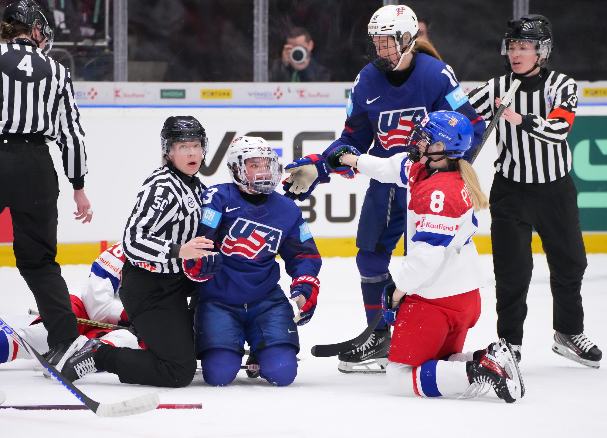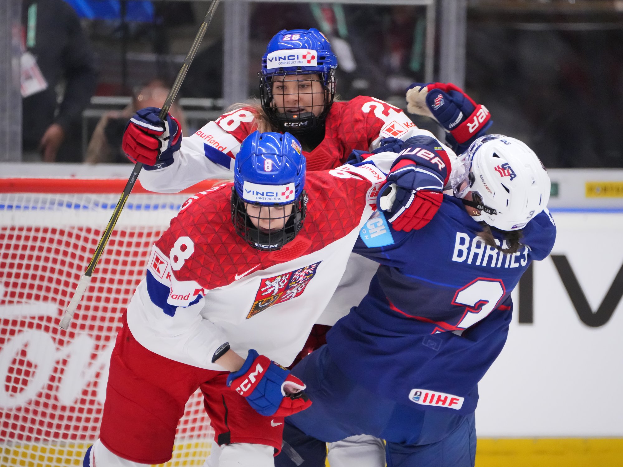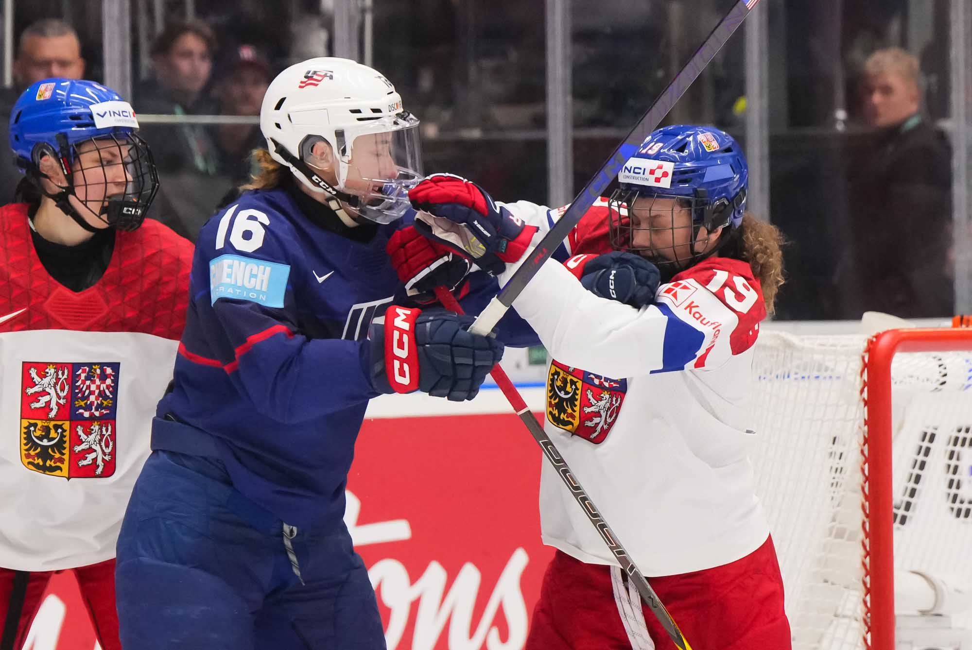 Early on, the first significant attacking foray from the host nation saw Cayla Barnes react angrily Adela Sapovalilova after first significant Czech foray. Then Czechia got the first power play of the game when Hayley Scamurra sat for holding. The PP came to little, but it was a reminder that a fired-up Czech team was not here to make up the numbers.