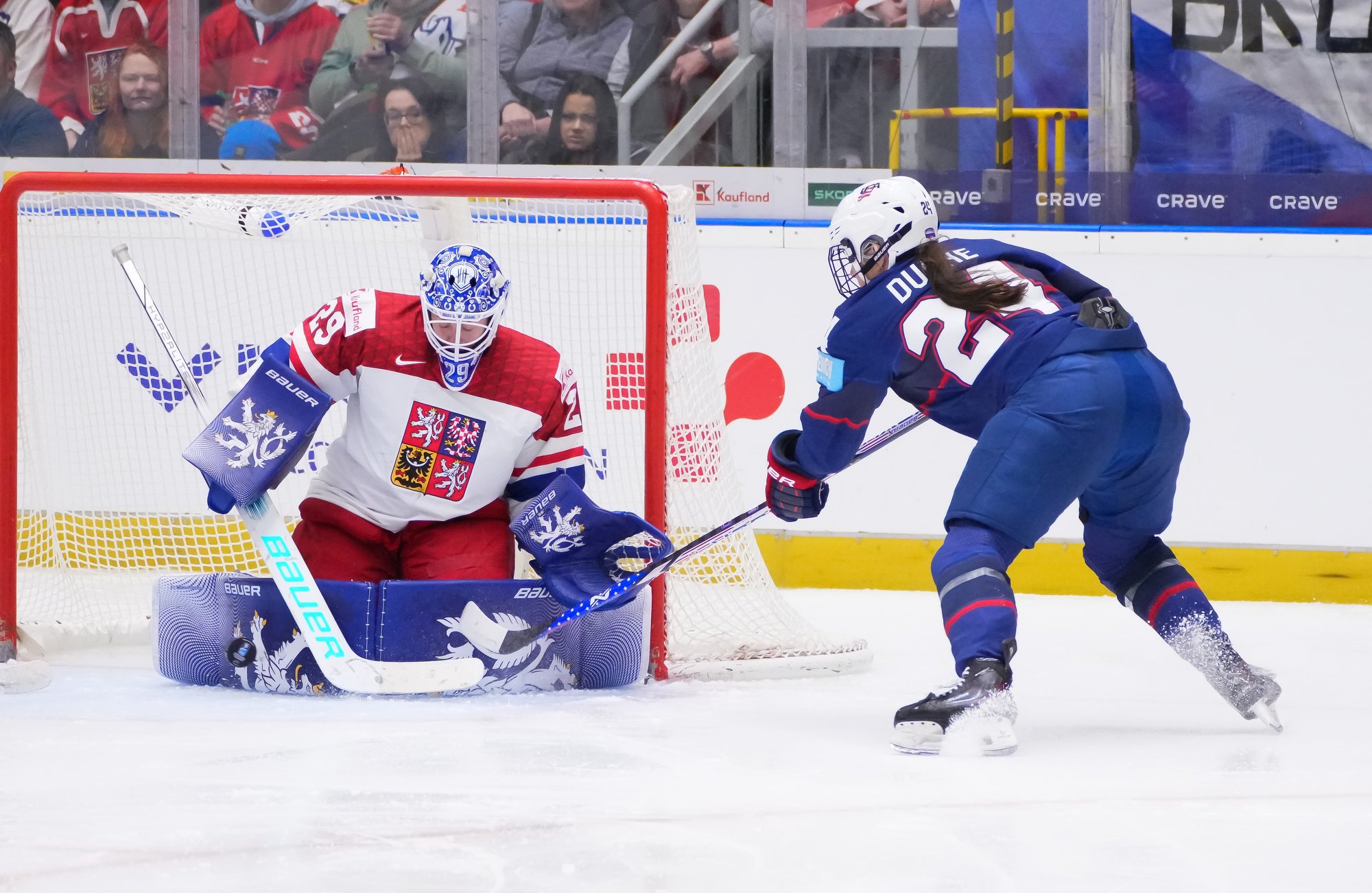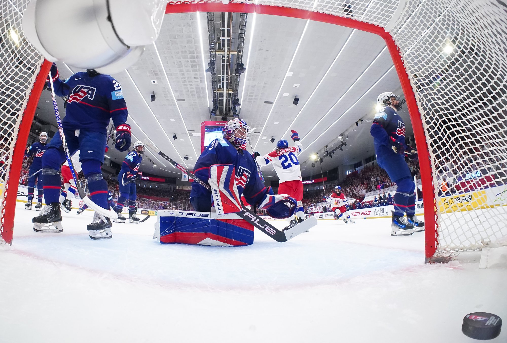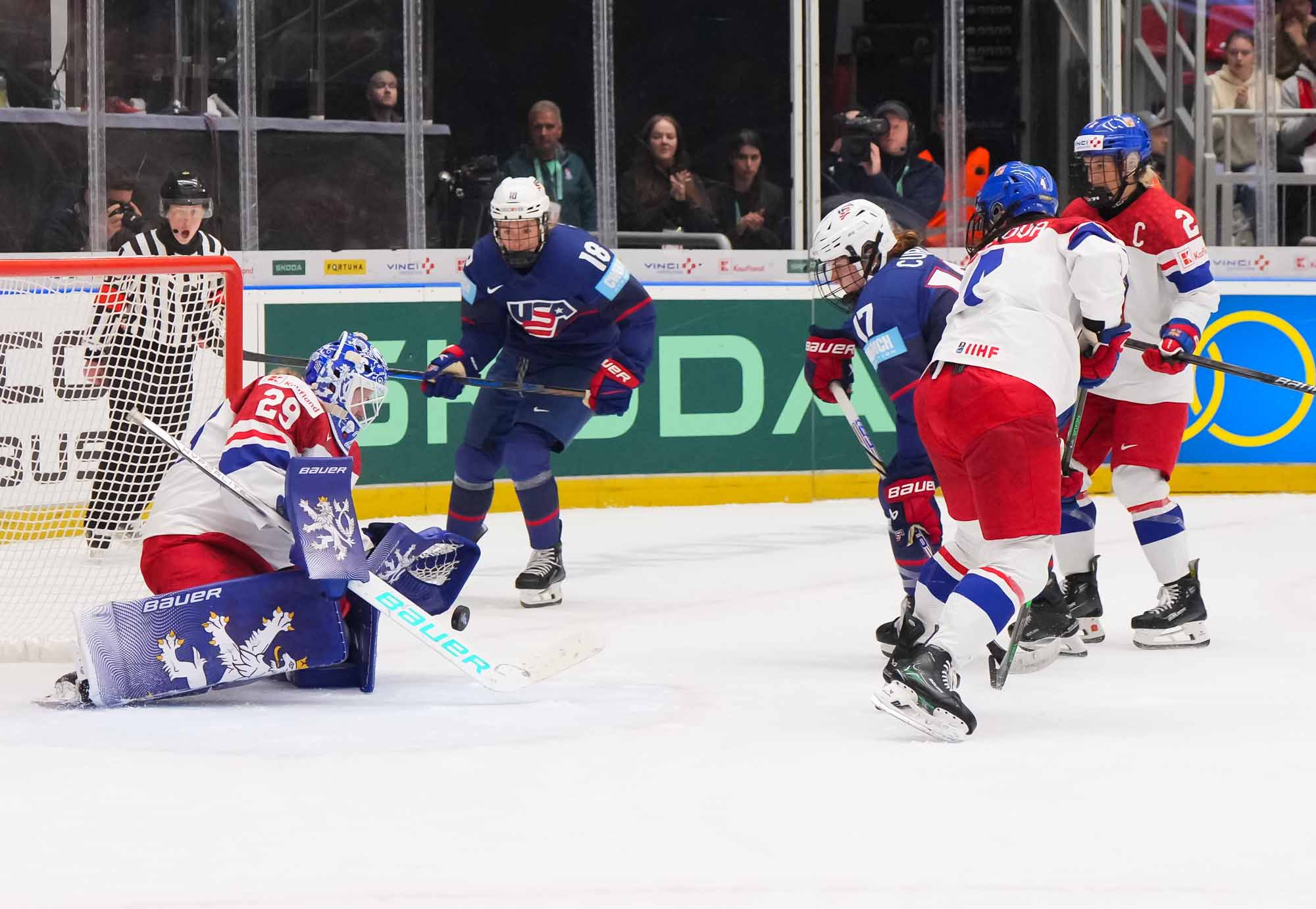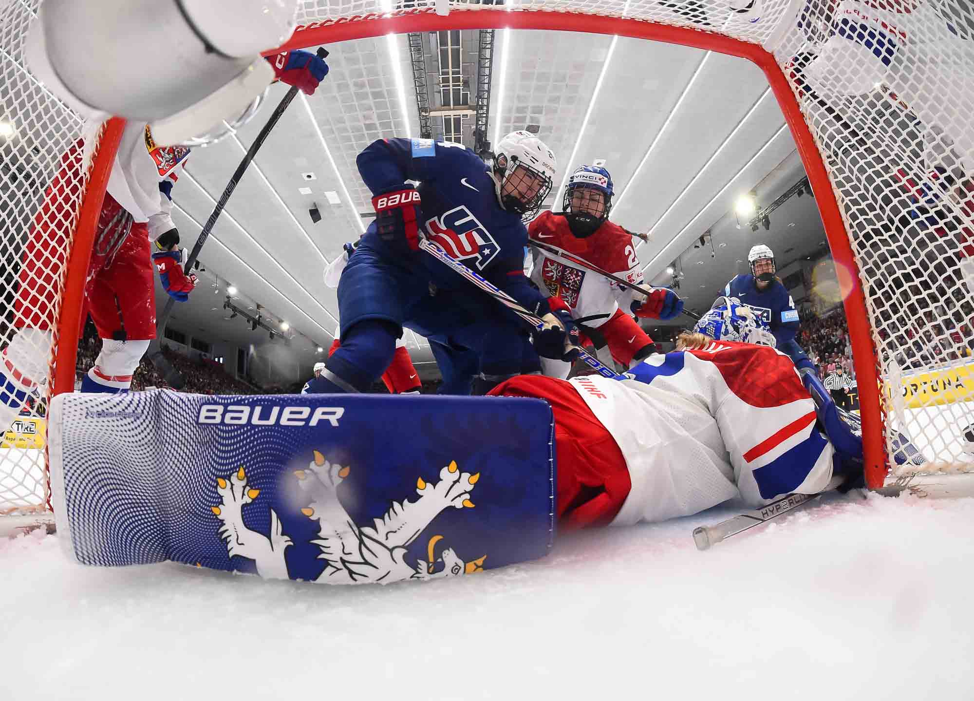 And in the 16th minute the noise hit a new level when Czechia took a sensational lead. Klara Hymlarova’s persistence got the puck from Savannah Harmon behind the U.S. net. In front, Plosova took an age to bring it under control and the chance seemed to be gone – until she found the perfect finish as Lacey Eden’s desperate slide arrived too late to make the block.