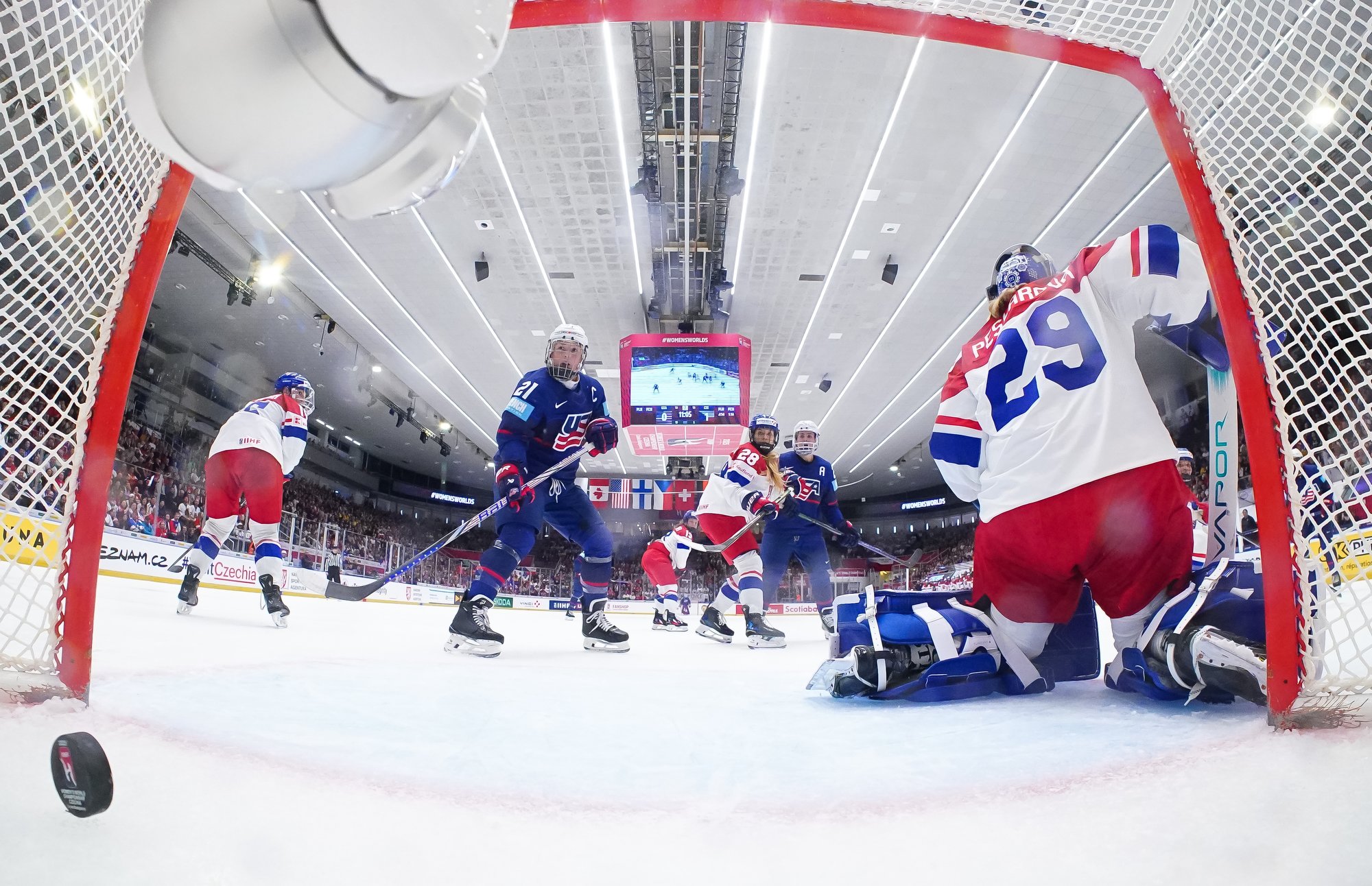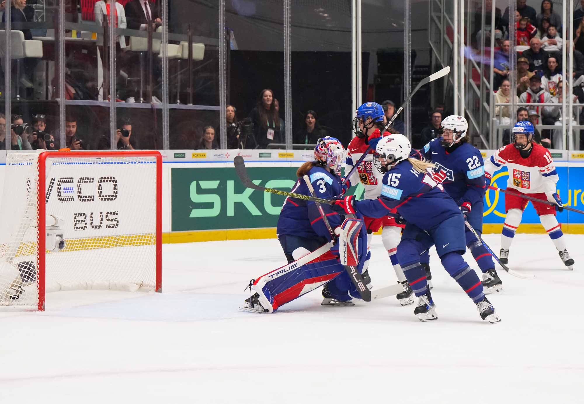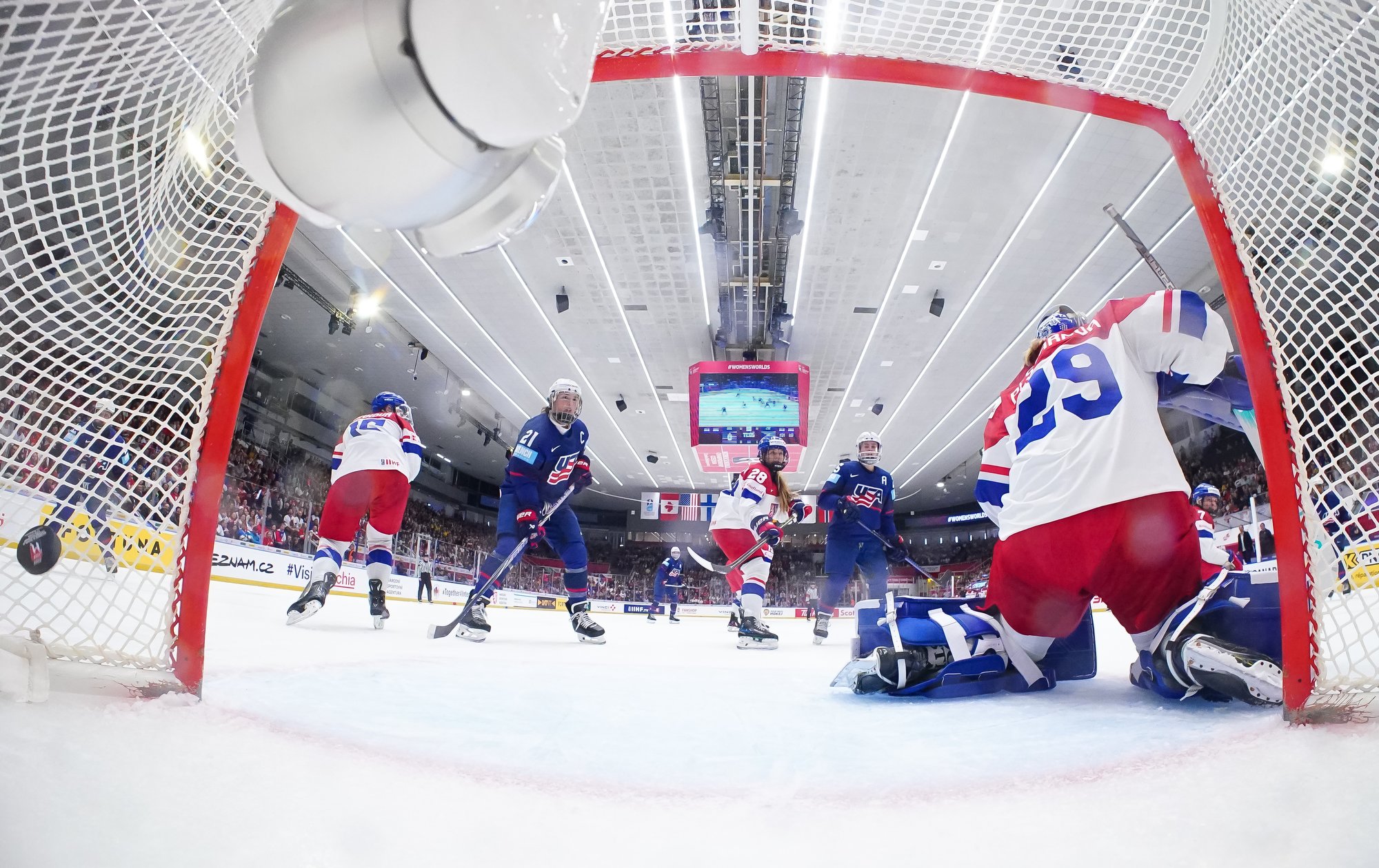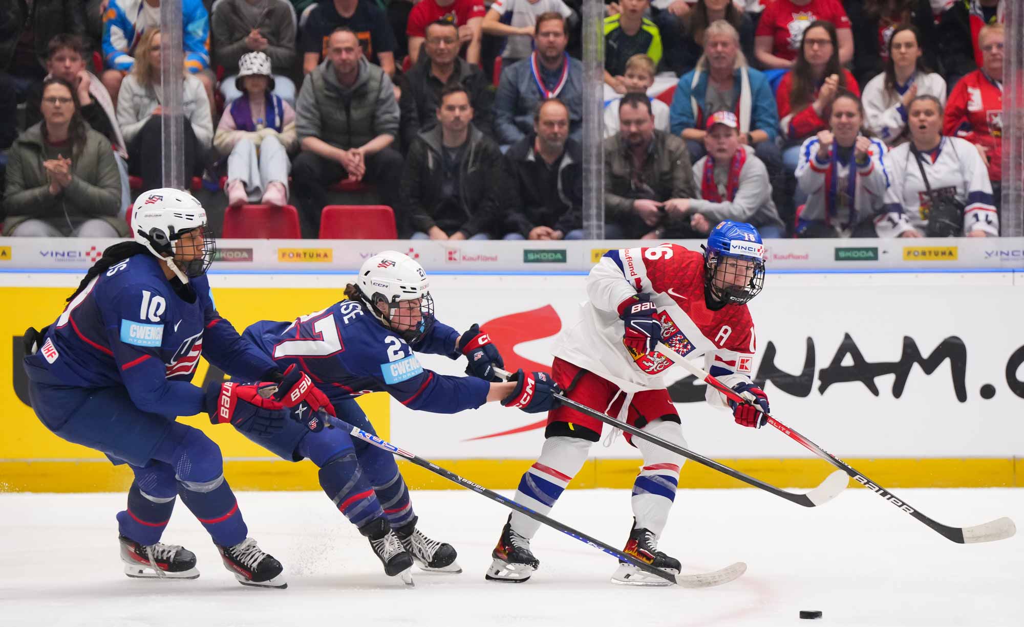And in the 16th minute the noise hit a new level when Czechia took a sensational lead. Klara Hymlarova’s persistence got the puck from Savannah Harmon behind the U.S. net. In front, Plosova took an age to bring it under control and the chance seemed to be gone – until she found the perfect finish as Lacey Eden’s desperate slide arrived too late to make the block.
