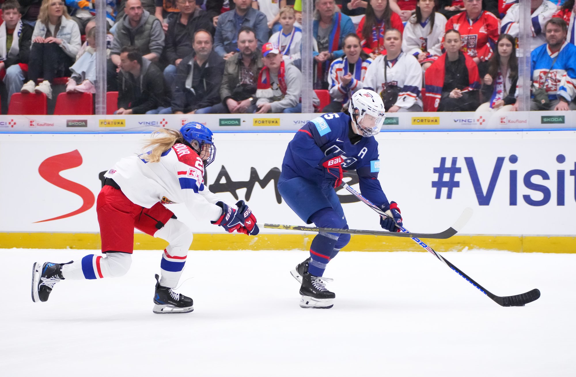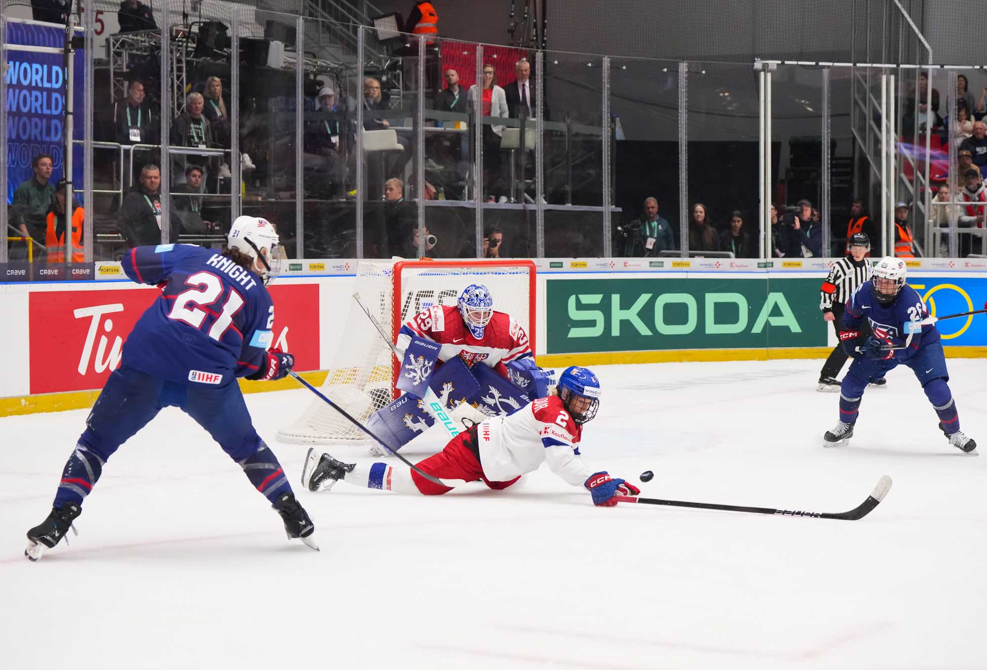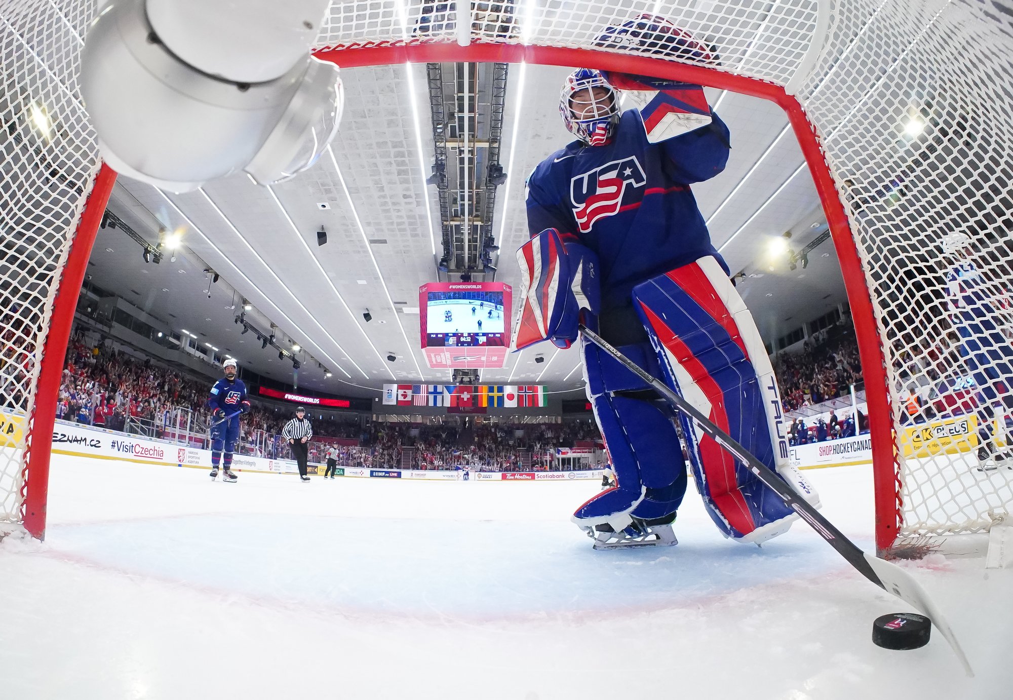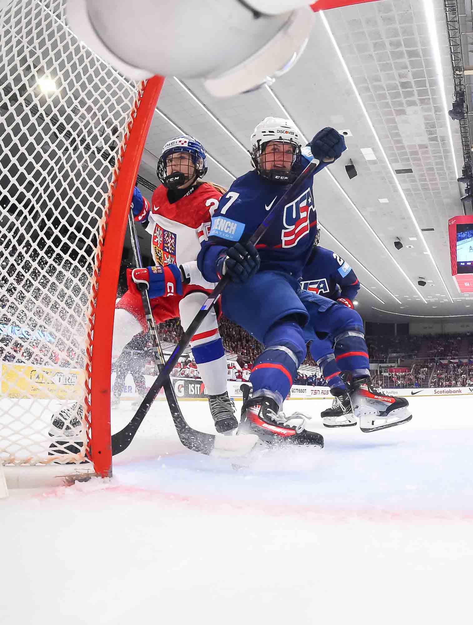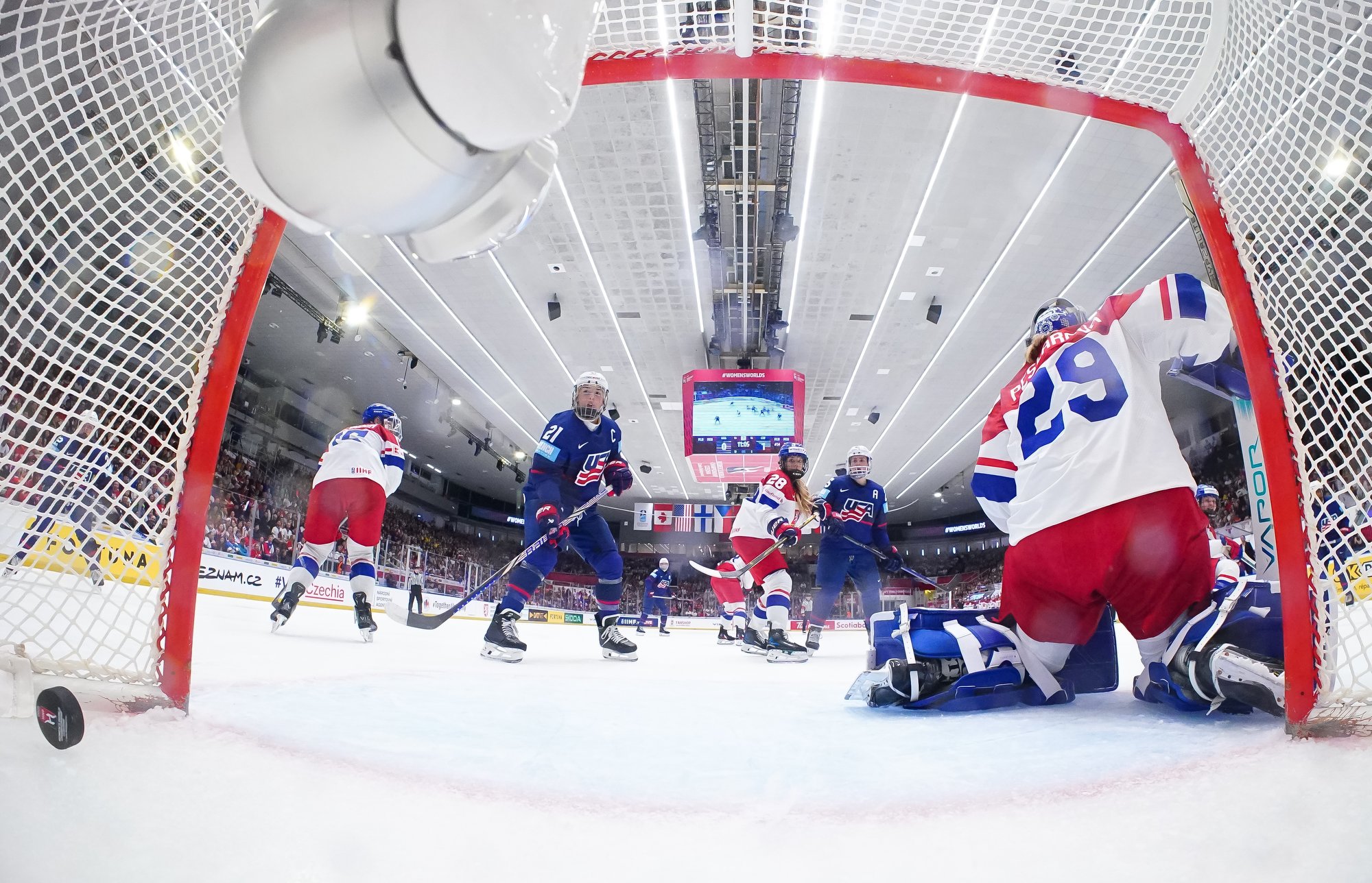 And in the 16th minute the noise hit a new level when Czechia took a sensational lead. Klara Hymlarova’s persistence got the puck from Savannah Harmon behind the U.S. net. In front, Plosova took an age to bring it under control and the chance seemed to be gone – until she found the perfect finish as Lacey Eden’s desperate slide arrived too late to make the block.