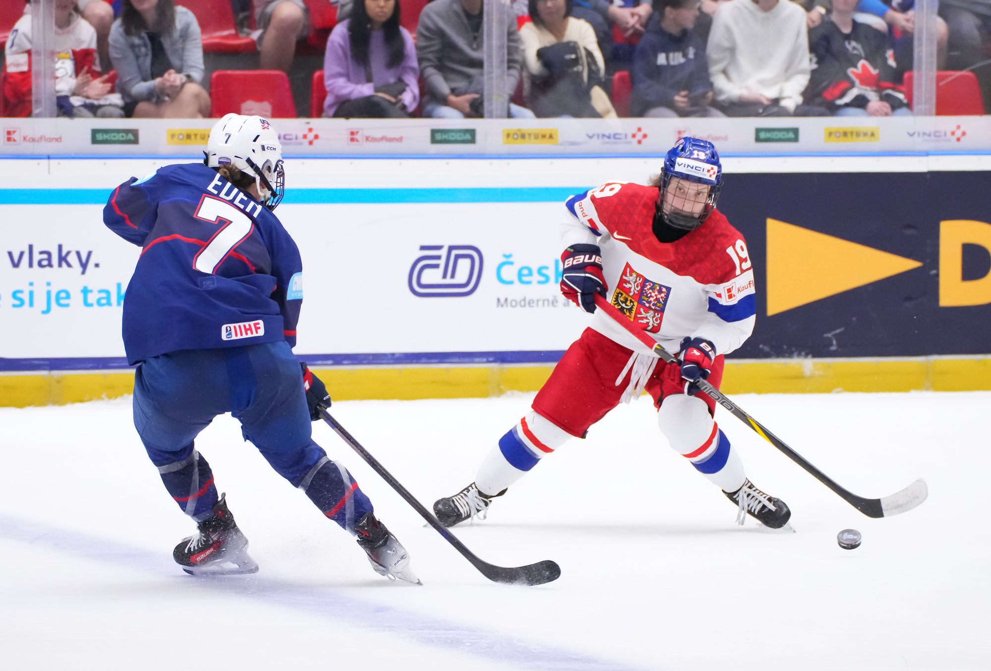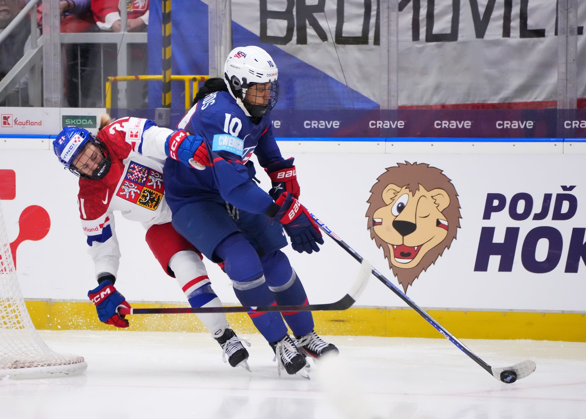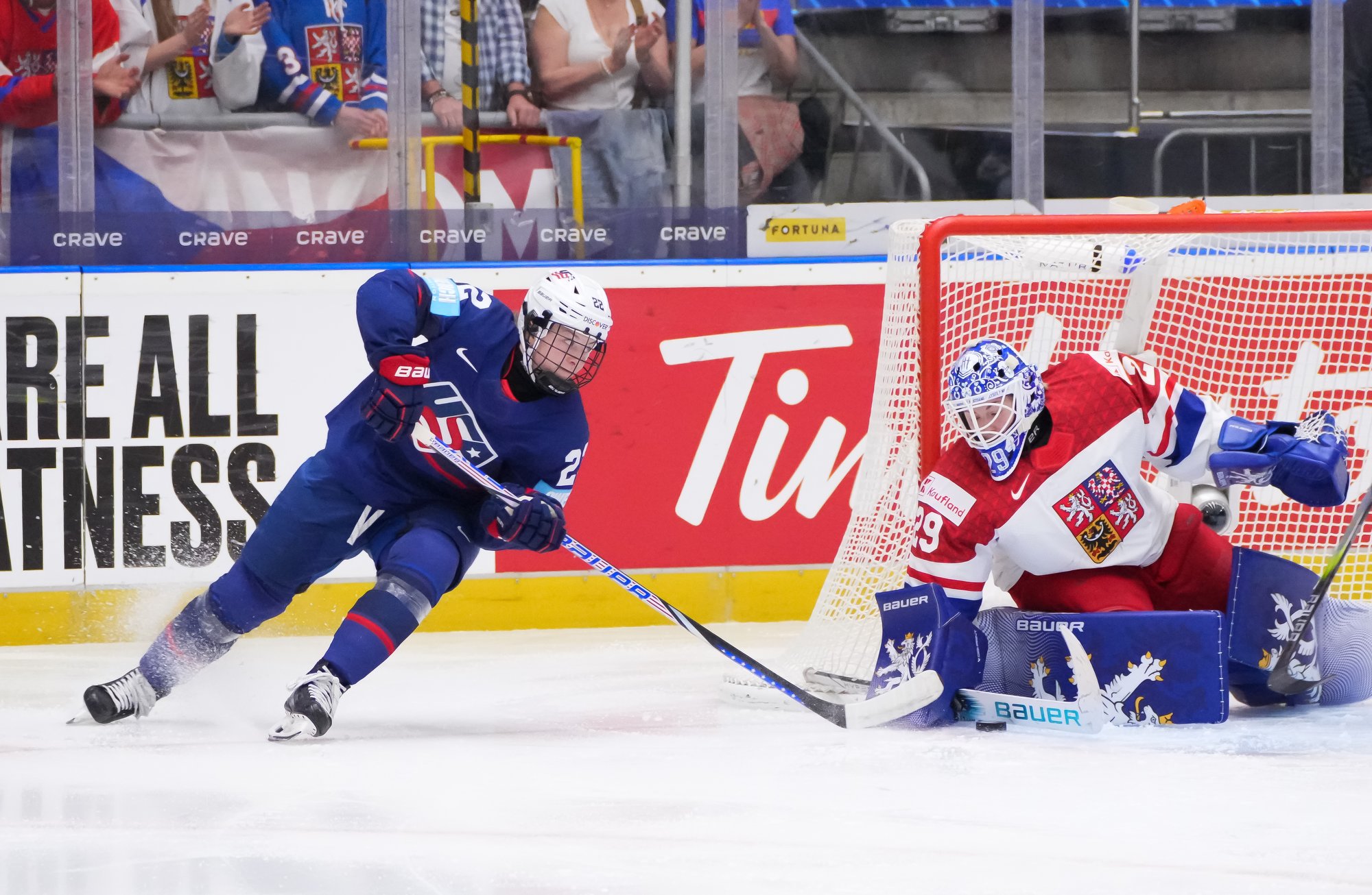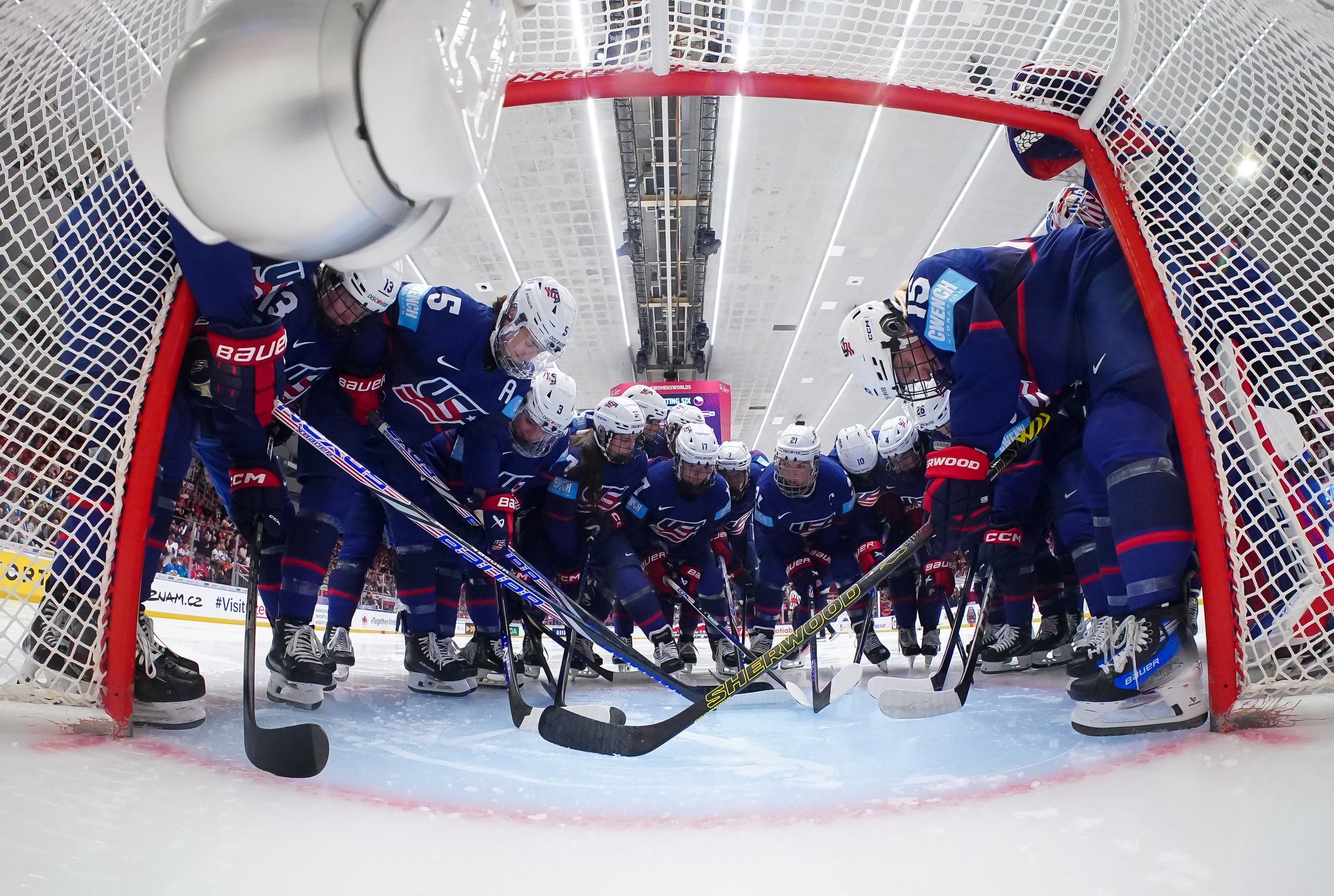 And in the 16th minute the noise hit a new level when Czechia took a sensational lead. Klara Hymlarova’s persistence got the puck from Savannah Harmon behind the U.S. net. In front, Plosova took an age to bring it under control and the chance seemed to be gone – until she found the perfect finish as Lacey Eden’s desperate slide arrived too late to make the block.