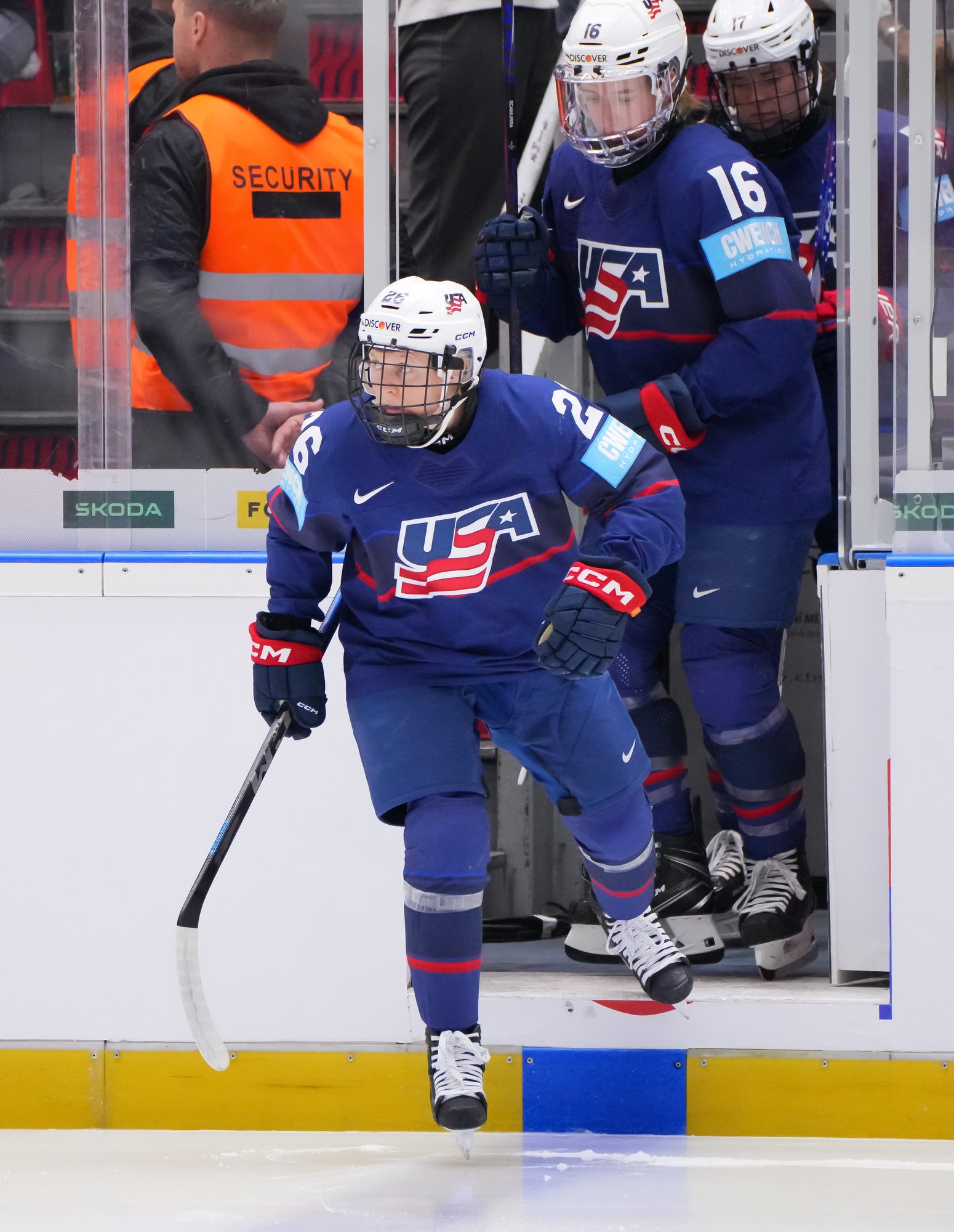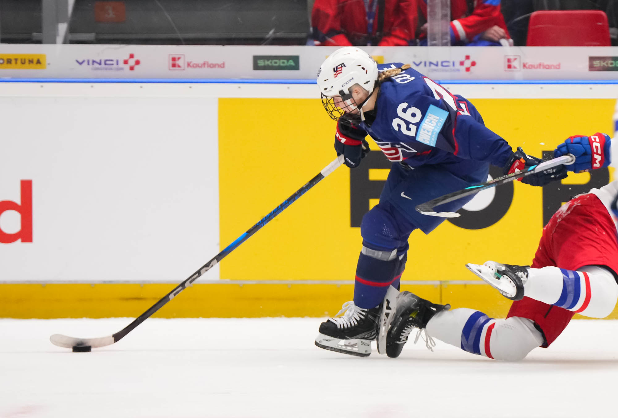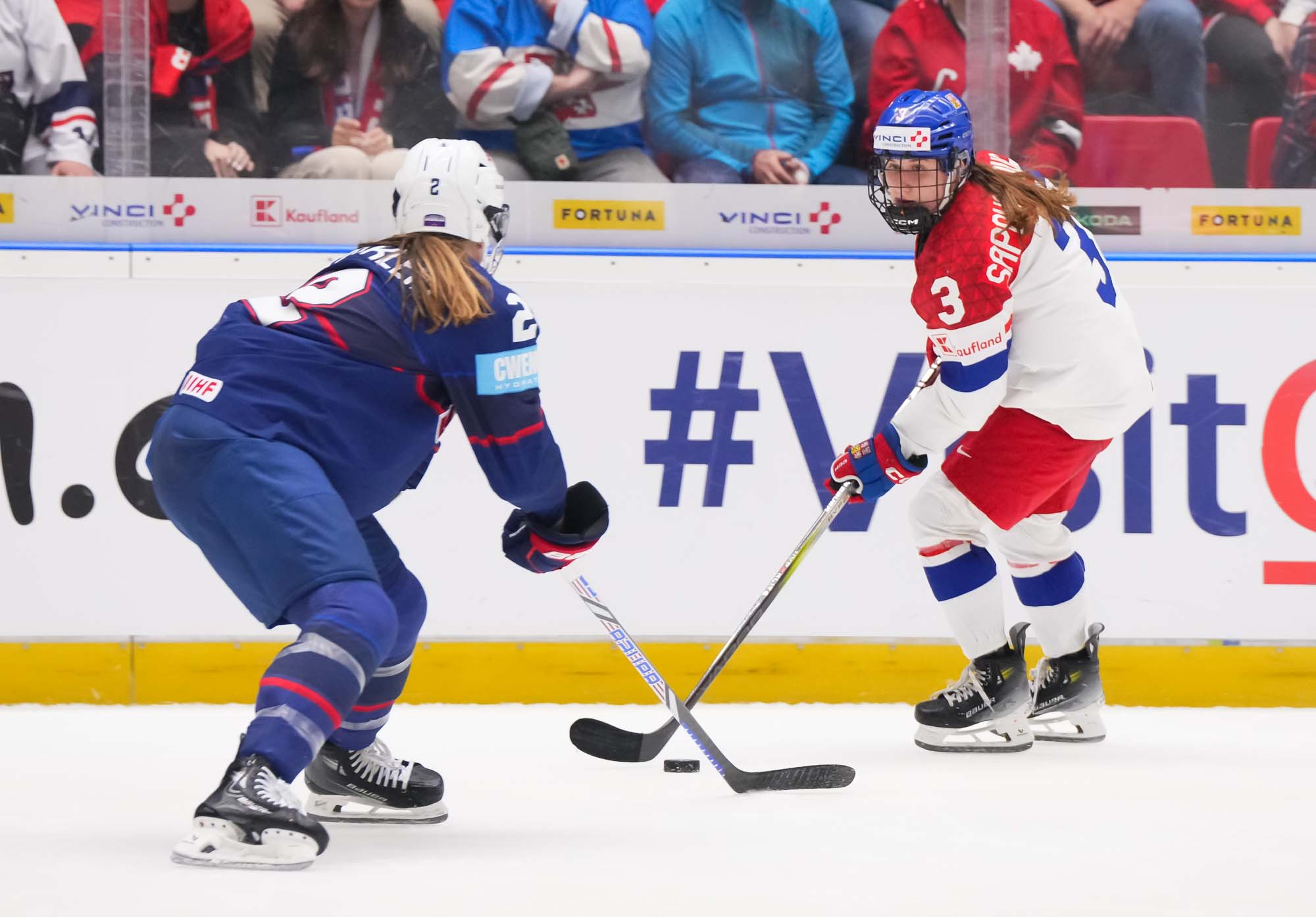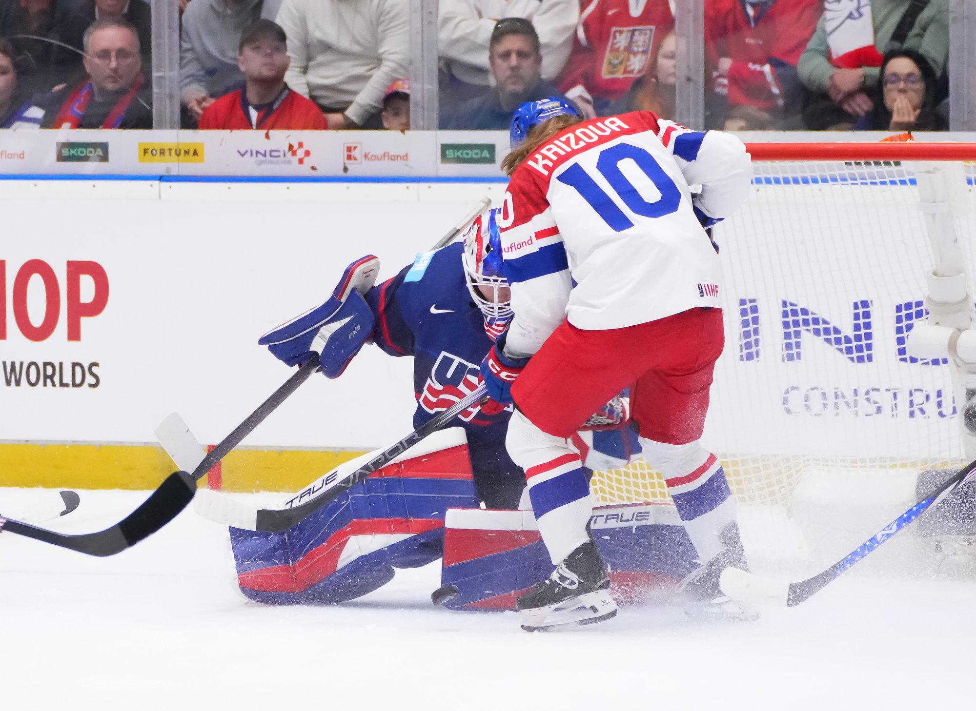 And in the 16th minute the noise hit a new level when Czechia took a sensational lead. Klara Hymlarova’s persistence got the puck from Savannah Harmon behind the U.S. net. In front, Plosova took an age to bring it under control and the chance seemed to be gone – until she found the perfect finish as Lacey Eden’s desperate slide arrived too late to make the block.