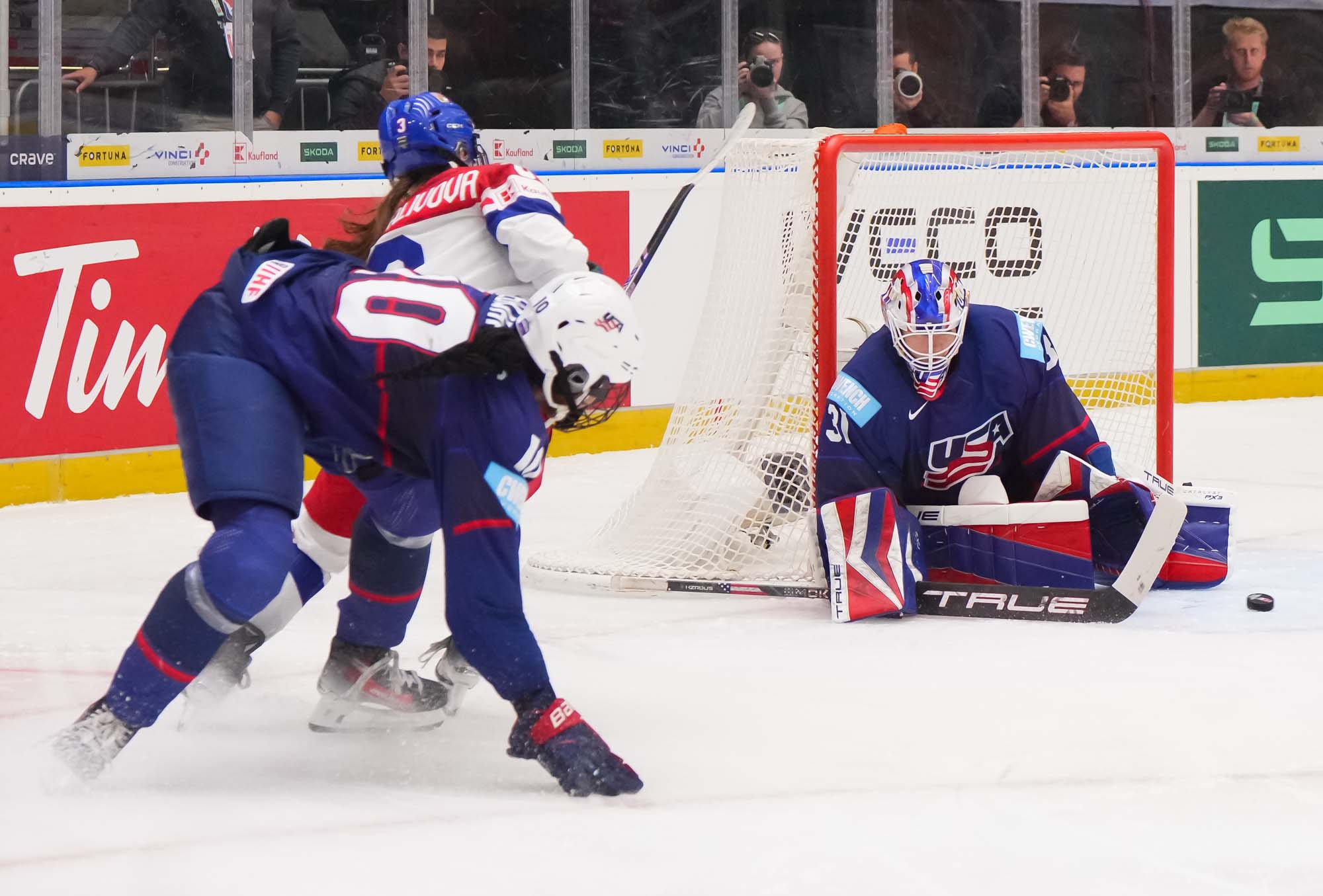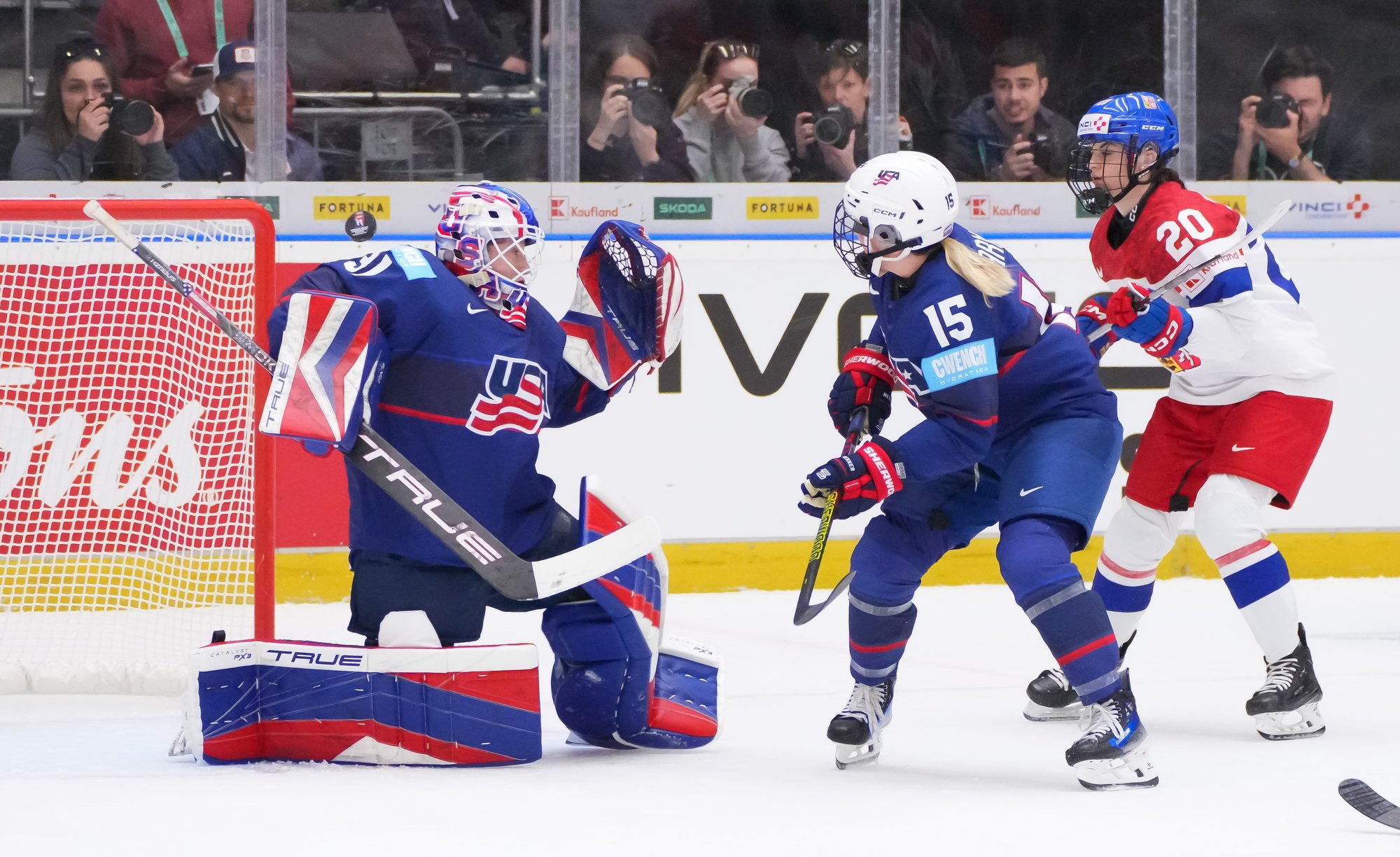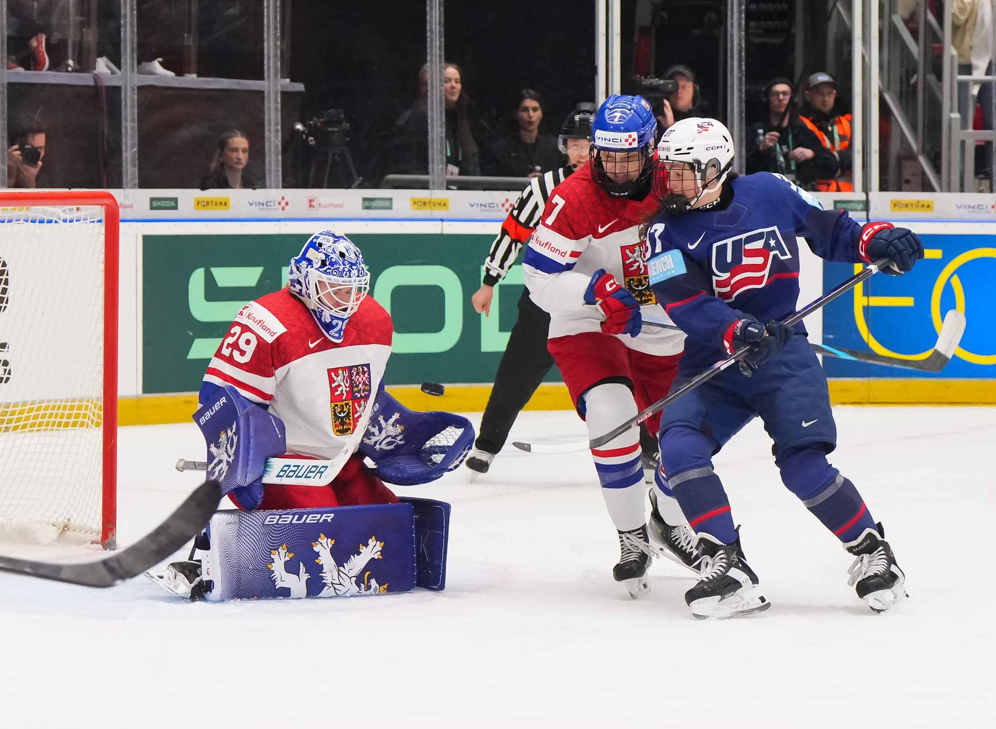 Czech goalie Klara Peslarova makes another save as USA forward Abbey Murphy and Czech defender Klara Seroizskova jockey for position in front of the net.