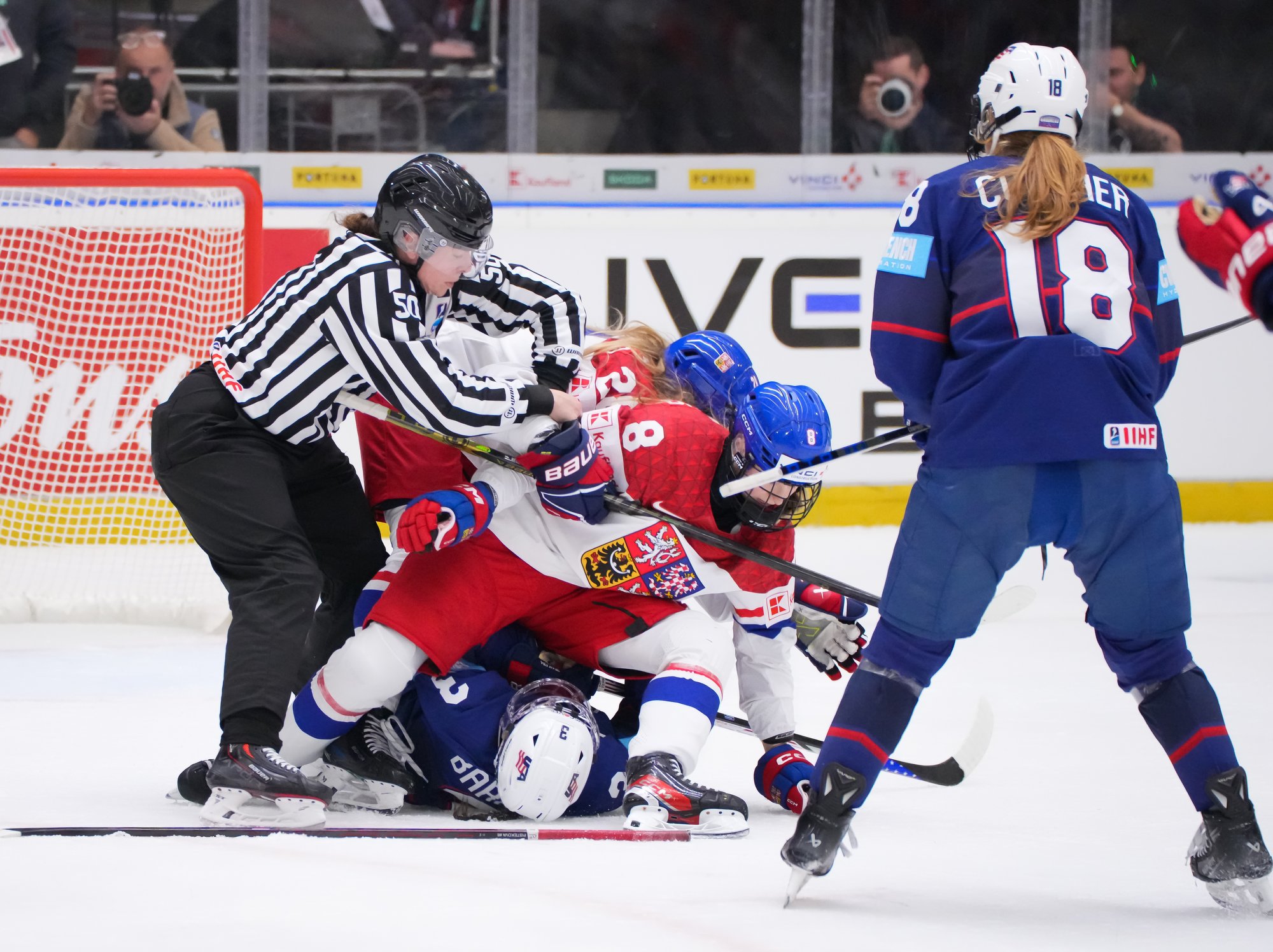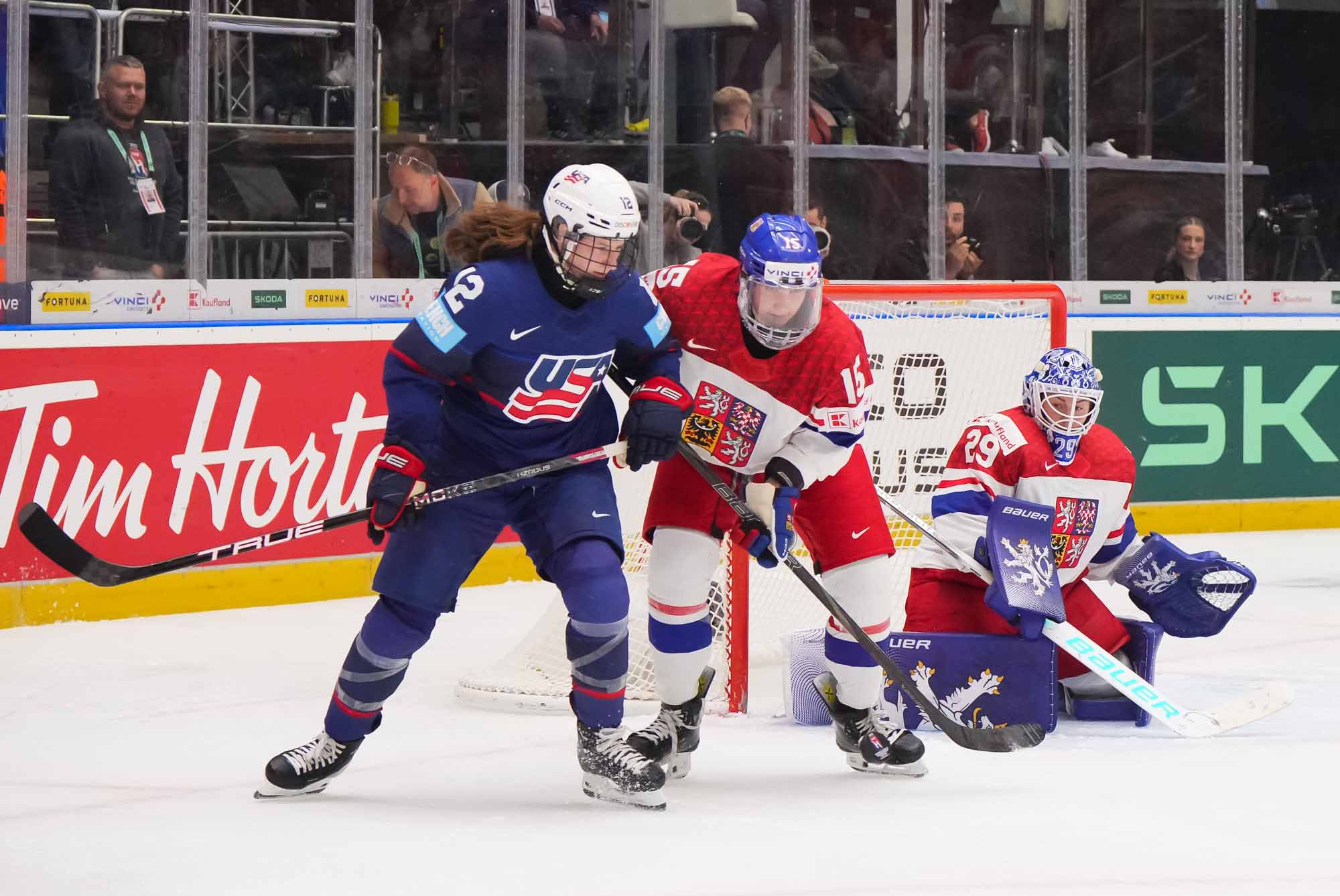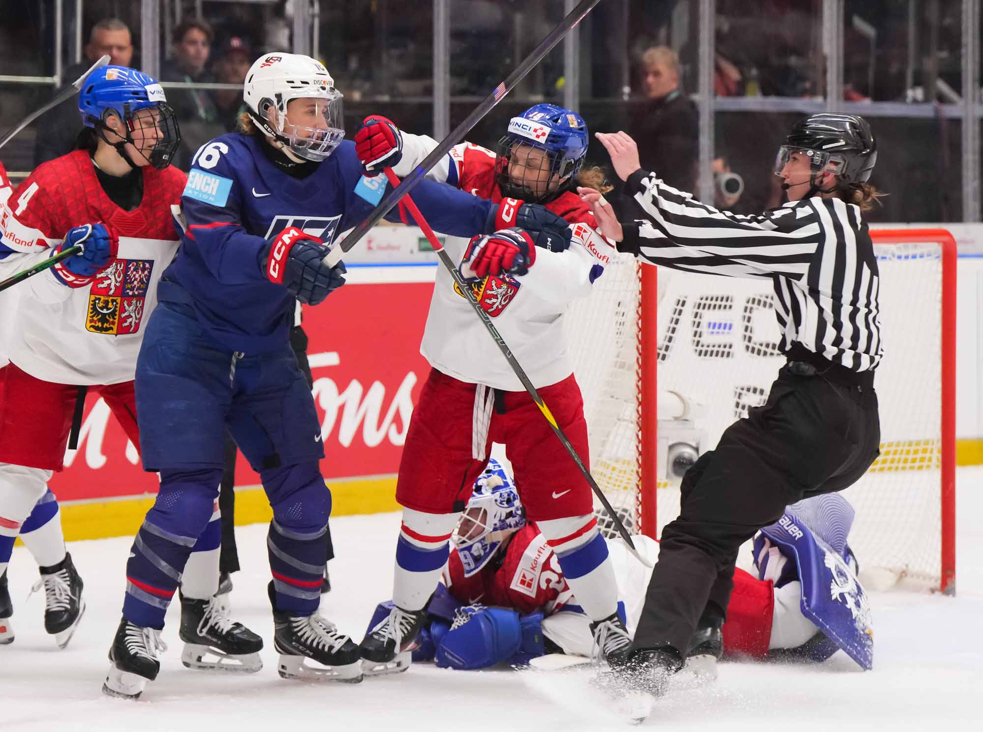 Czech goalie Klara Peslarova makes another save as USA forward Abbey Murphy and Czech defender Klara Seroizskova jockey for position in front of the net.